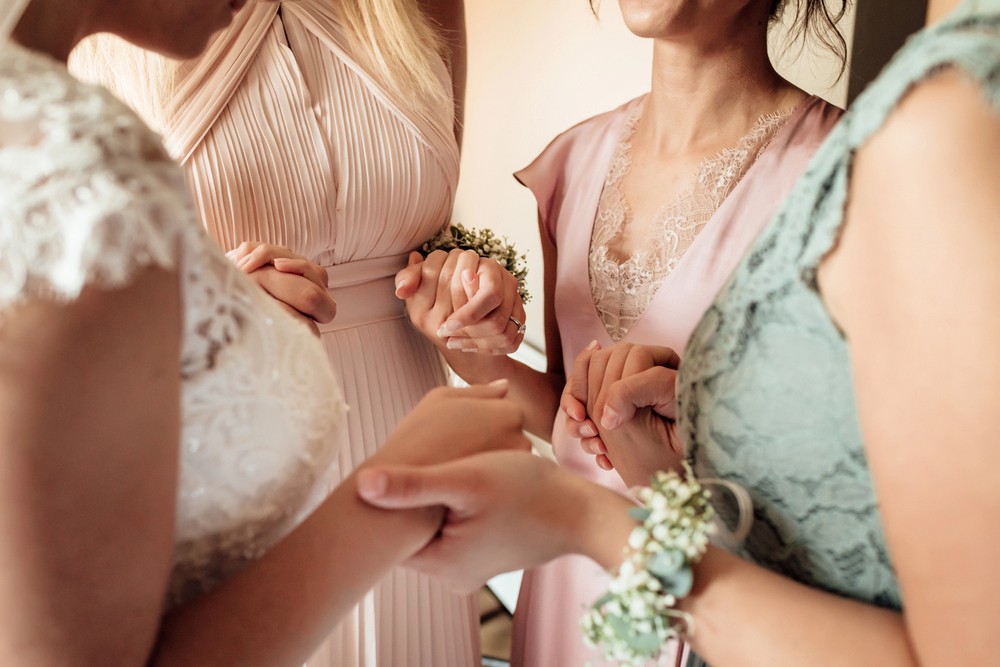 The bride with her bridesmaids, sharing joy and excitement