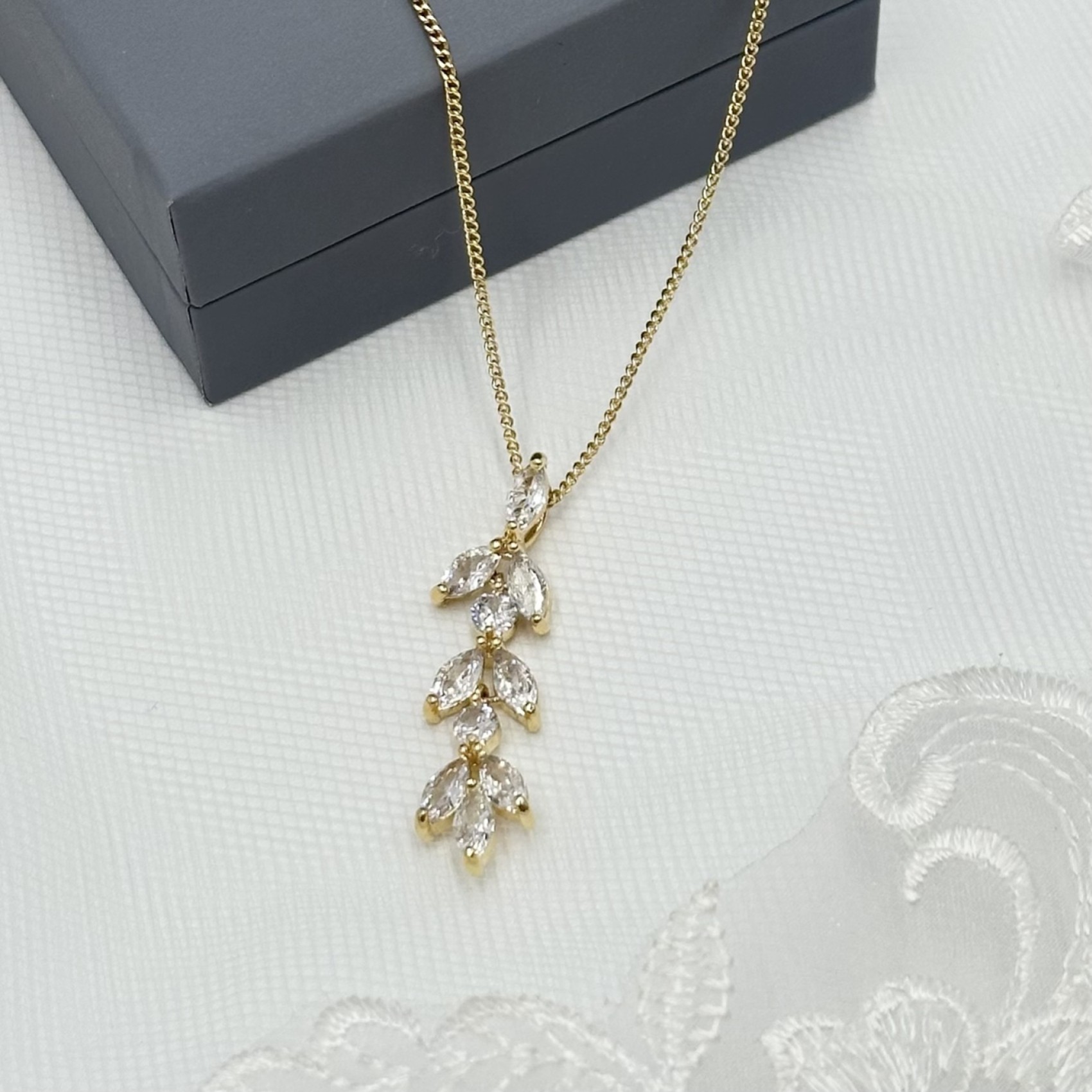 Sparkling leaf-like cubic zirconia crystals suspend from a delicate rhodium plated chain in this beautiful bridal pendant. A gorgeous wedding necklace for brides and bridesmaid alike.