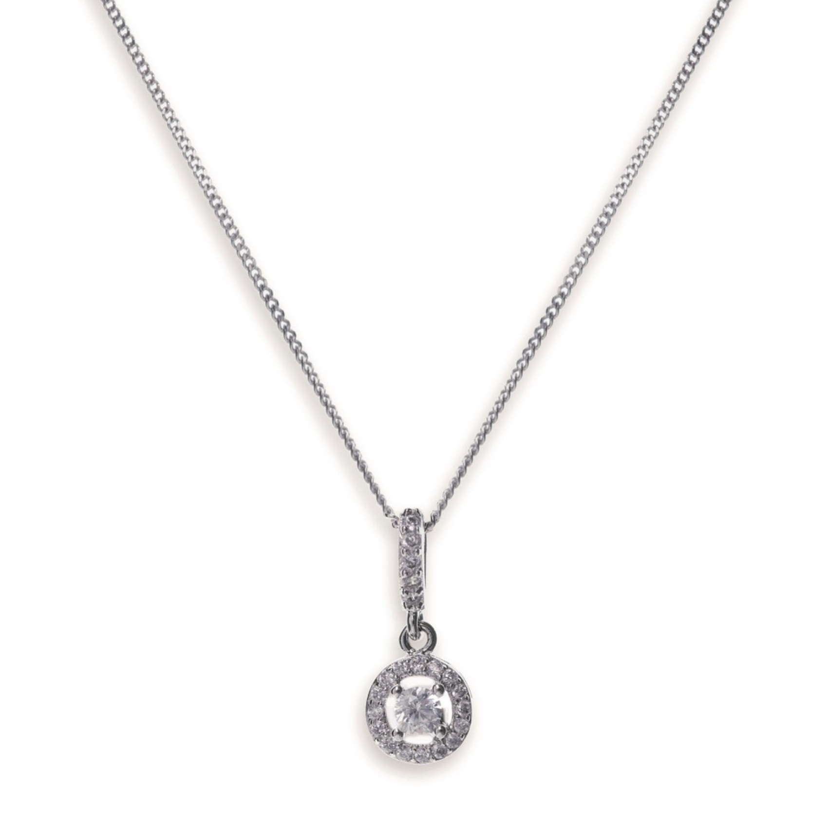 A classic crystal pendant necklace with timeless sparkle. This delicate design features a central solitaire stone caged in a circle of tiny pave set crystals. A dainty pendant necklace that's perfect for both brides and bridesmaids.