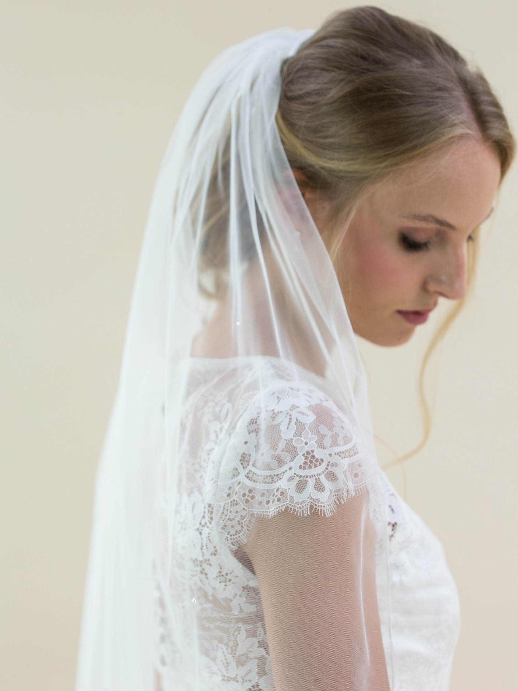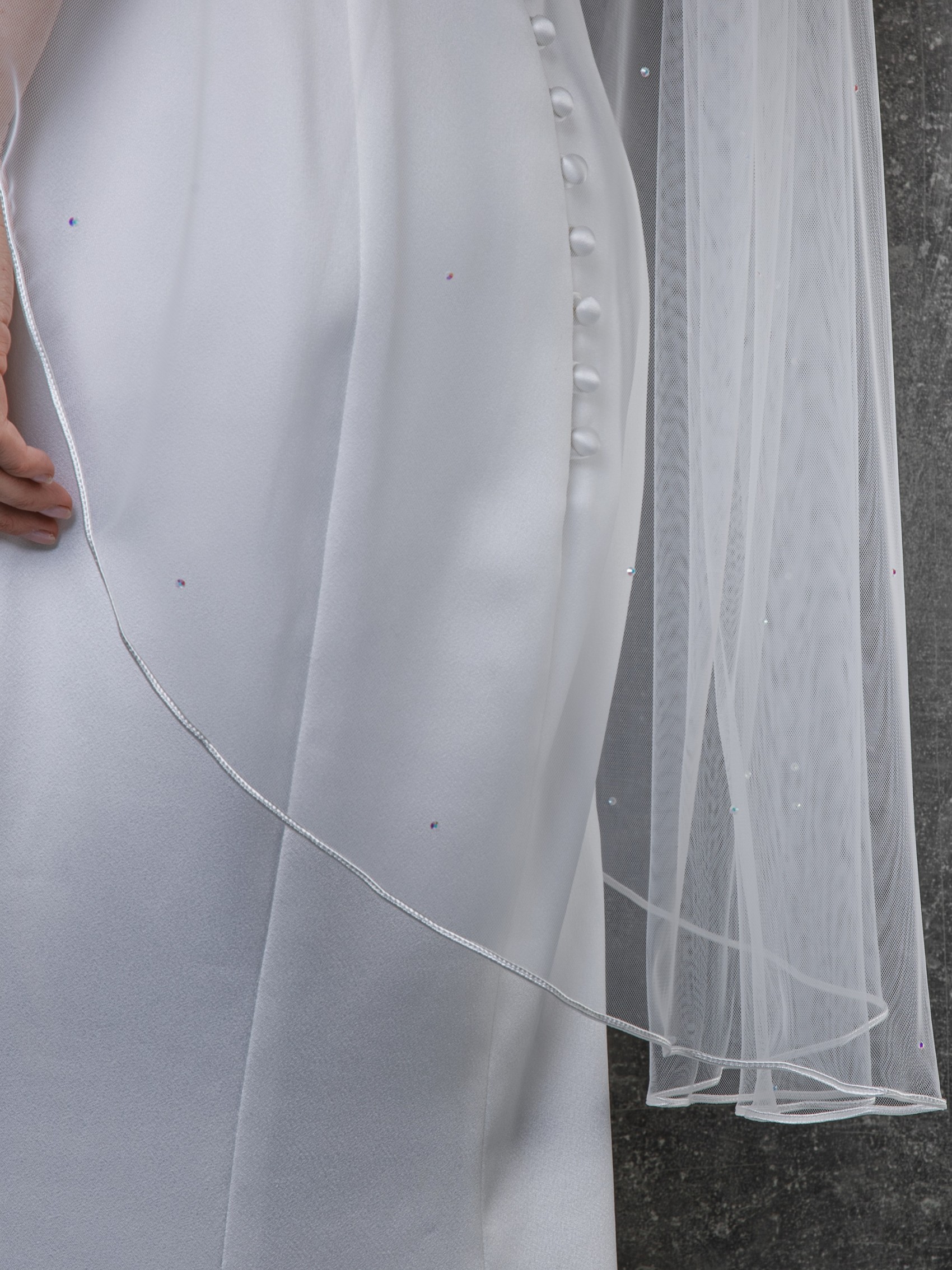 A classic single tier fingertip veil in the softest Italian tulle, beautifully edged with Russian braid and finished with scattered diamantes for a hint of pretty sparkle.