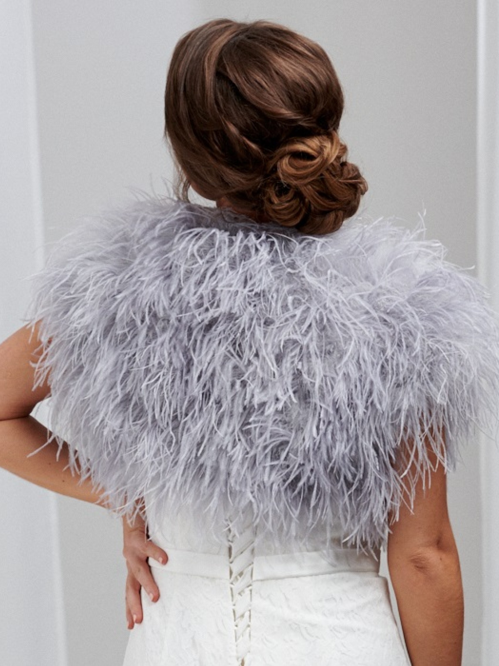 A flamboyant feather bolero shrug crafted from the fluffiest silver grey ostrich feathers and finished with silky satin lining for comfort. Neatly covers the shoulders with a flattering cropped fit, giving a beautiful silhouette. A glamorous wedding cover up for both brides and bridesmaids this timeless silver grey feather shrug is perfect for a winter wonderland theme. Perfect for special occasion wear too.
