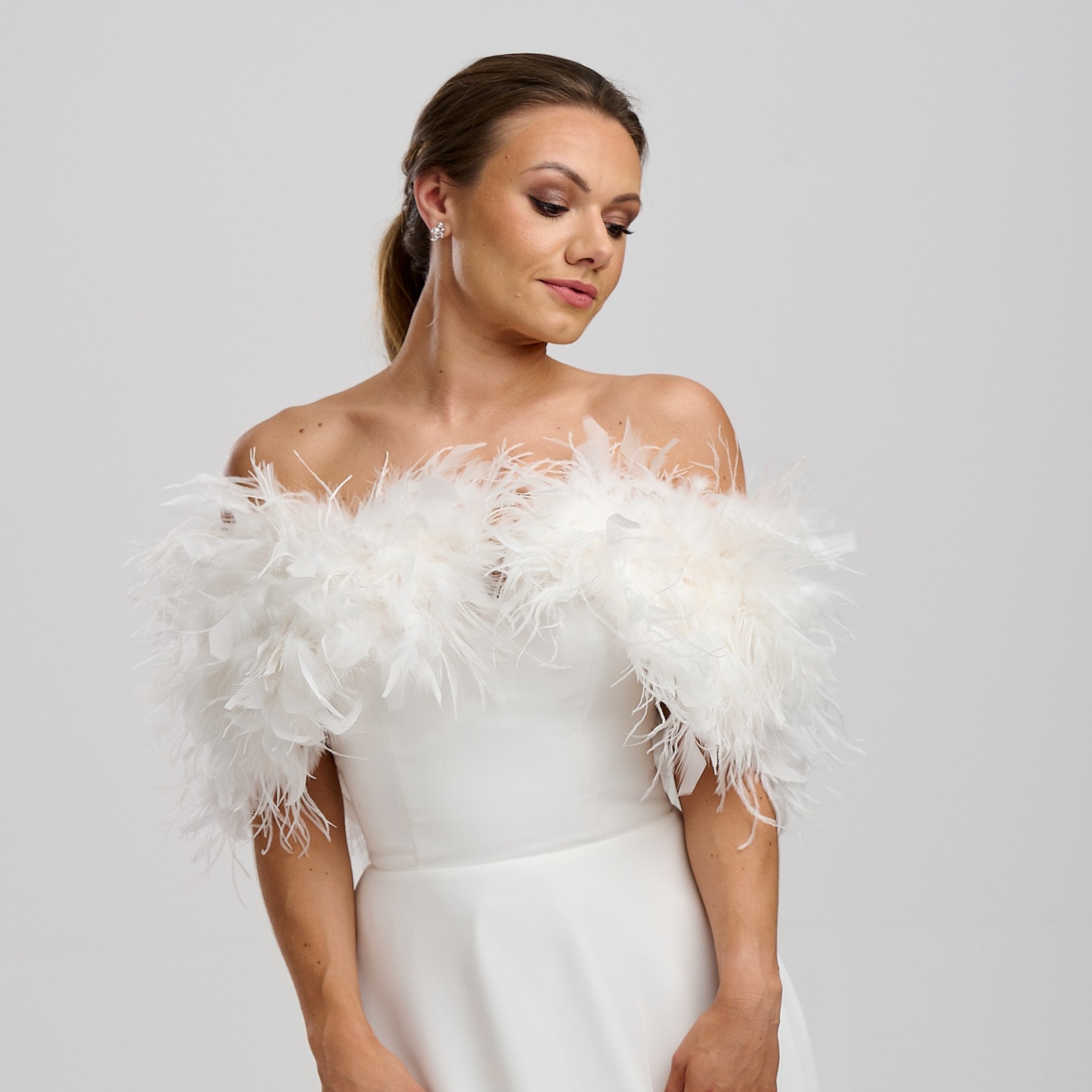 Une superbe étole de mariée à plumes volantes en ivoire classique. Les magnifiques plumes d'autruche sauvages ajoutent une texture délicieuse à cette pièce et la conception attrayante de l'épaule est à la fois flatteuse et chaleureuse sans pour autant cacher votre magnifique robe. Parfait pour les mariées et les demoiselles d'honneur.