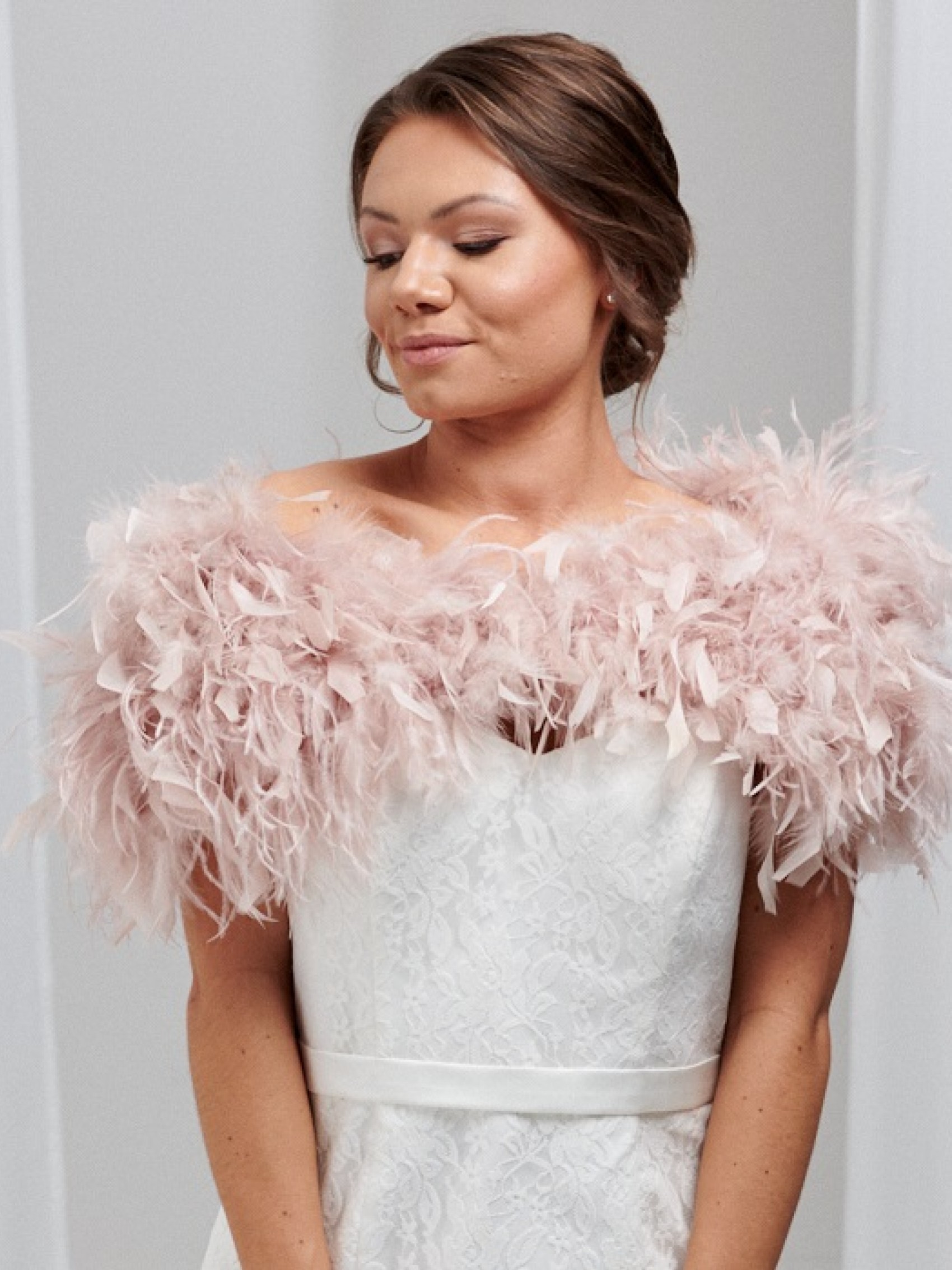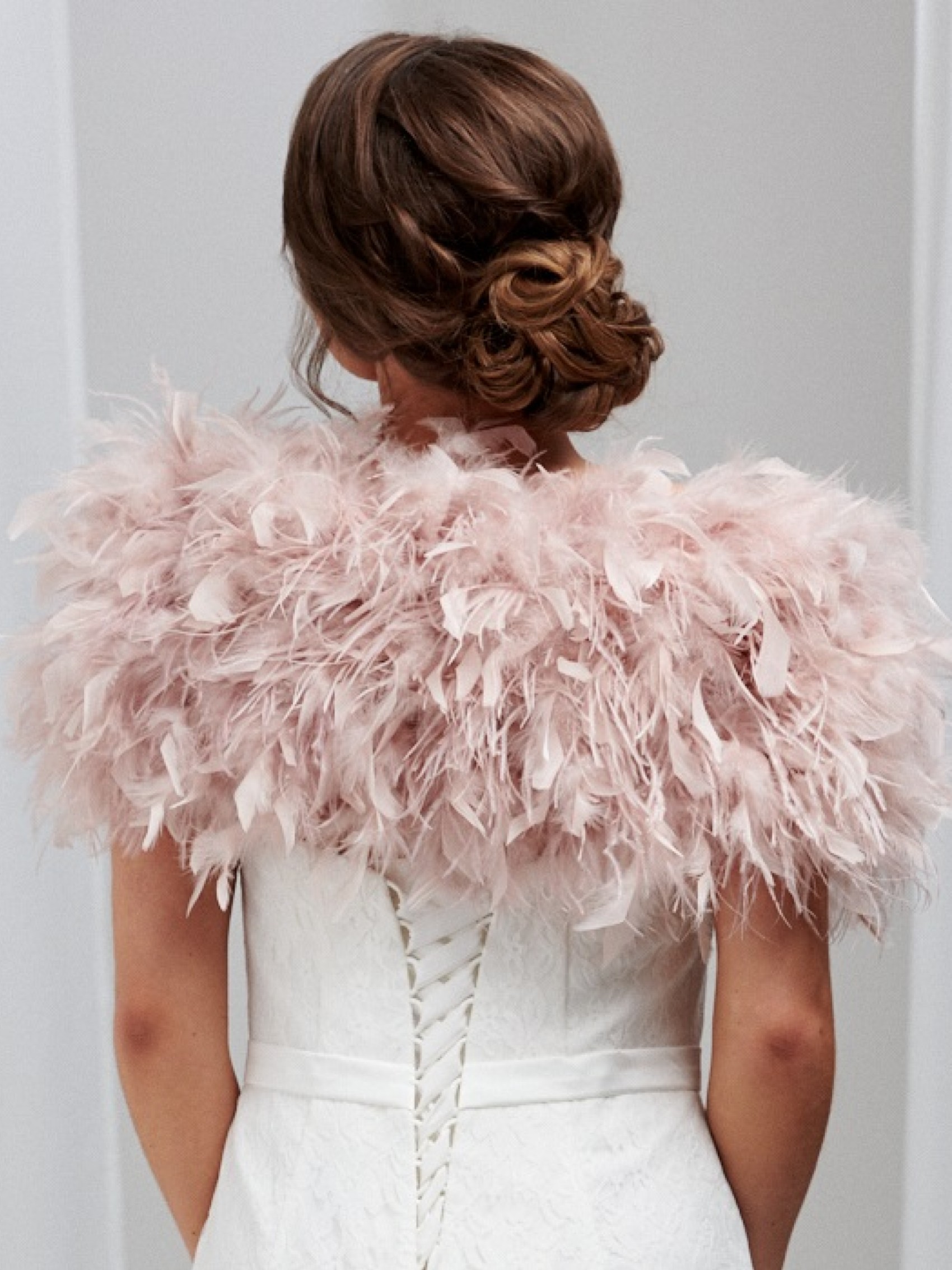 Une superbe étole de mariée en plumes volantes, d'un joli rose blush. Les belles plumes d'autruche sauvages ajoutent une texture délicieuse à cette pièce et la conception attrayante à épaules découvertes est à la fois flatteuse et chaleureuse sans cacher votre magnifique robe. Parfait pour les mariées et les demoiselles d'honneur.