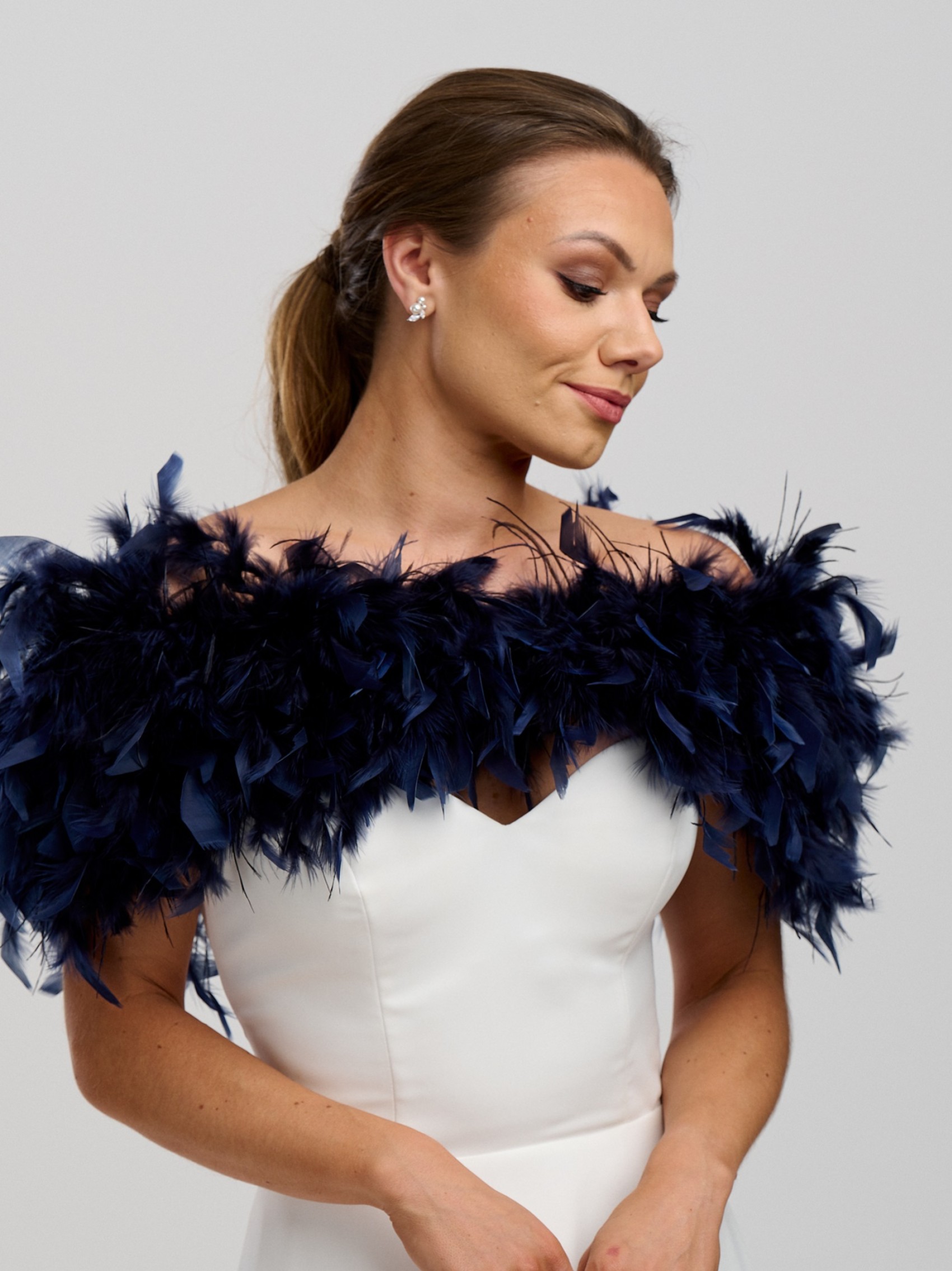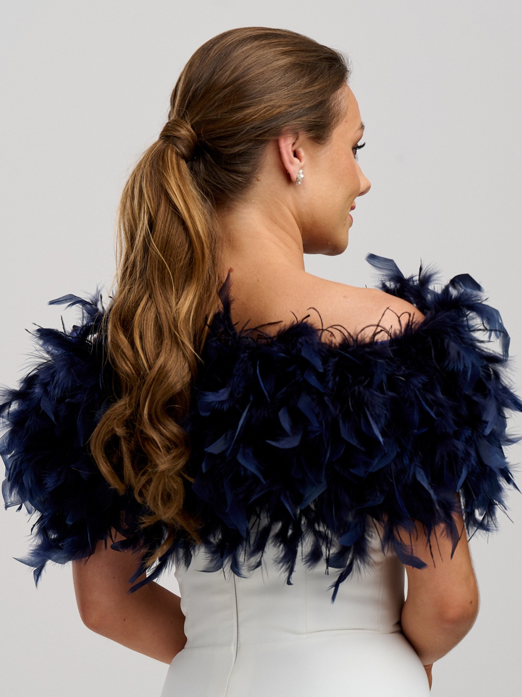 Une superbe étole de plumes à volants en bleu marine foncé. Les magnifiques plumes d'autruche sauvages ajoutent une texture délicieuse à cette pièce et la conception attrayante de l'épaule est à la fois flatteuse et chaleureuse sans cacher votre magnifique robe. Cette étole de plumes bleu marine est un choix glamour pour les demoiselles d'honneur, la mère de la mariée et toute autre occasion spéciale.
