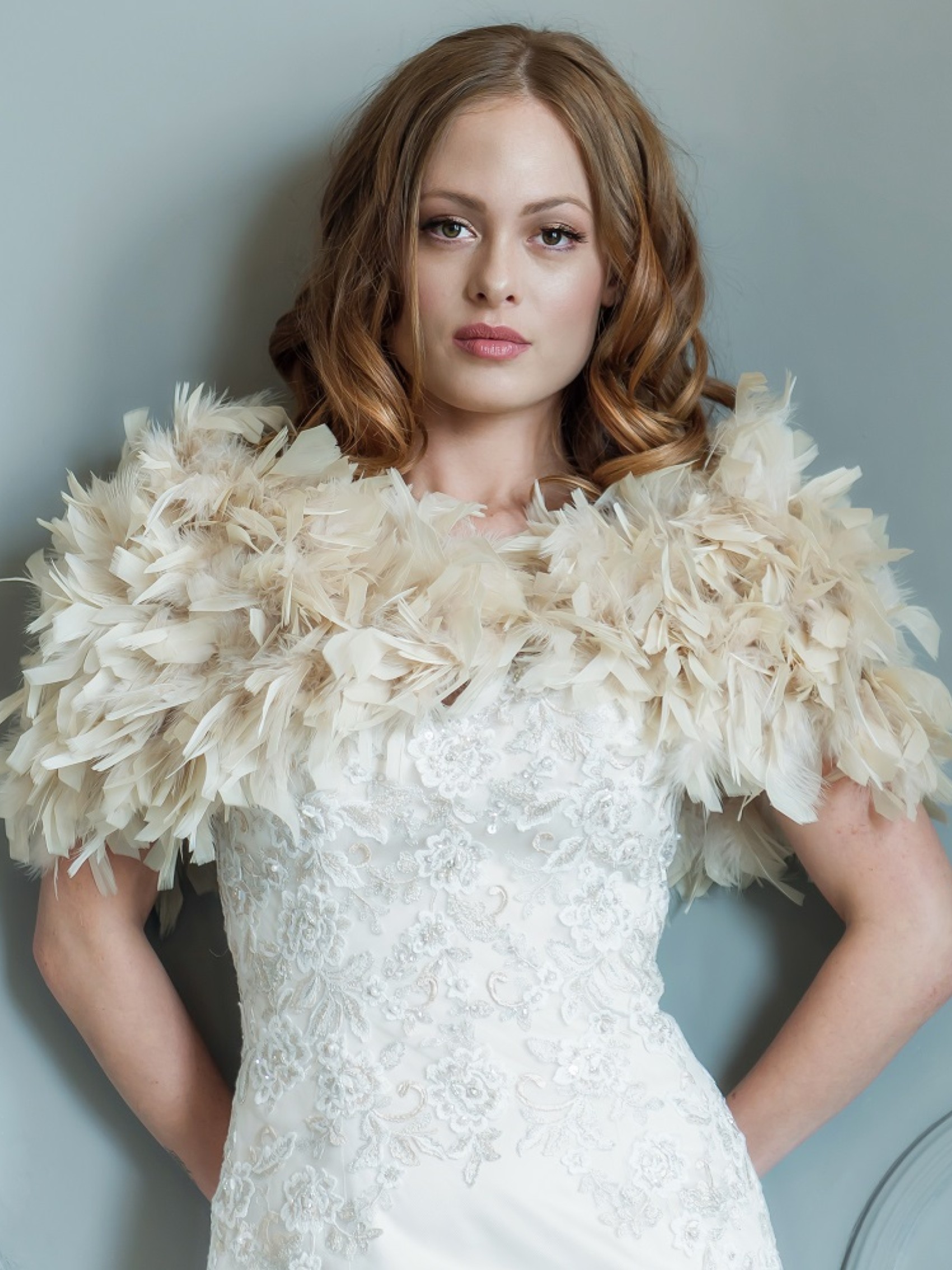 Étole de mariée Olivia Champagne à volants et plumes | OLIVIACHAMP-BH