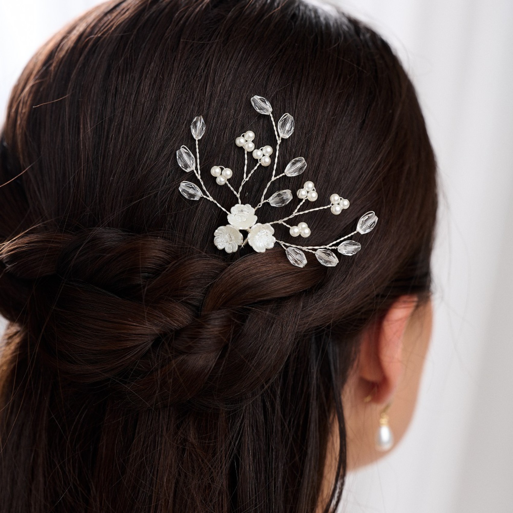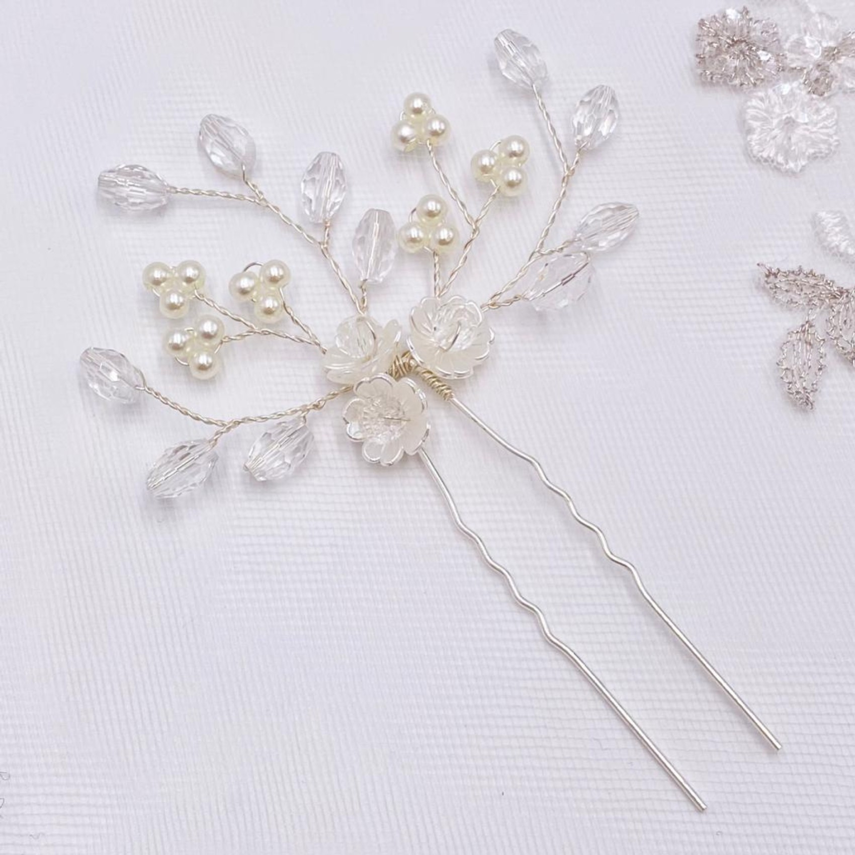 Une jolie épingle à cheveux florale pour mariage, composée d'une jolie grappe de trois fleurs ivoire pâle et de brins de cristaux ovales scintillants et de fausses perles délicates. Cette épingle à cheveux est idéale pour les mariées ou les demoiselles d'honneur et elle est superbe portée seule ou par paire. Associez-les à de jolies boucles d'oreilles pour un look de mariage magnifique.