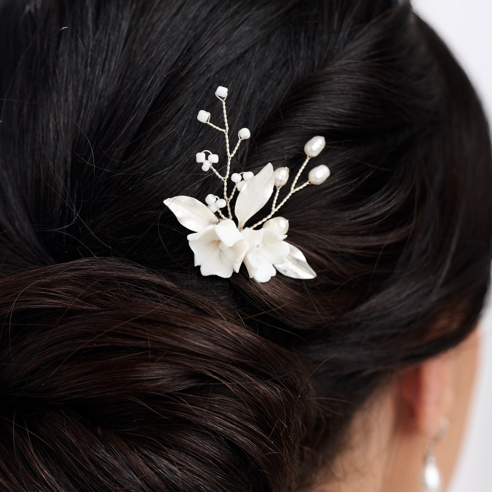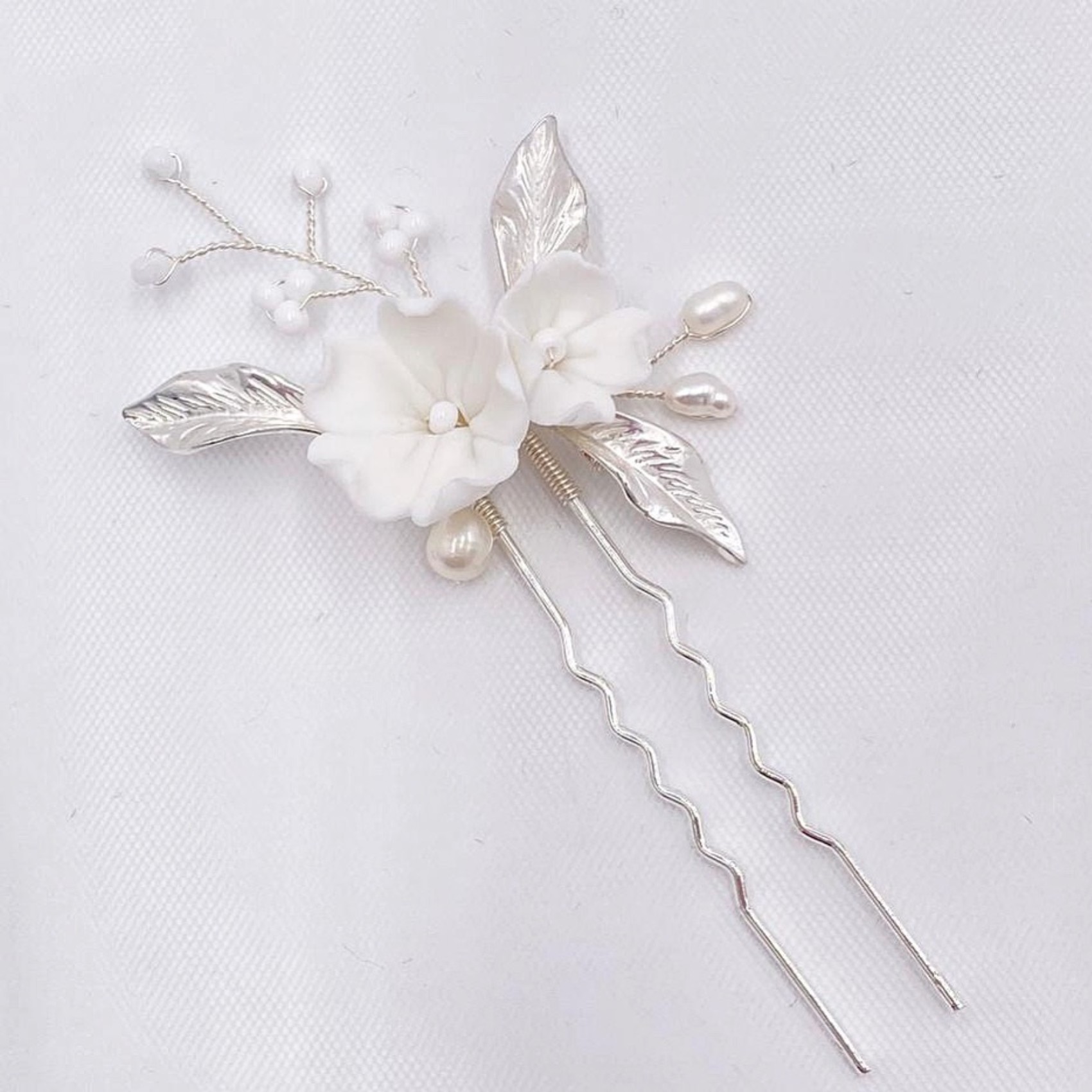 Parfaitement assortie à notre magnifique peigne Tulippa, cette délicate épingle à cheveux apporte la plus jolie touche florale aux cheveux des mariées et des demoiselles d'honneur. Cette délicate épingle à cheveux florale présente deux fleurs en porcelaine ivoire faites à la main et des feuilles en argent pâle, complétées par de délicats brins de perles d'eau douce ivoire et de minuscules perles de rocaille.