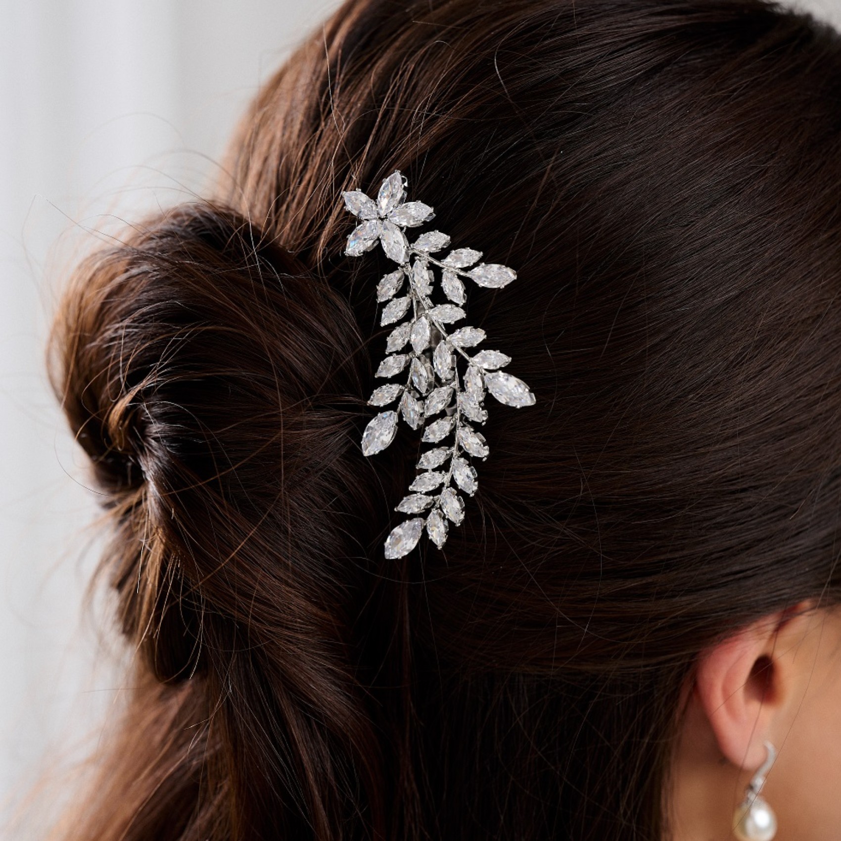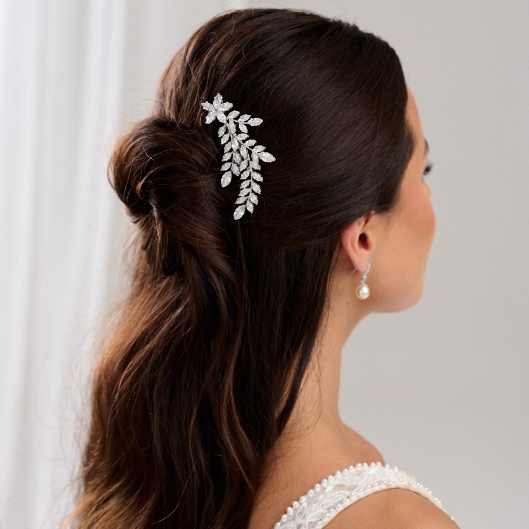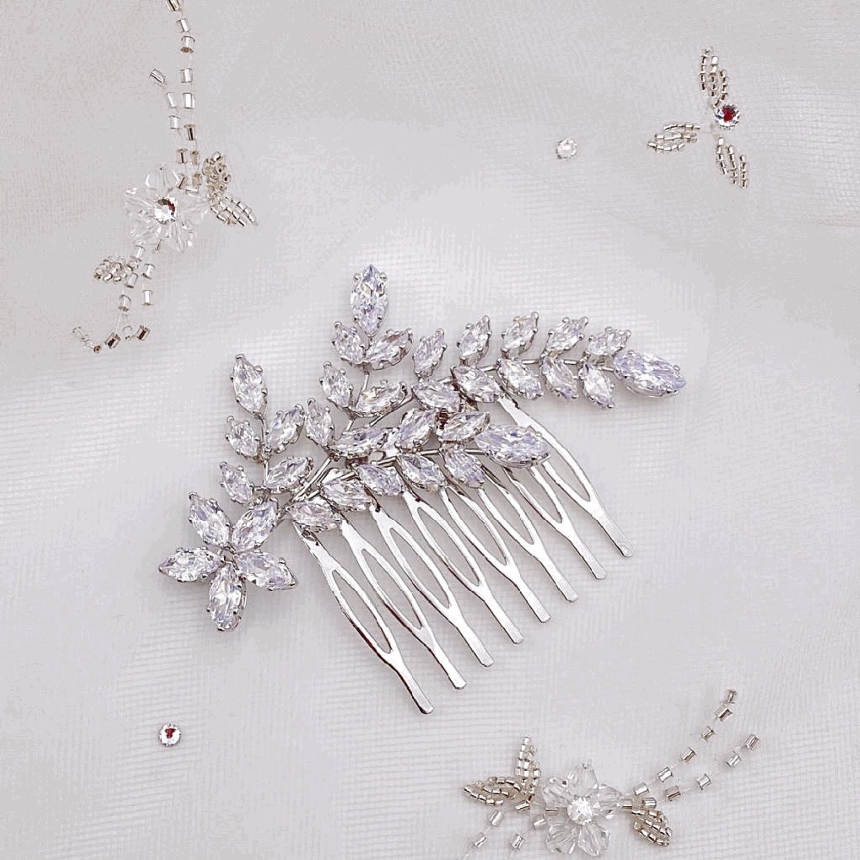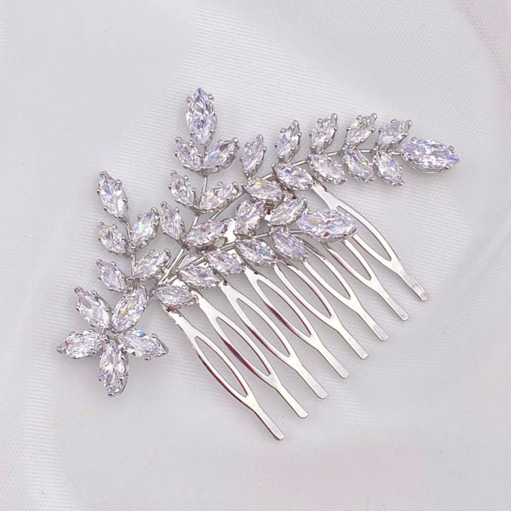 Aurora est un peigne à cheveux sophistiqué en cristal pour mariage qui présente une gerbe de cristaux marquise scintillants dans un élégant design asymétrique. Ce peigne est le complément idéal d'une coiffure de mariage élégante. Associez-le à de superbes bijoux de mariage pour une touche finale parfaite. Il se fixe dans les cheveux à l'aide d'un peigne en métal.