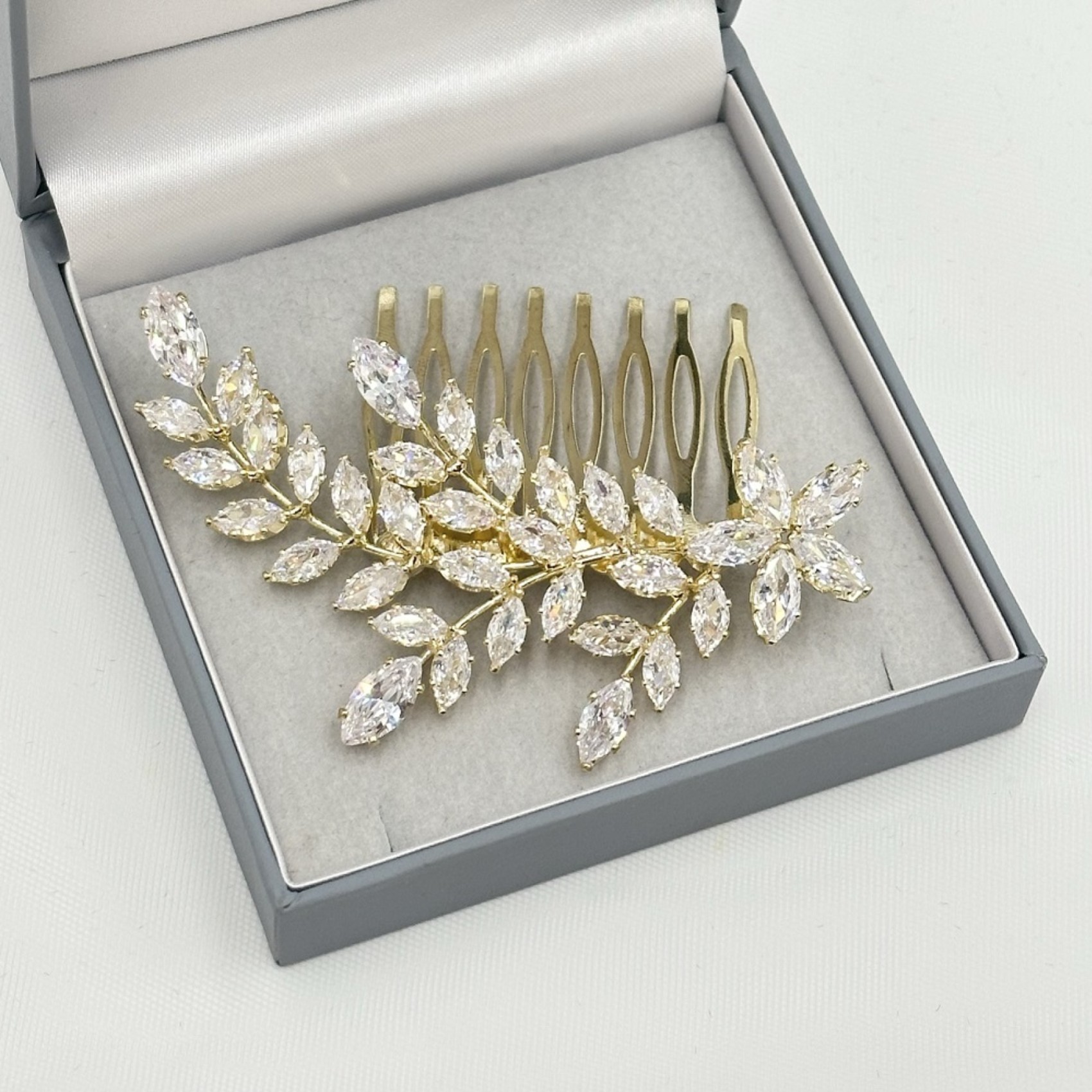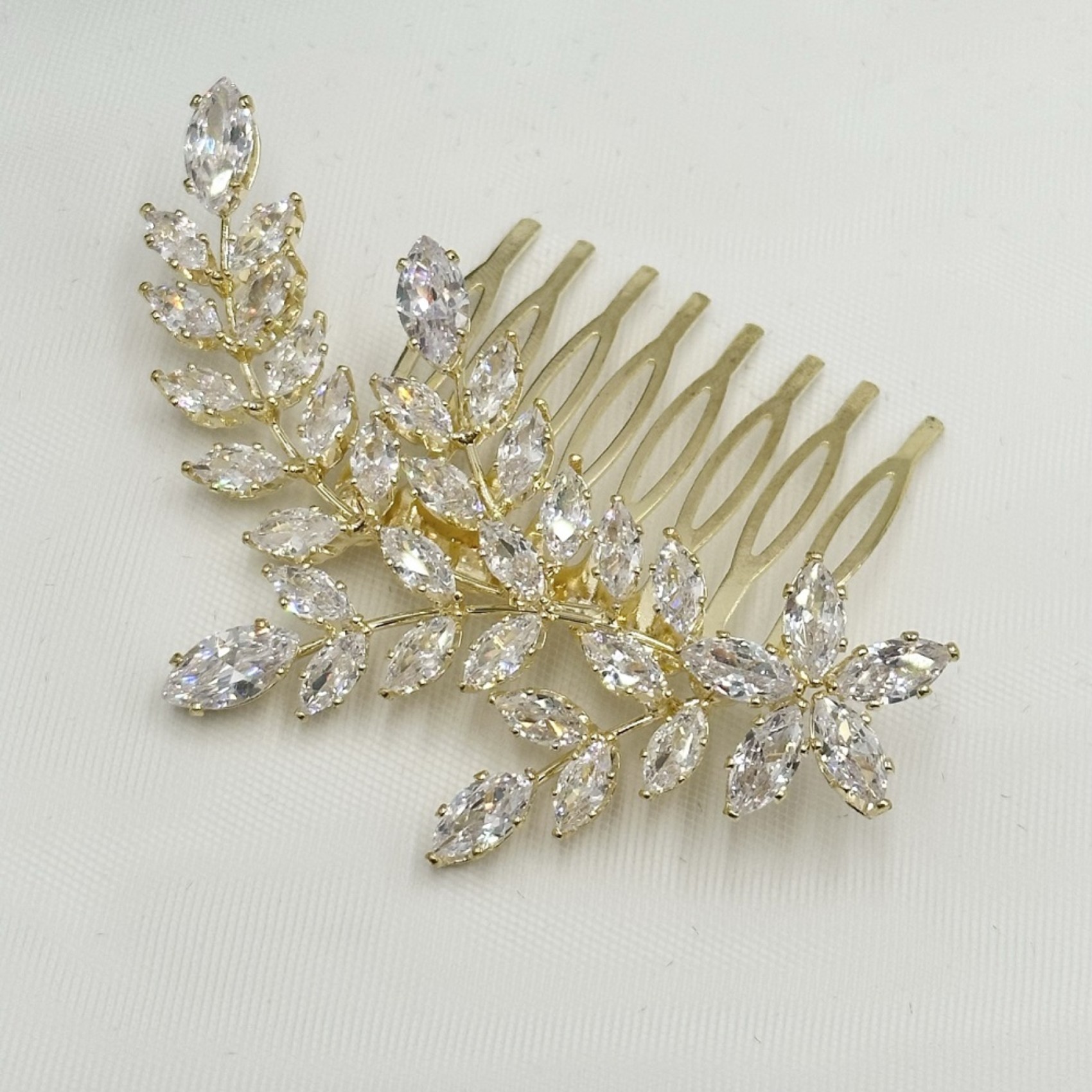 Aurora est un peigne à cheveux sophistiqué en cristal pour mariage qui présente une gerbe de cristaux marquise scintillants dans un élégant design asymétrique. Complément idéal d'une coiffure de mariée élégante, cette pièce d'or étincelante s'associe à de superbes bijoux de mariage pour une touche finale parfaite. Il se fixe dans les cheveux à l'aide d'un peigne en métal.