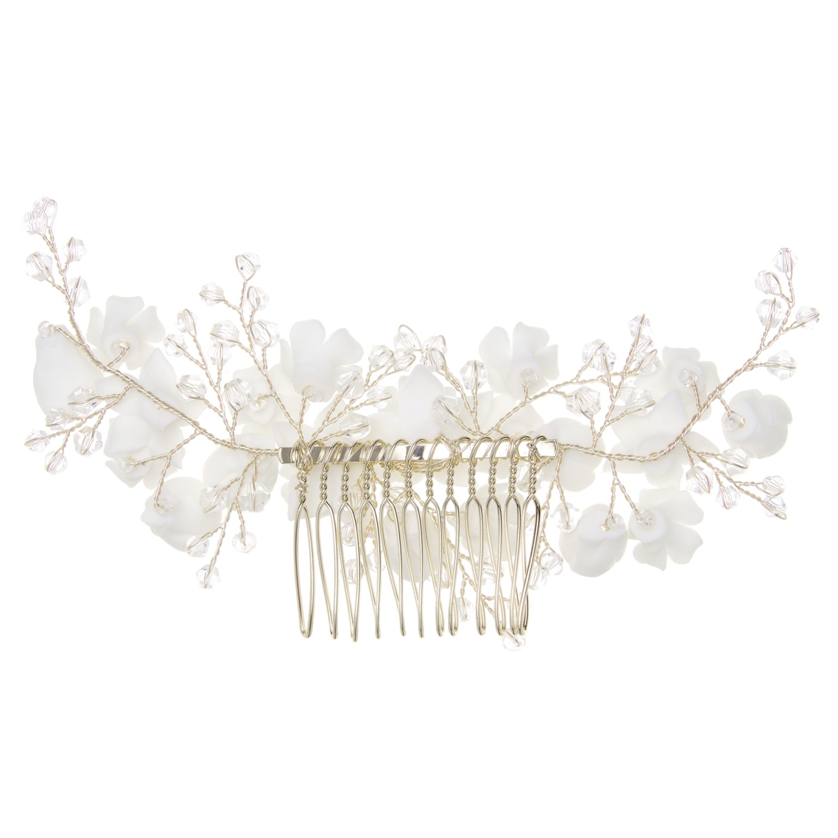 Nous nous pâmons devant le dernier-né de notre collection d'accessoires pour cheveux de mariage - voici Rosewood ! Présentant une abondance de magnifiques fleurs en porcelaine nichées parmi des gerbes de cristaux scintillants, ce peigne à cheveux floral doré est l'ajout le plus éblouissant à la chevelure des mariées.