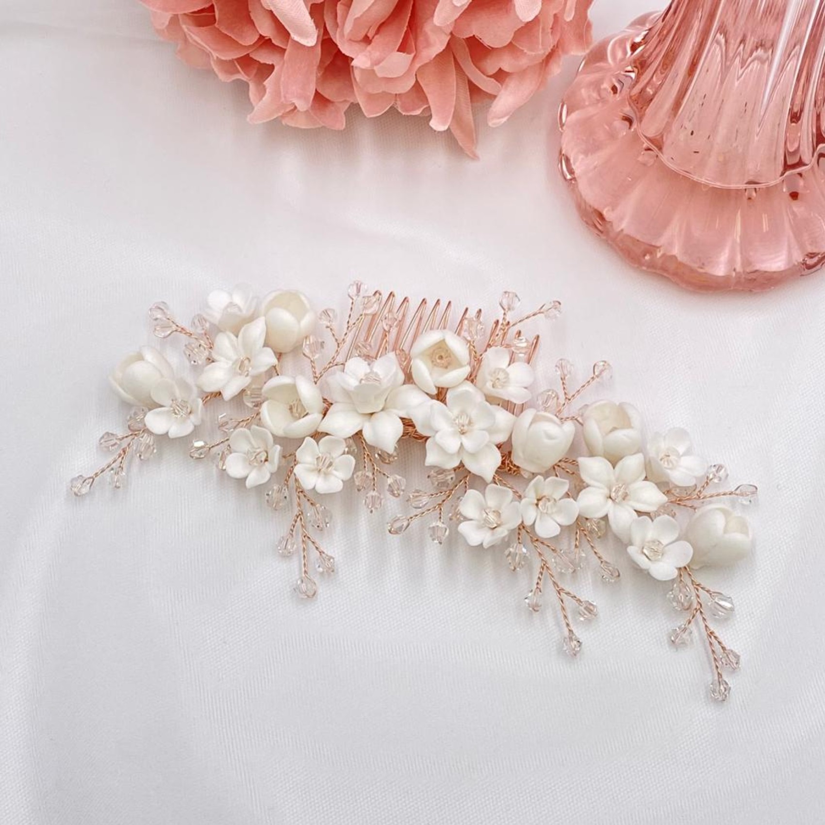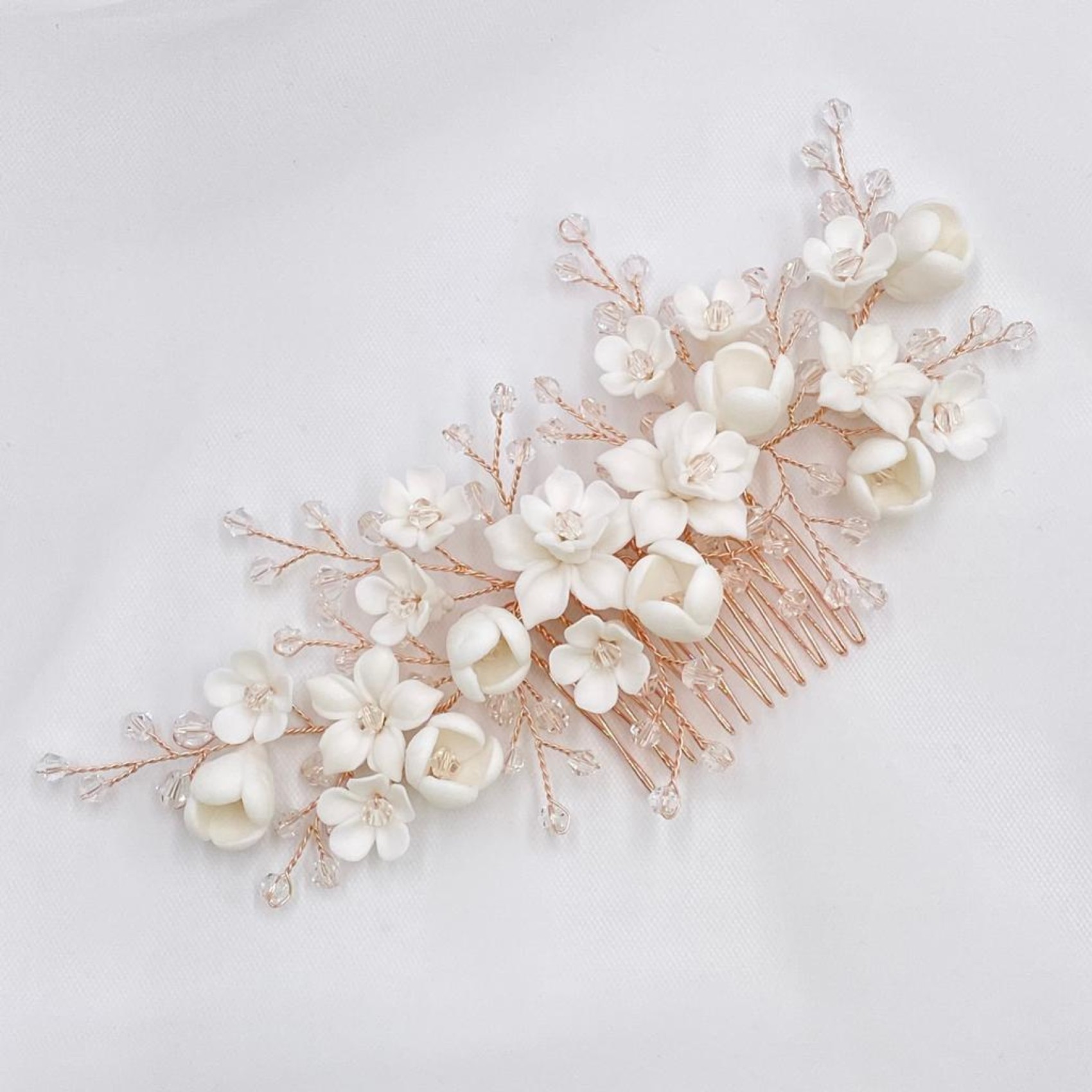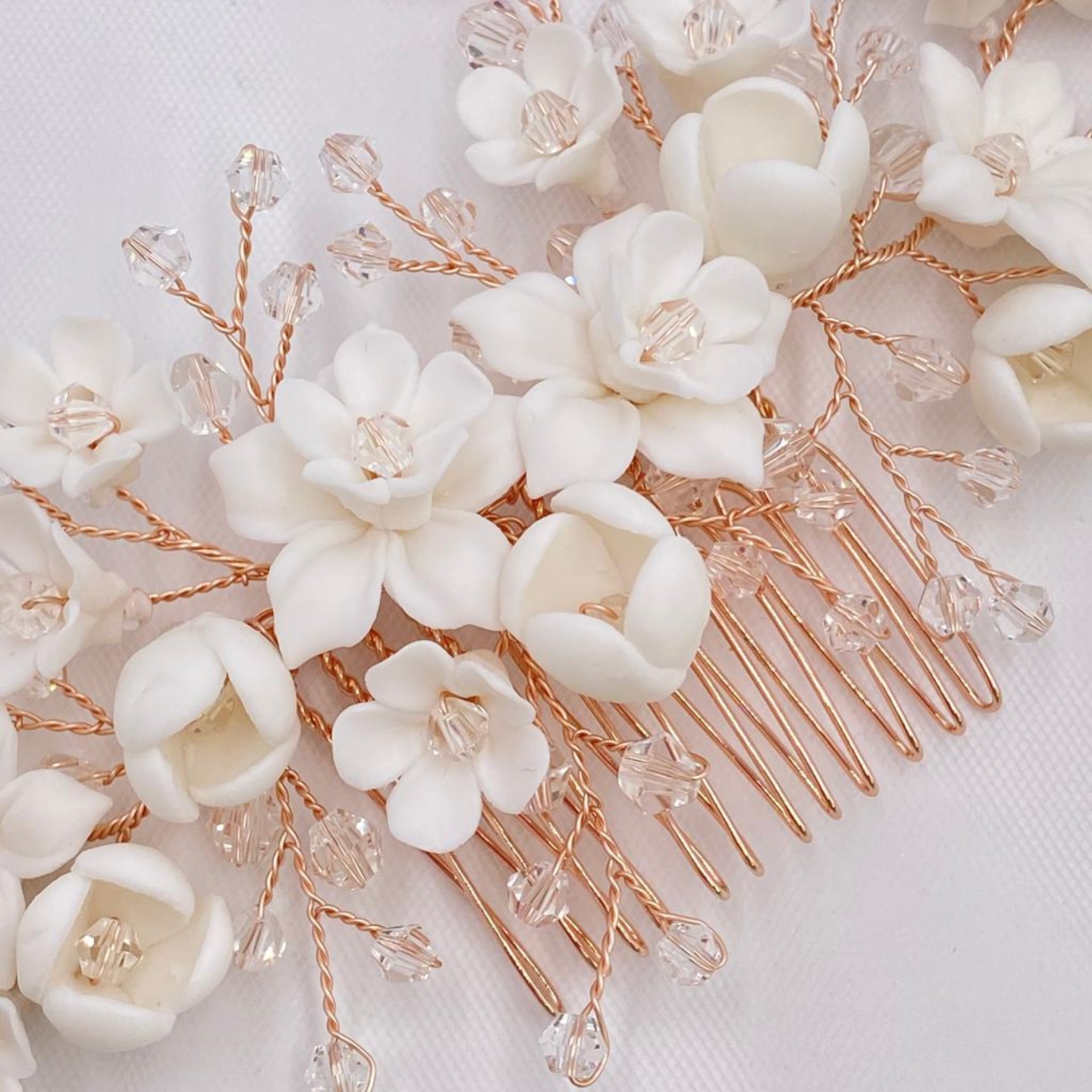 Nous nous pâmons devant le dernier-né de notre collection d'accessoires pour cheveux de mariage - voici Rosewood ! Présentant une abondance de magnifiques fleurs en porcelaine nichées parmi des gerbes de cristaux scintillants, ce peigne à cheveux floral est l'ajout le plus éblouissant à la chevelure des mariées.