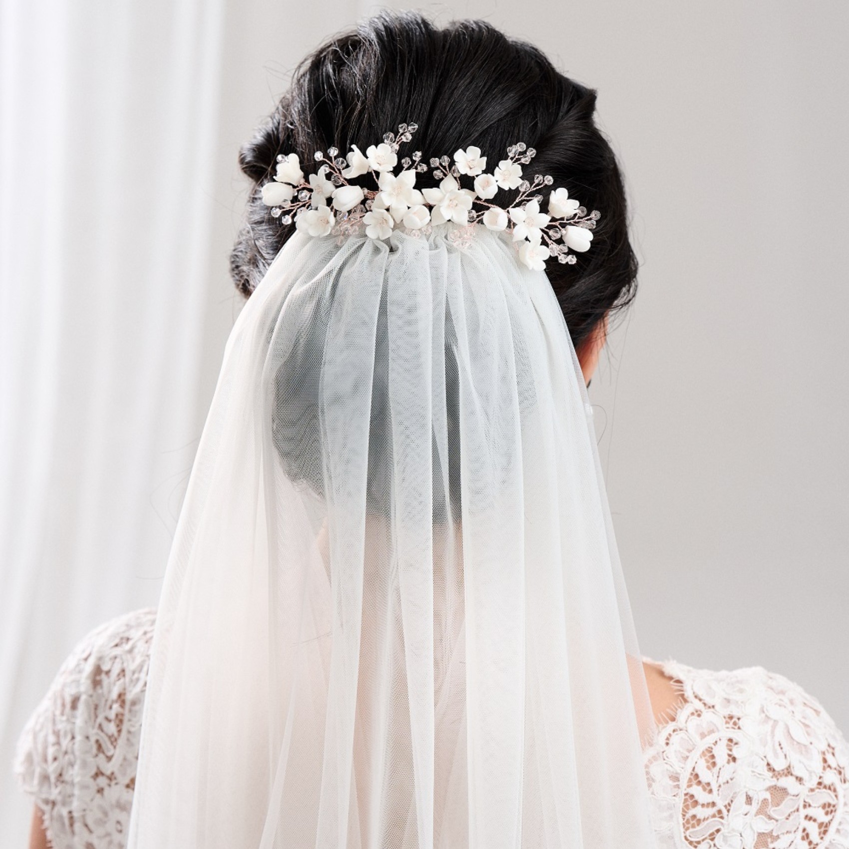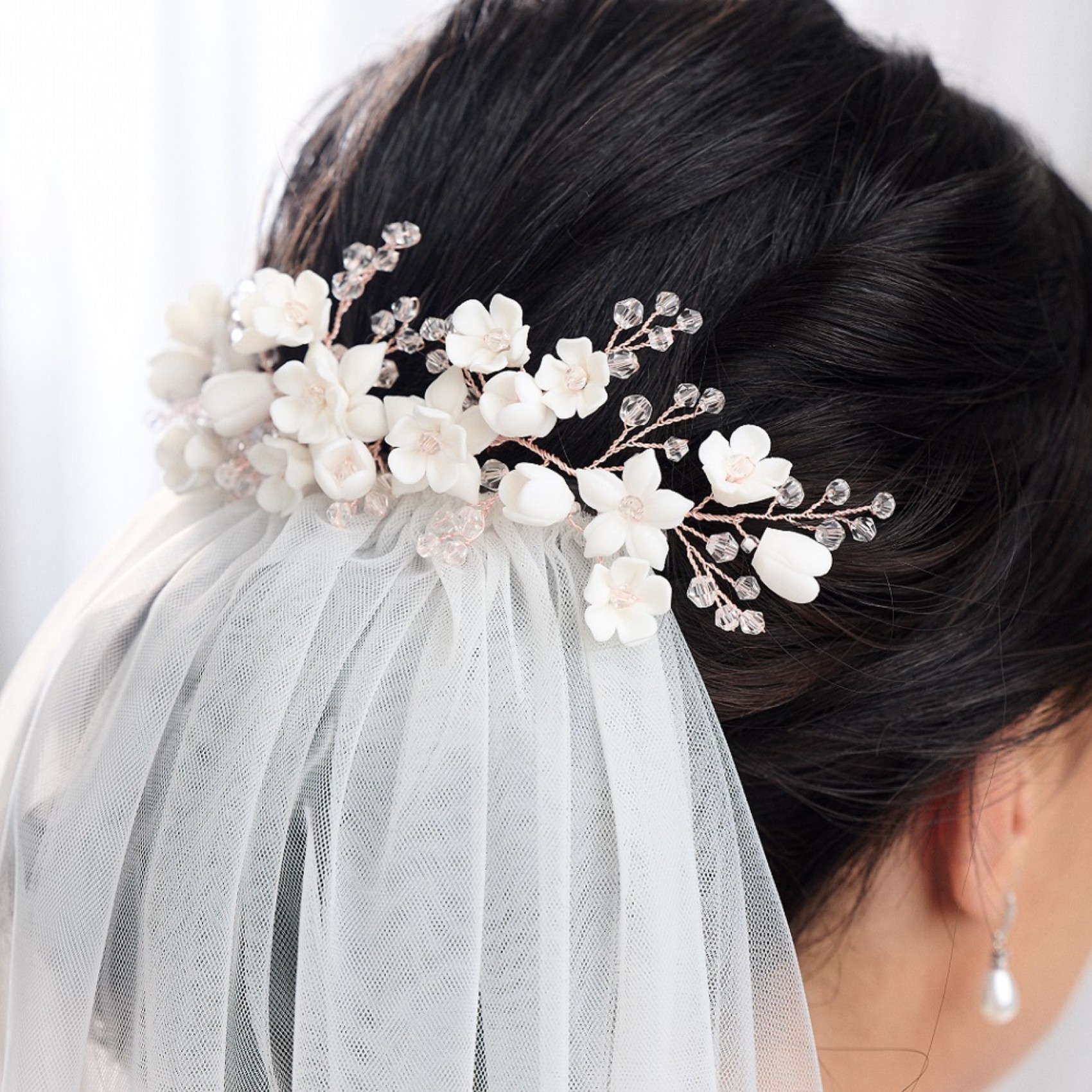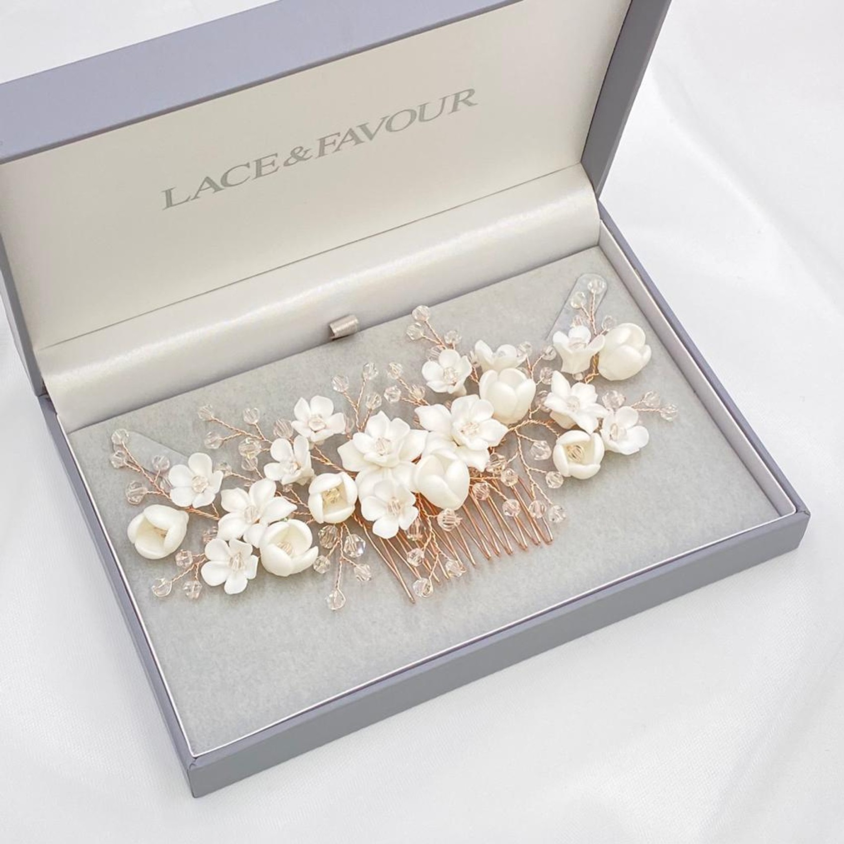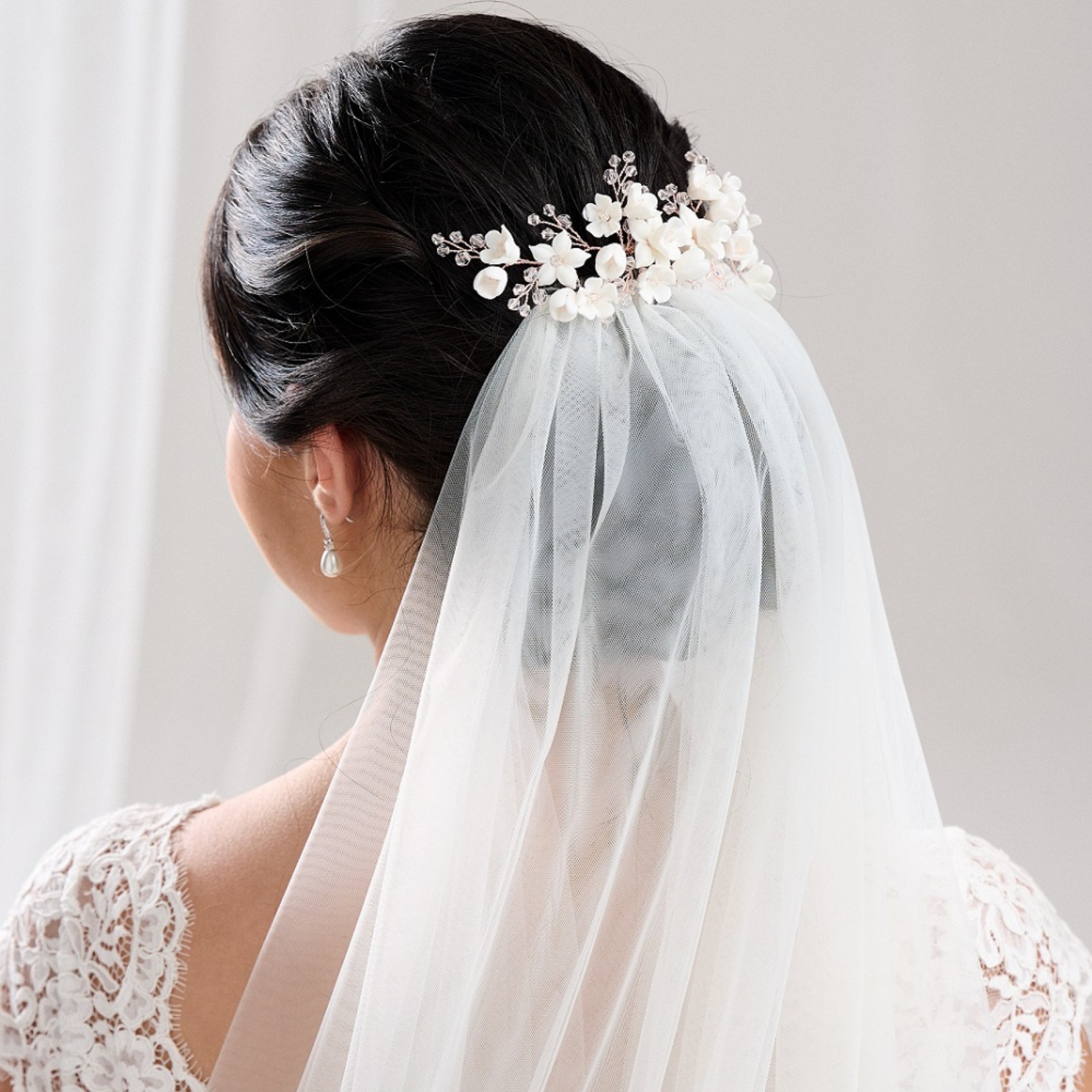 Nous nous pâmons devant le dernier-né de notre collection d'accessoires pour cheveux de mariage - voici Rosewood ! Présentant une abondance de magnifiques fleurs en porcelaine nichées parmi des gerbes de cristaux scintillants, ce peigne à cheveux floral est l'ajout le plus éblouissant à la chevelure des mariées.