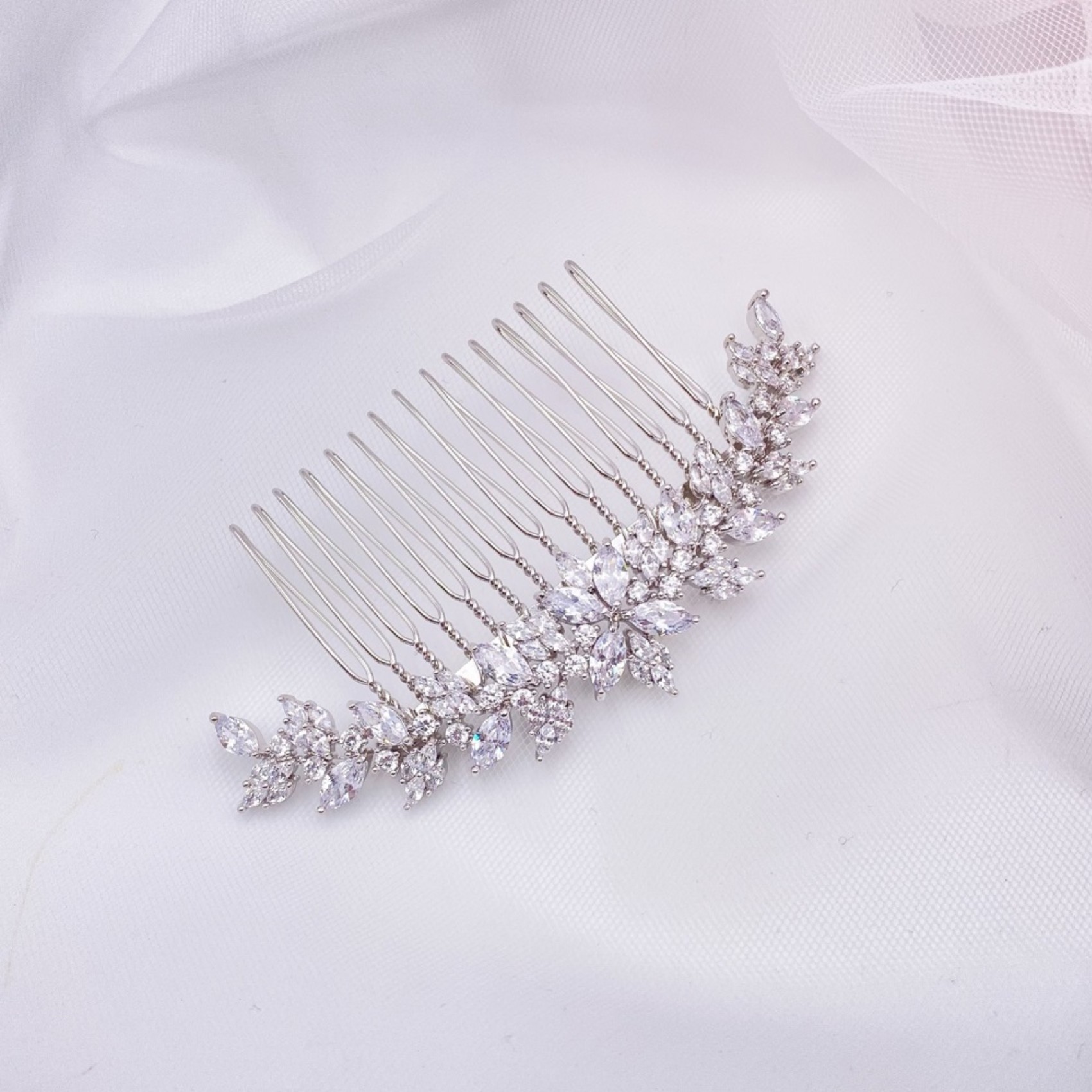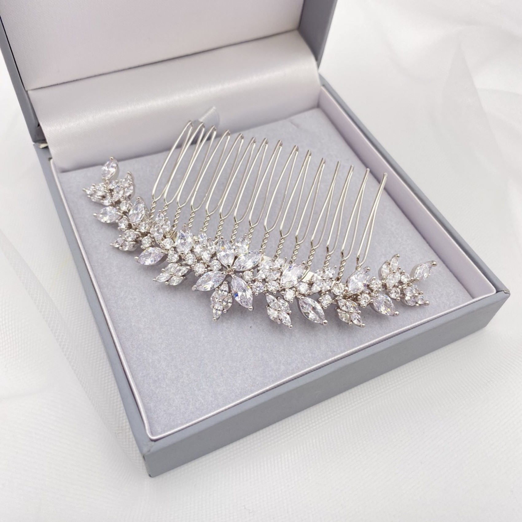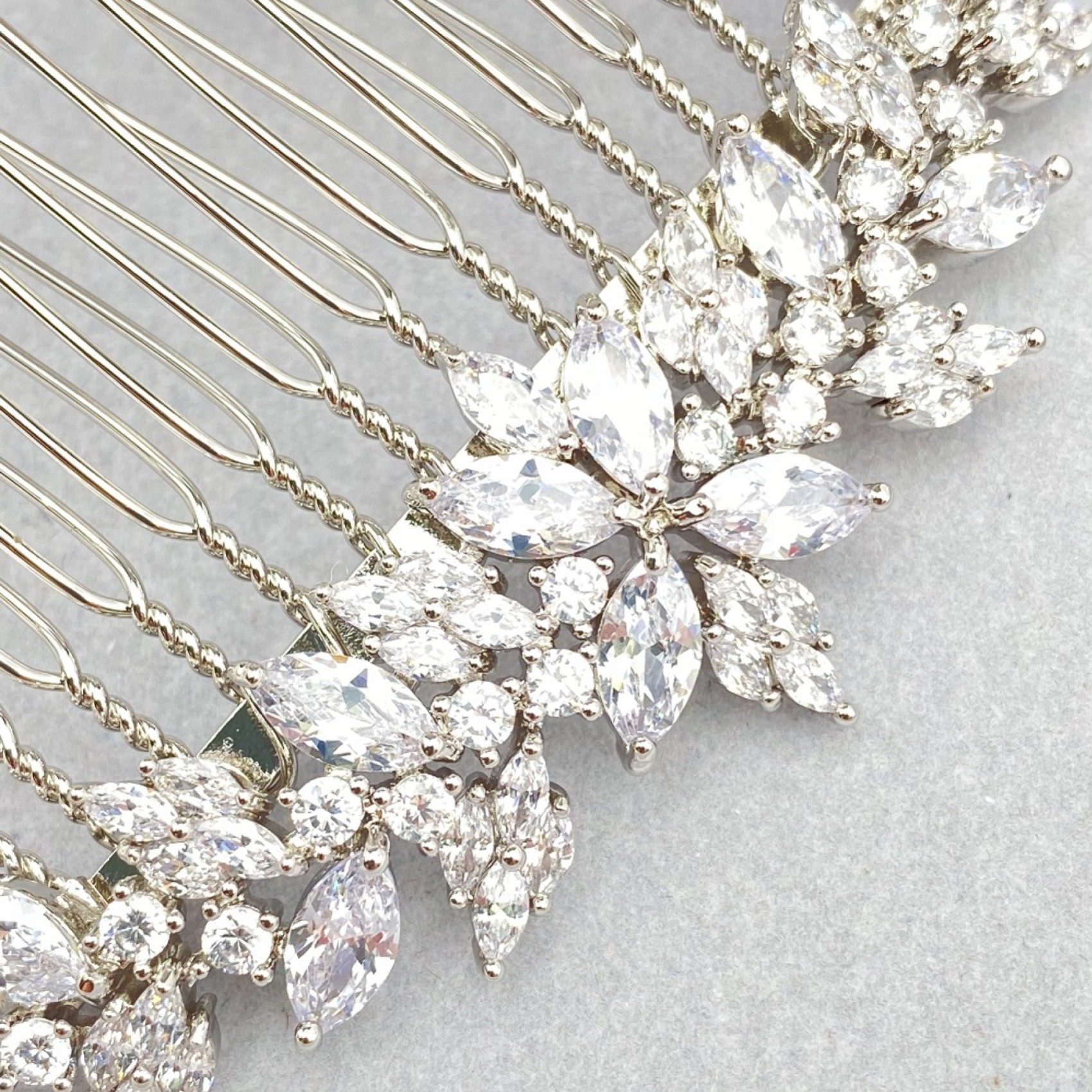 Délicat mais très étincelant, notre peigne à cheveux de mariage Rapture est un choix sophistiqué et élégant. Orné de cristaux marquises en zircon cubique dans un magnifique design d'inspiration vintage, cette pièce lumineuse est superbe dans n'importe quelle coiffure de mariée. Il constitue également un magnifique accessoire pour les cheveux des demoiselles d'honneur !
