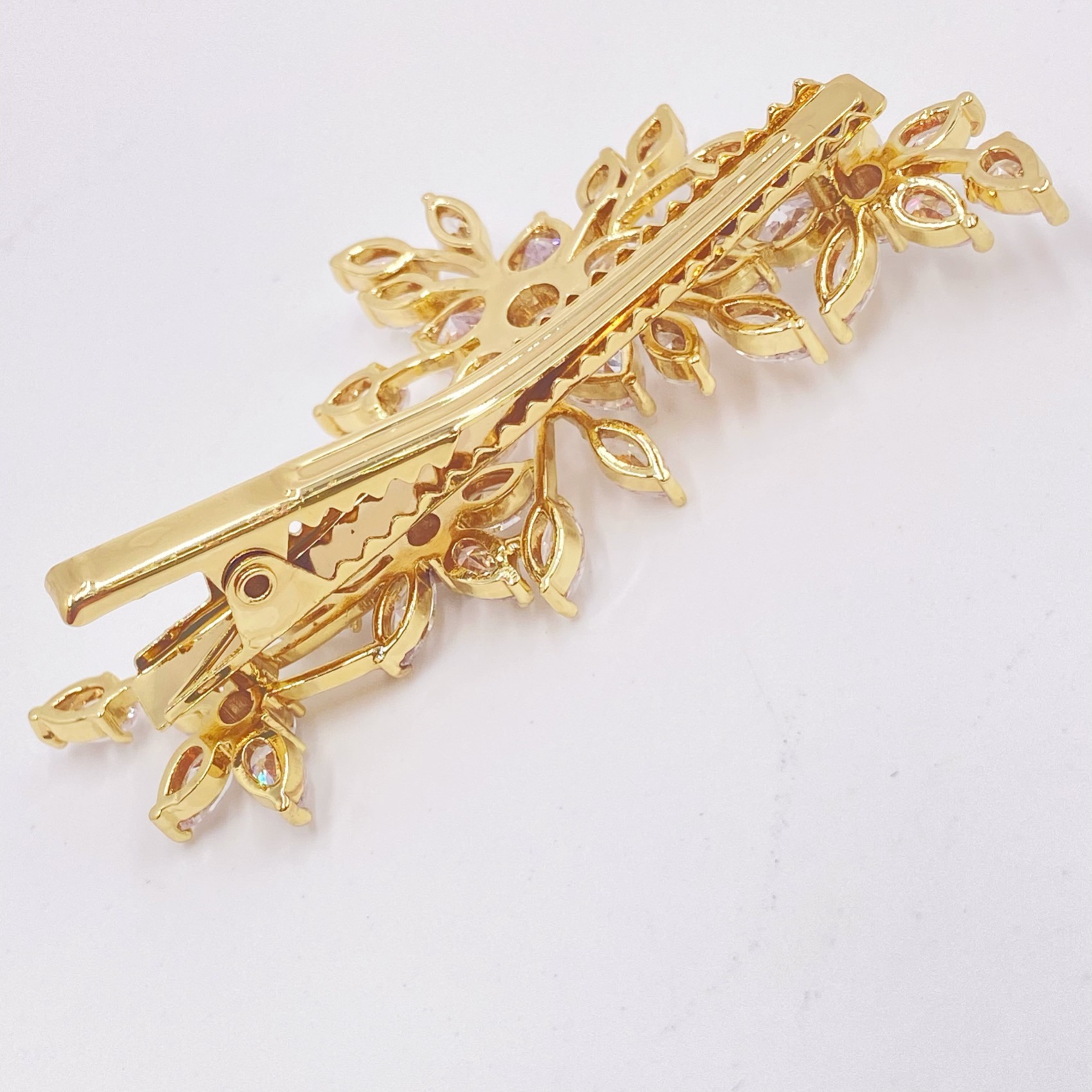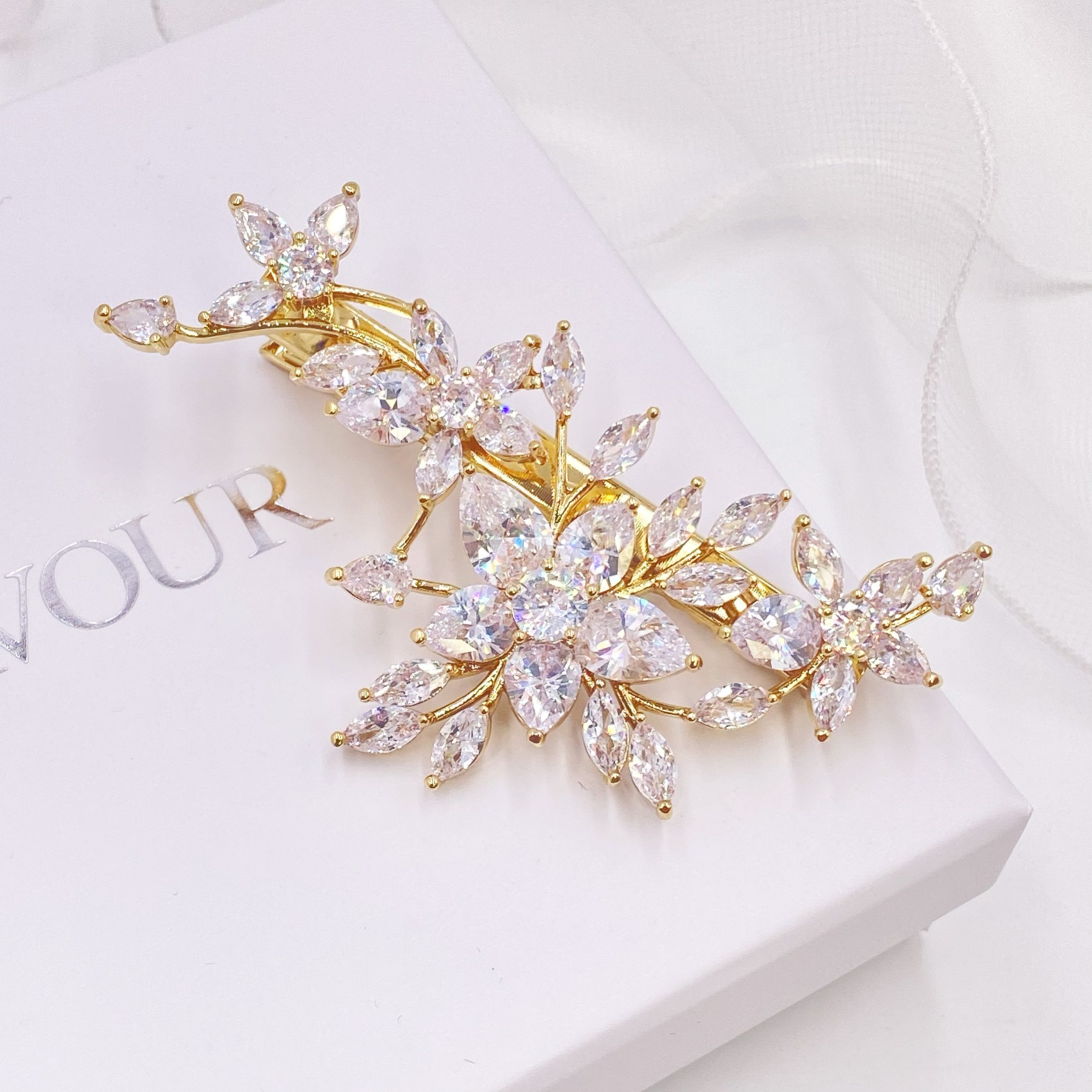 Une pince à cheveux en cristal doré magnifiquement polyvalente, avec des détails floraux en CZ étincelants sur une délicate pince en crocodile. Placez-la n'importe où dans les cheveux pour ajouter un éclat sophistiqué à votre look. Un choix idéal pour les mariées et les demoiselles d'honneur, cette pièce s'adapte aussi bien aux coiffures relevées qu'aux cheveux lâchés.