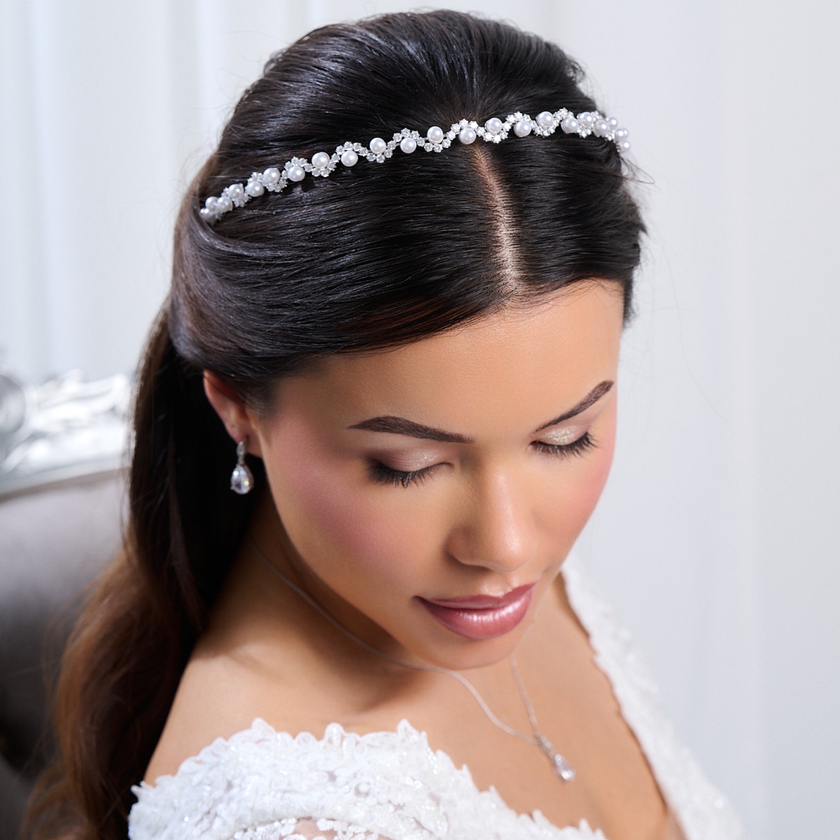 Une vague de diamants étincelants est parsemée de perles ivoires pour créer le plus joli des bandeaux de mariée. Son design délicat en fait l'accessoire de coiffure idéal pour les mariées et les demoiselles d'honneur.