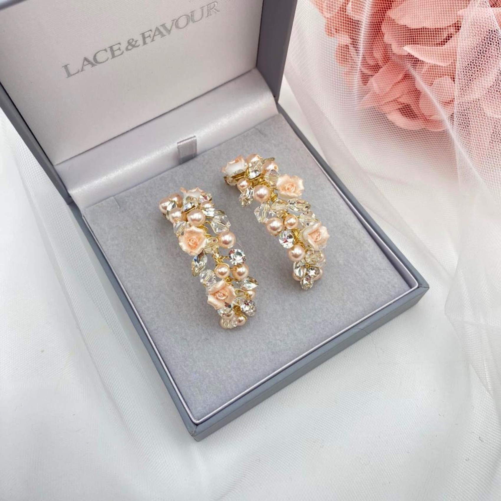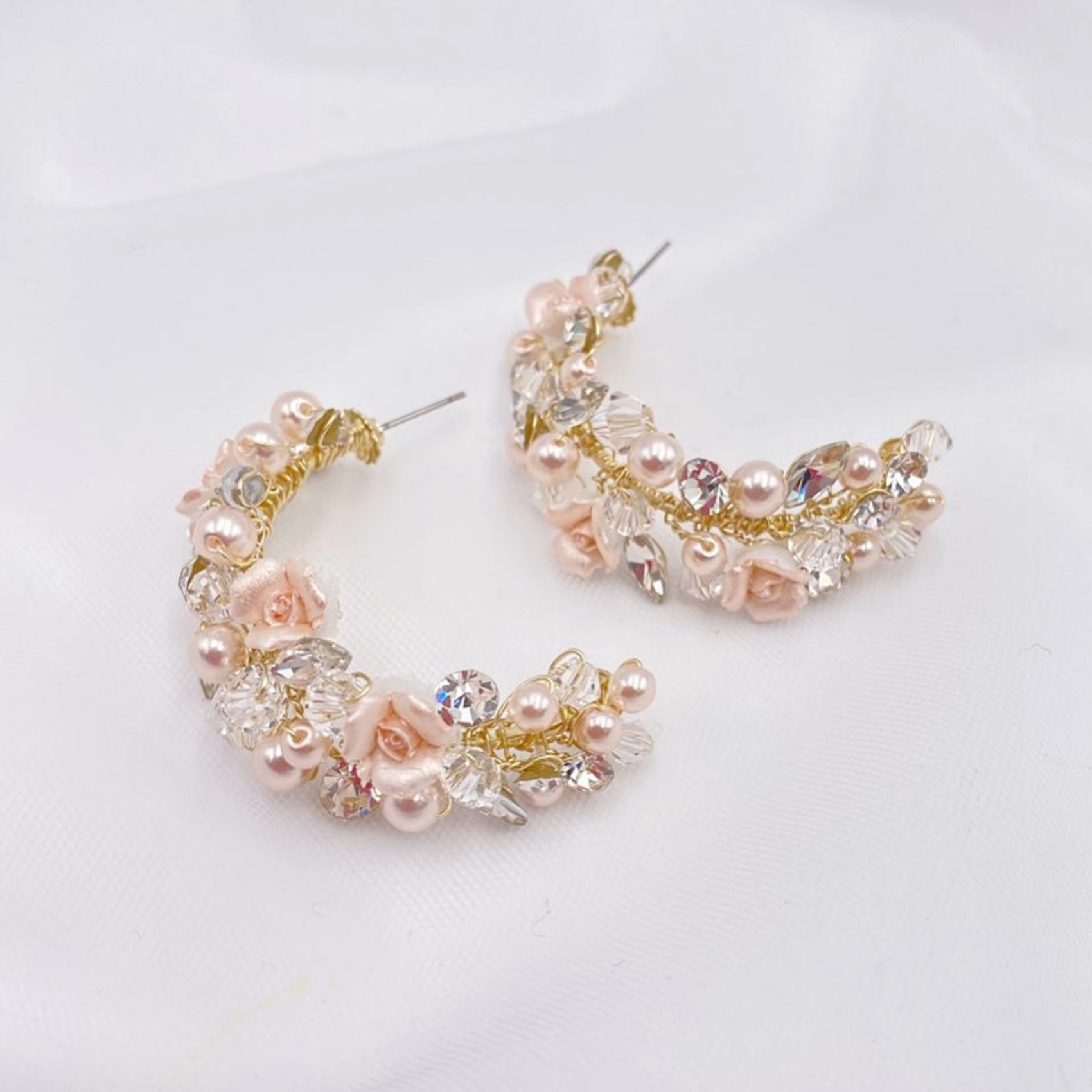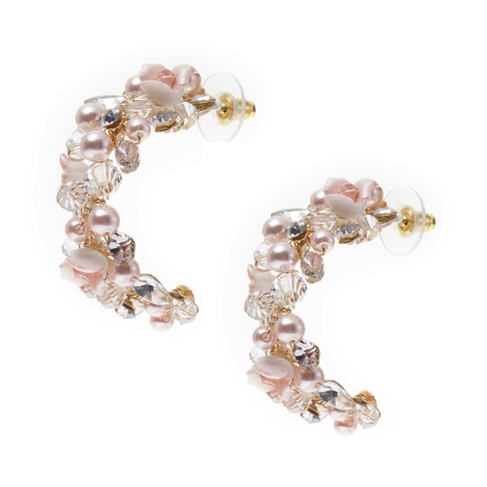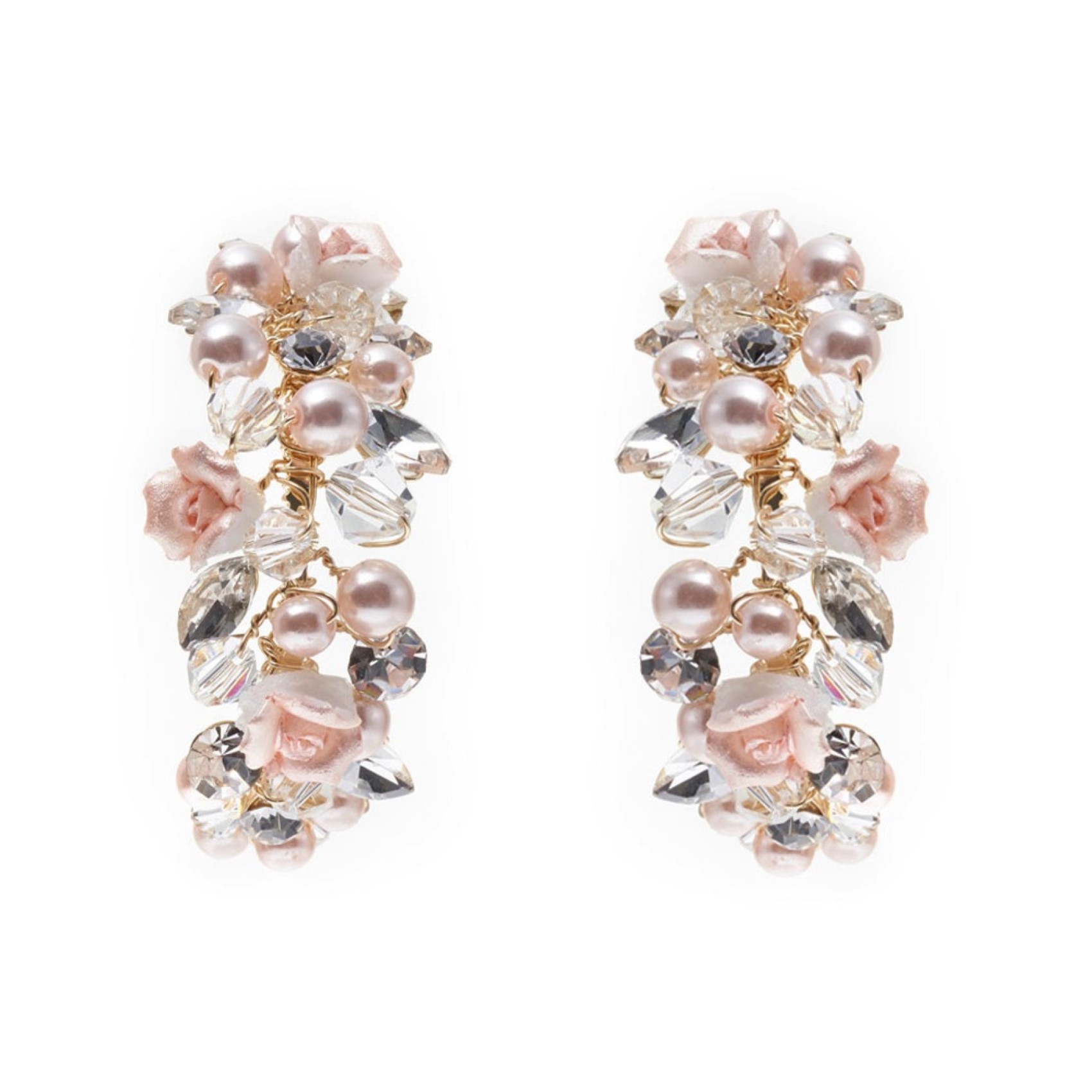 Faites une déclaration florale avec ces boucles d'oreilles uniques en or de Poirier. Fabriquées à la main avec des fleurs et des perles de porcelaine rose, terminées par des perles de cristal clair et des solitaires scintillants pour une touche d'éclat. Parfaites pour les mariées qui souhaitent que leurs boucles d'oreilles occupent le devant de la scène !