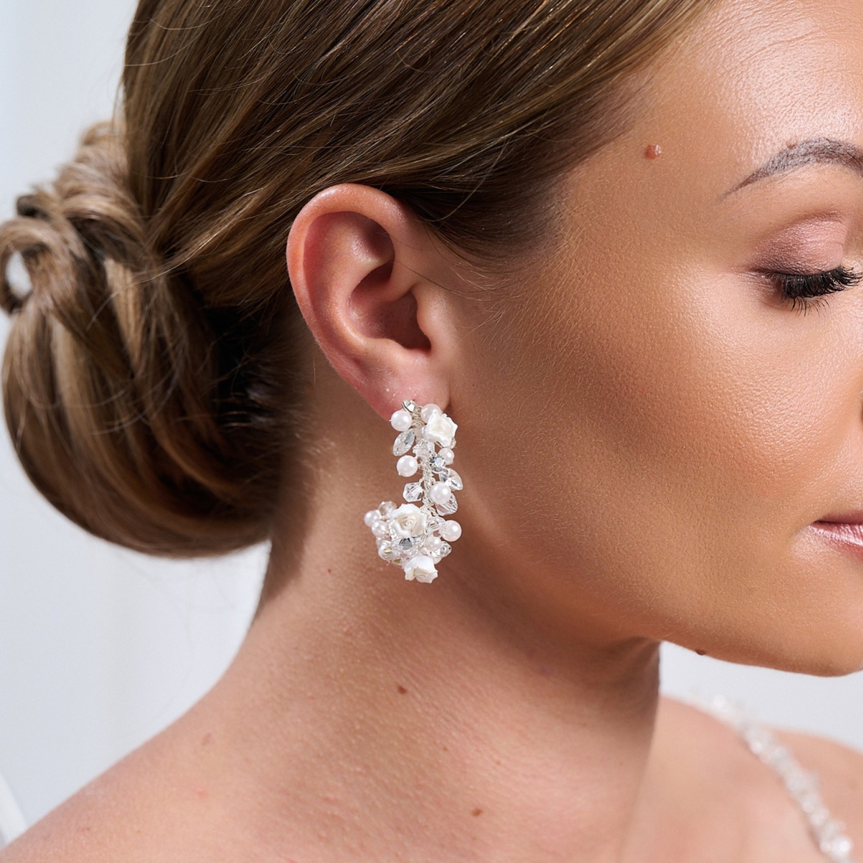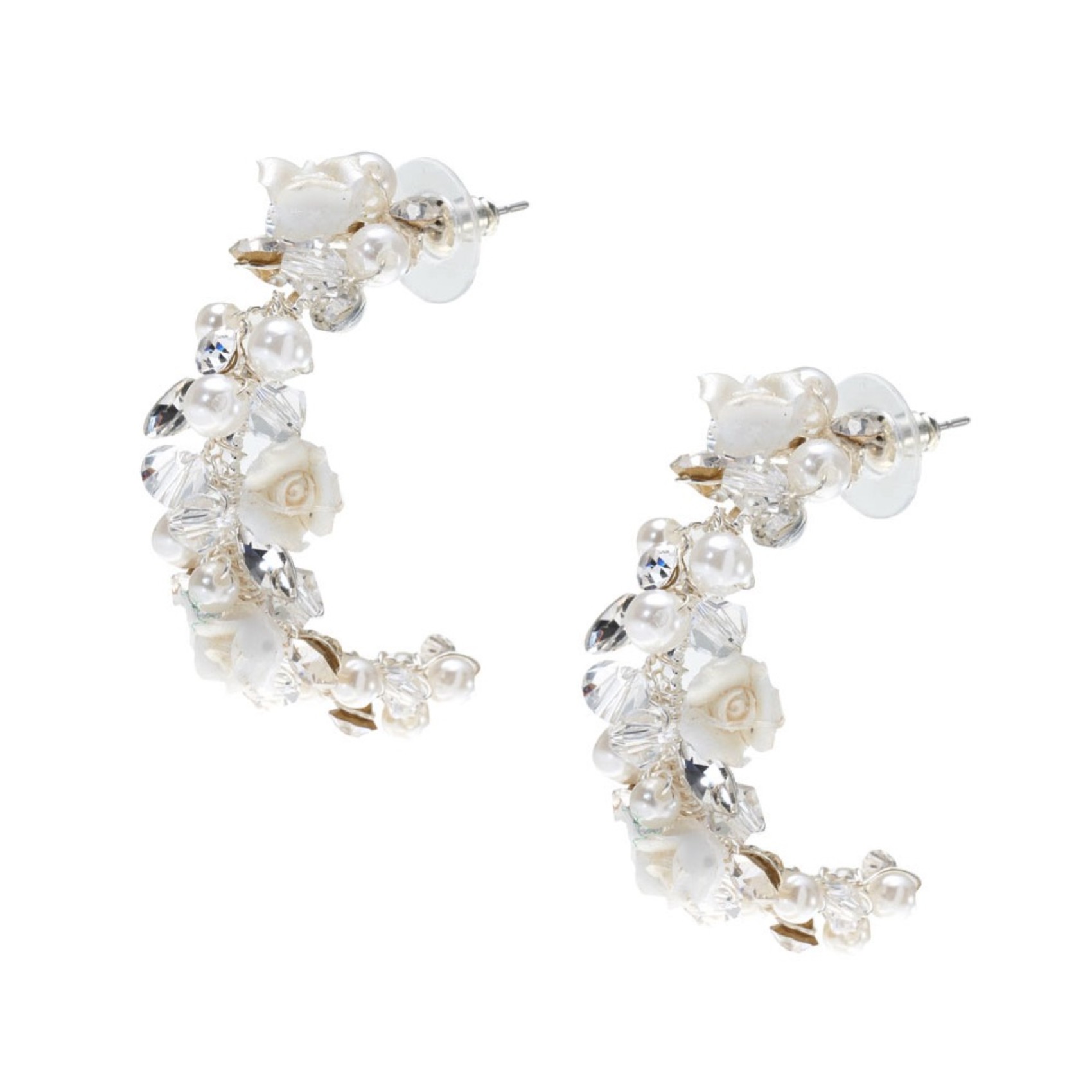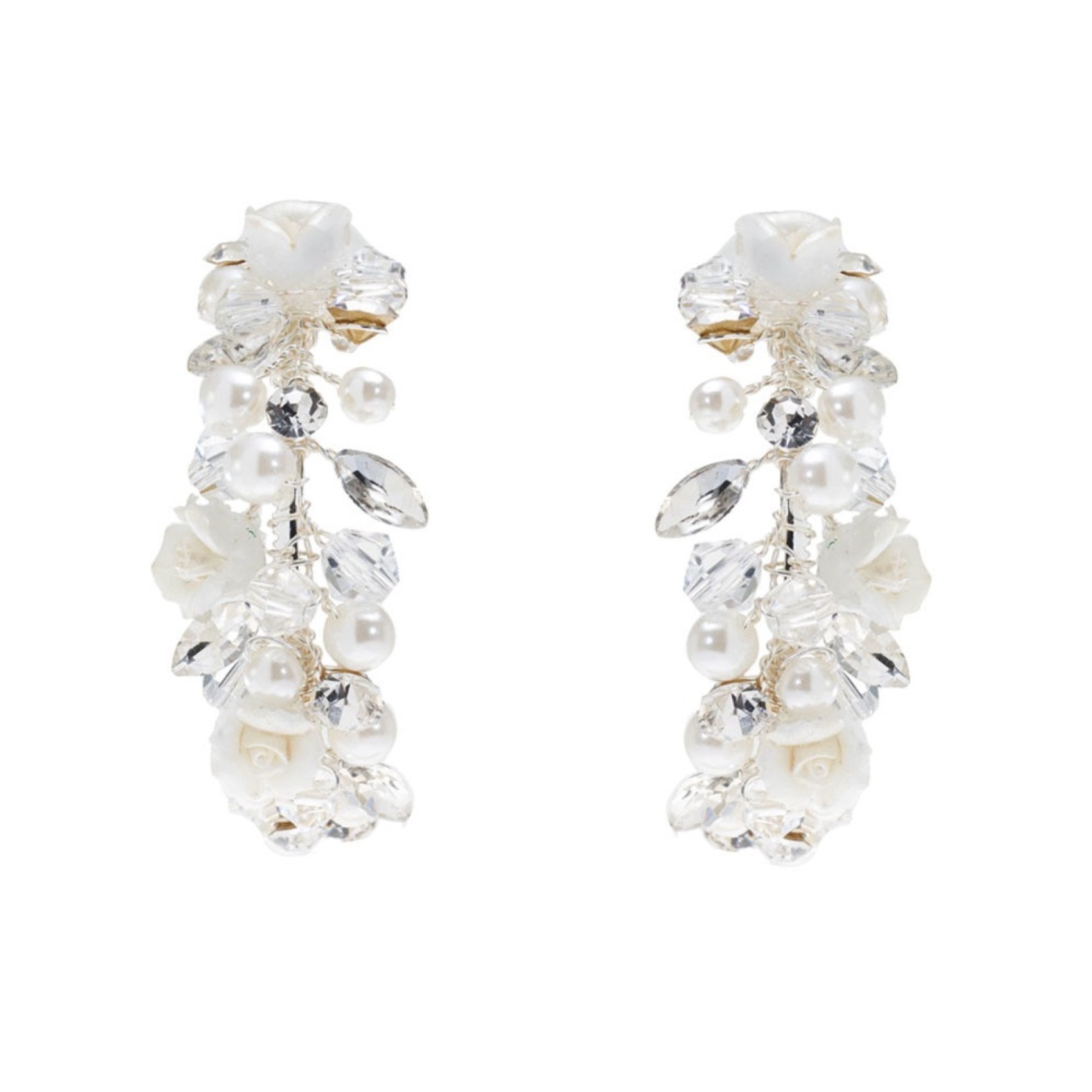 Faites une déclaration florale avec ces boucles d'oreilles uniques en argent de Poirier. Fabriquées à la main avec des fleurs et des perles de porcelaine ivoire, finies avec des perles de cristal clair et des solitaires scintillants pour une touche d'éclat. Parfaites pour les mariées qui veulent que leurs boucles d'oreilles occupent le devant de la scène ! Un choix étonnant pour un mariage bohème.
