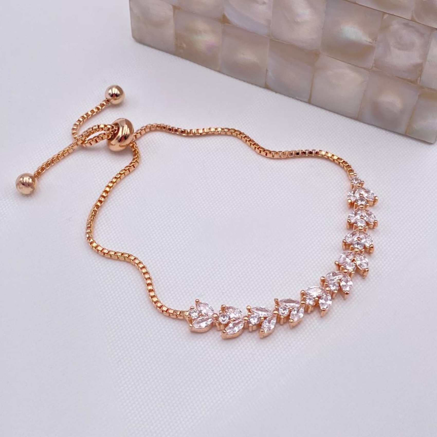 Des cristaux CZ étincelants en forme de feuilles sont intercalés avec des pierres rondes dans ce bracelet réglable en or rose. Ce bracelet est un bijou idéal pour les mariées et les demoiselles d'honneur et constitue un cadeau de mariage idéal.