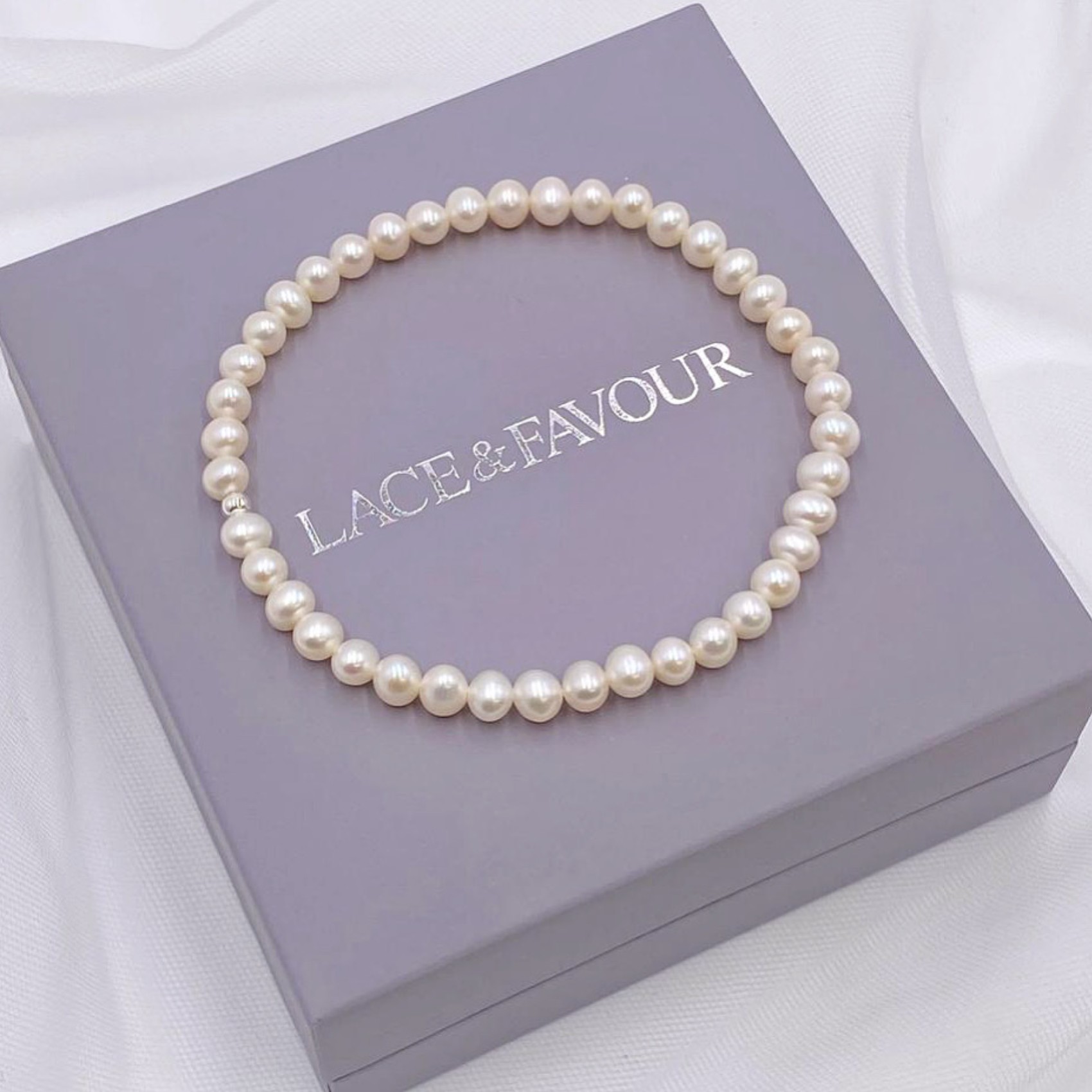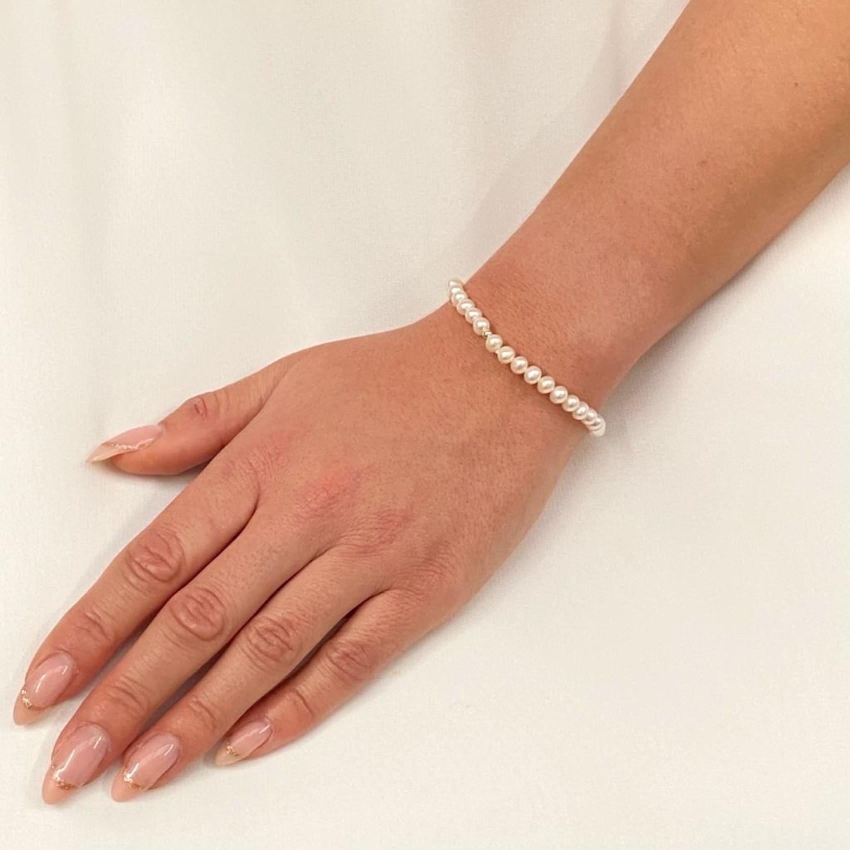 Ce bracelet de perles est simple mais magnifiquement réalisé à la main. Il se compose d'une seule rangée de perles d'eau douce ivoire luminescentes, d'un fermoir argenté délicat et d'un élastique. Conçu pour être porté sur le poignet, il est d'une grande délicatesse. Parfait pour les mariées et les demoiselles d'honneur.