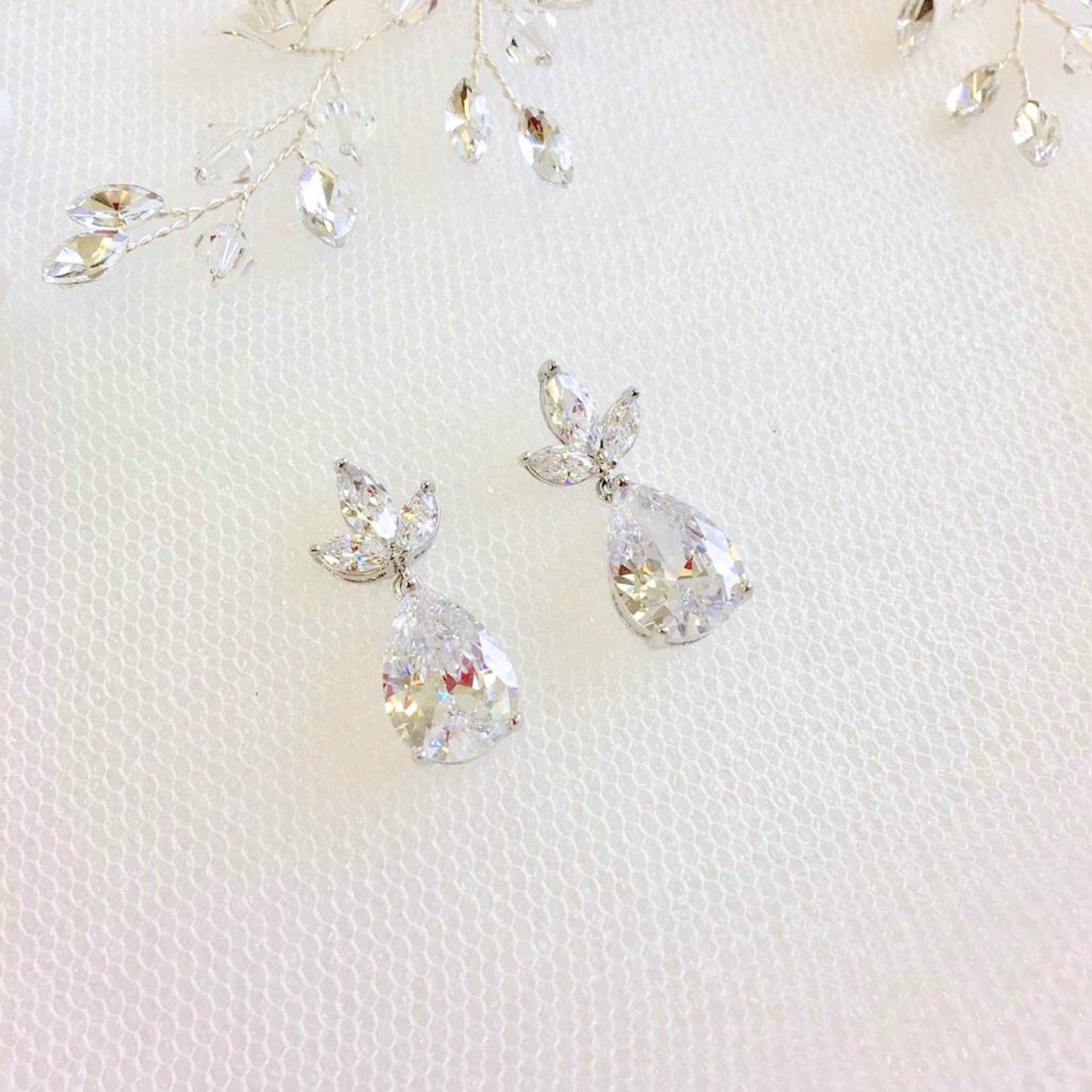 Boucles d'oreilles de mariage chic et étincelantes avec un joli motif de feuilles en cristal de zircon cubique et un gros cristal en forme de goutte d'eau. Parfaites pour les mariées ou les demoiselles d'honneur.