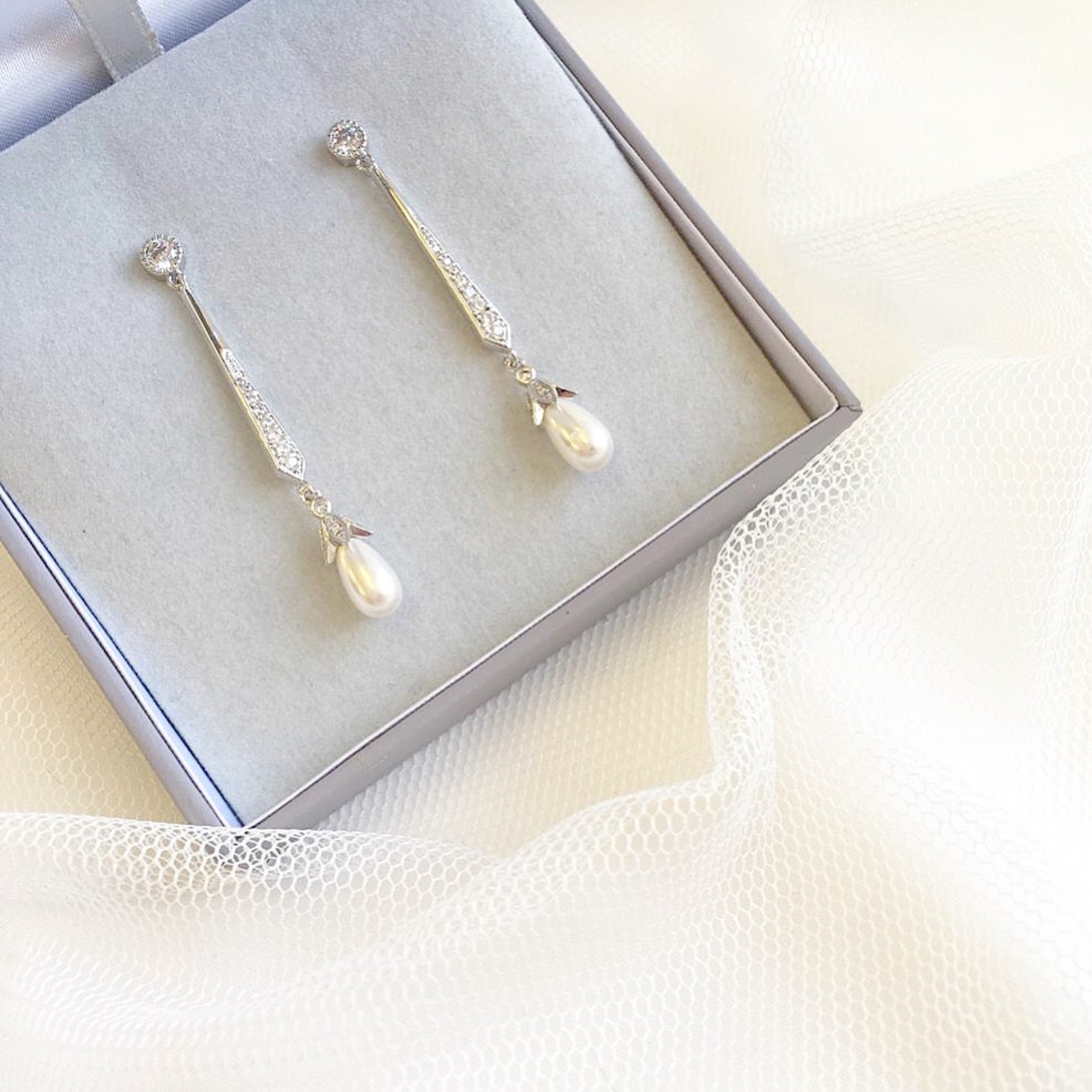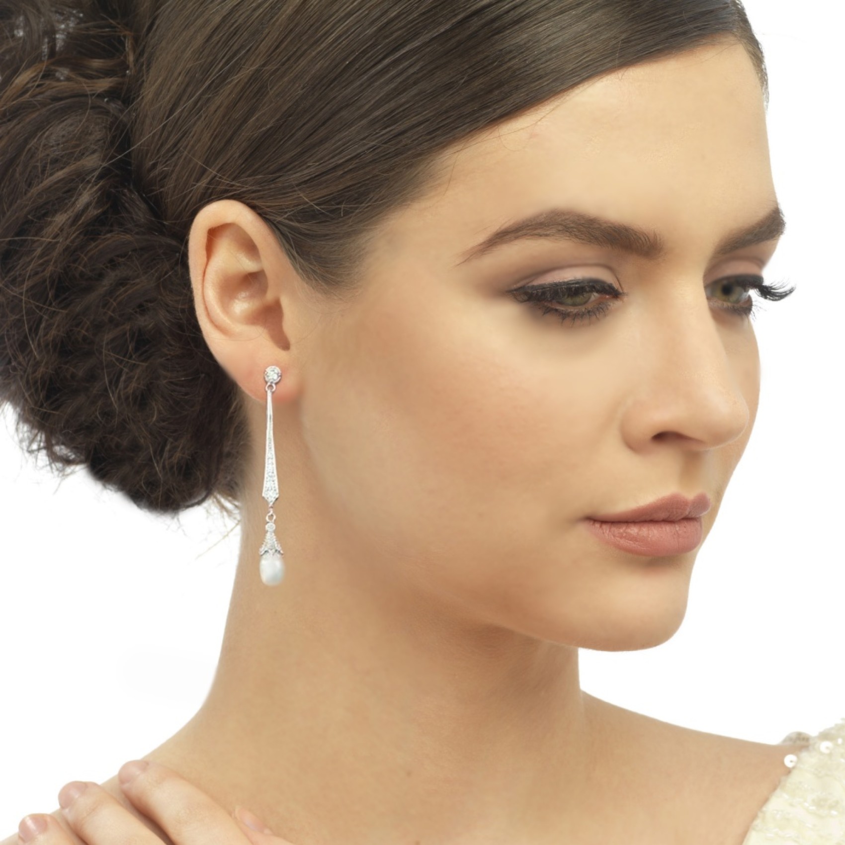 Ajoutez une touche vintage à votre look du jour de votre mariage avec ces longues boucles d'oreilles perlées glamour. Elles sont composées d'un clou étincelant suspendu à une fine goutte de style dague sertie de cristaux CZ scintillants et finies par une goutte de perle d'eau douce ivoire en forme de larme.