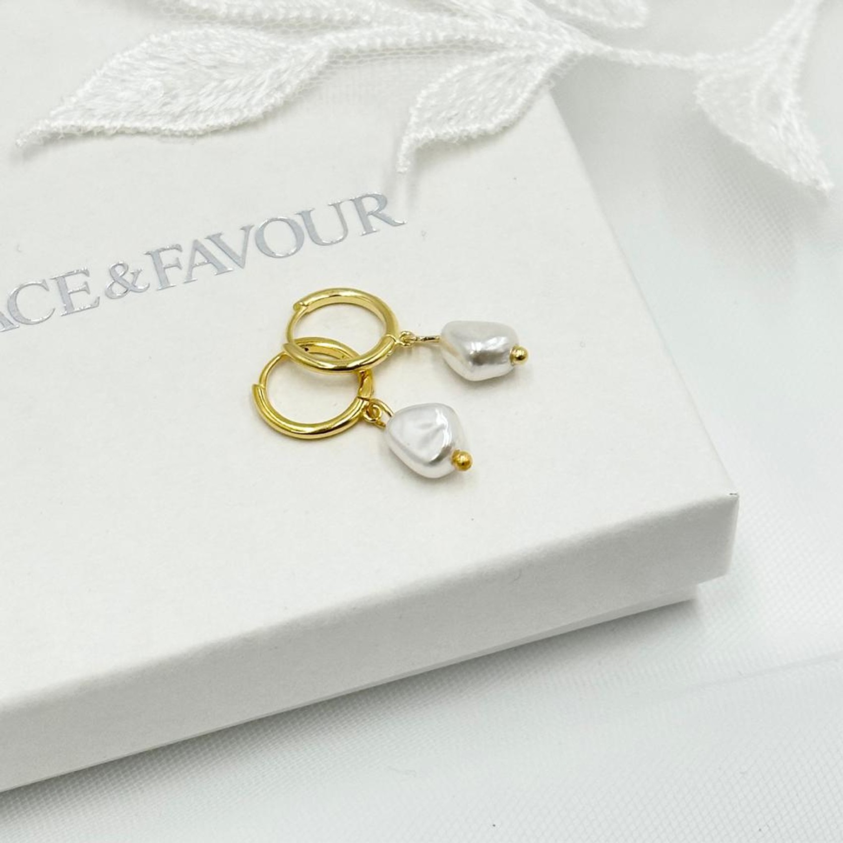 Une délicate boucle d'oreille en plaqué or 18 carats suspendue à une luxueuse perle d'eau douce ivoire. Une paire de boucles d'oreilles unique et élégante pour la mariée moderne et soucieuse de la mode.