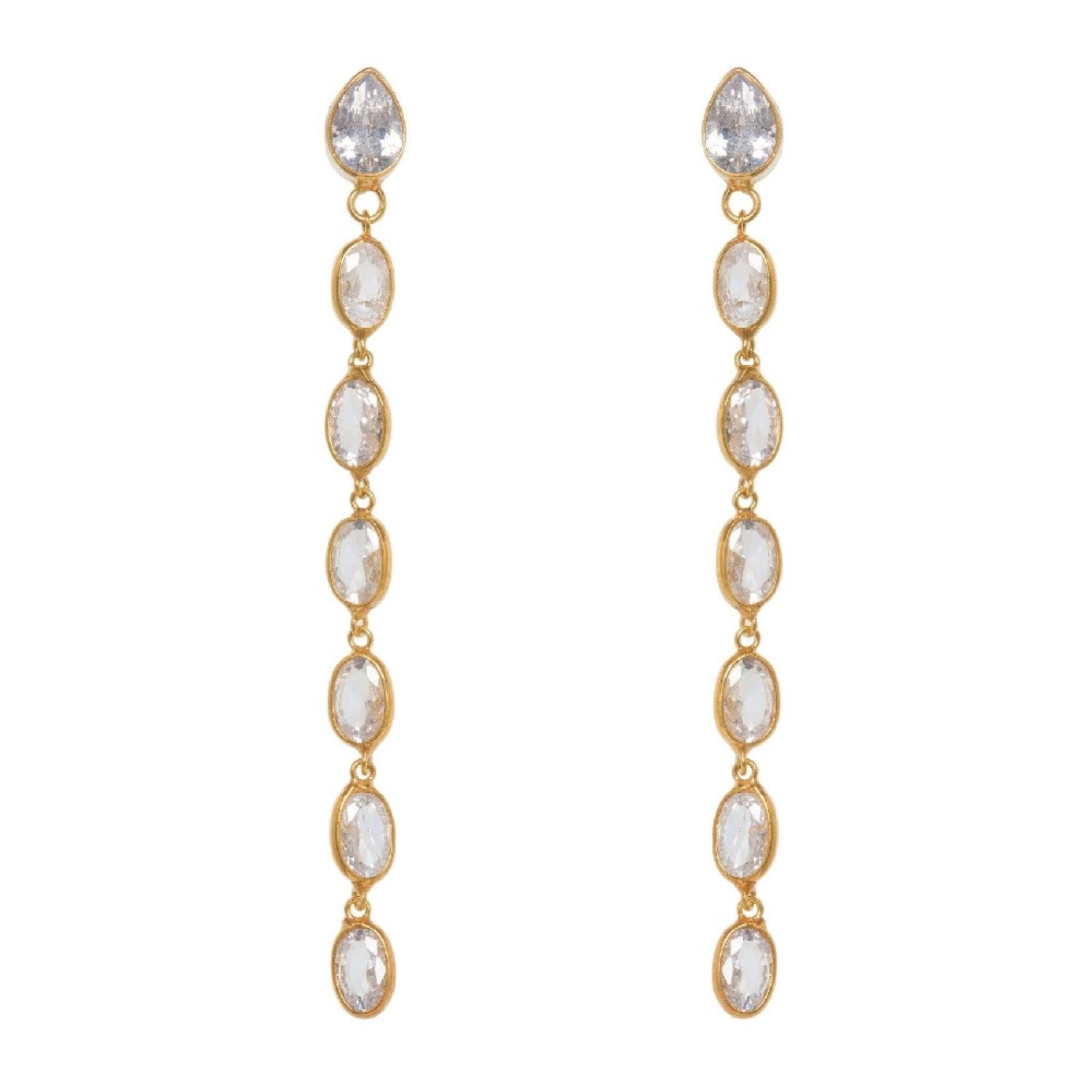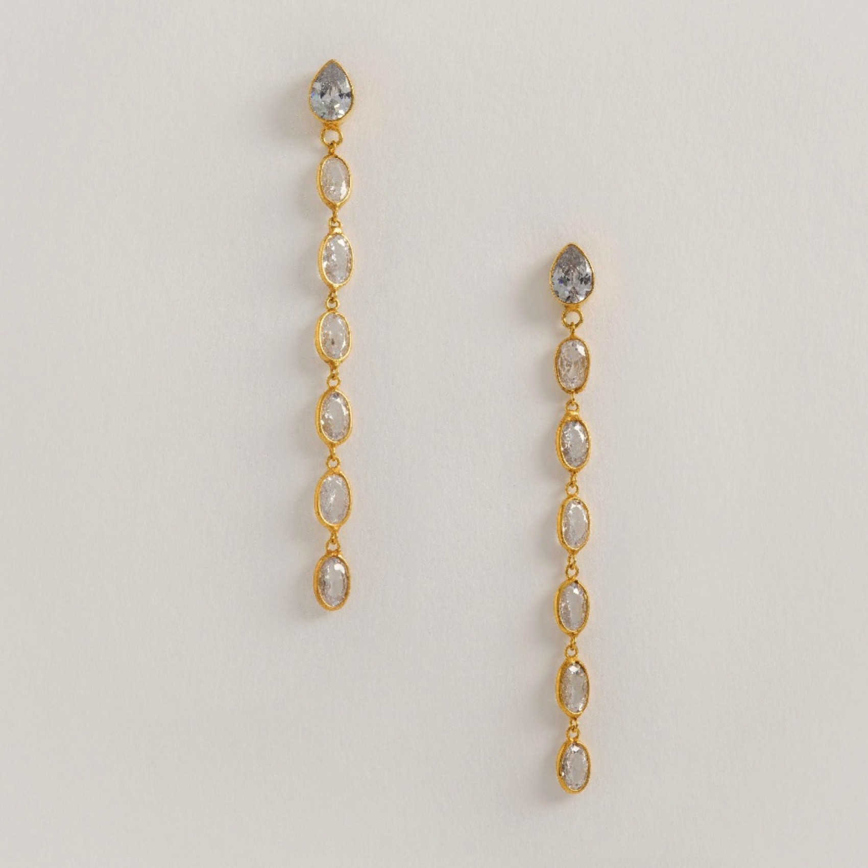 Ajoutez à votre collection de bijoux de créateurs ces divines longues boucles d'oreilles ovales en cristal. Fabriquées à la main à partir d'argent sterling luxueux plaqué or vermeil et de zircon cubique, ces boucles d'oreilles légères de créateur ne manqueront pas d'attirer l'attention des femmes ! Chaque cristal de zircone cubique scintille doucement à la lumière, ce qui en fait la paire la plus élégante pour une occasion opulente. Un bracelet et un collier assortis sont disponibles pour un look vraiment luxueux.