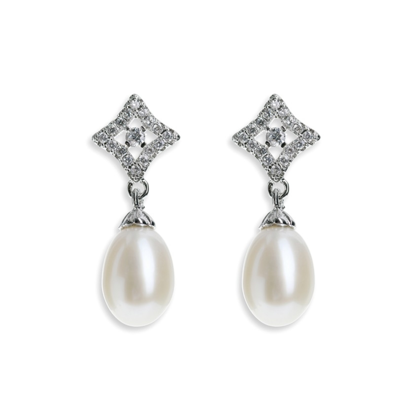 Magnifiques et sophistiquées boucles d'oreilles Maroc par Ivory and Co. Une seule perle ivoire pend sous un petit diamant de pierres pavées scintillantes avec une pierre solitaire scintillante au centre. Le design d'inspiration marocaine ajoute une touche d'originalité à ces boucles d'oreilles classiques en perles et constitue un superbe complément à un look de mariée des années 1920.