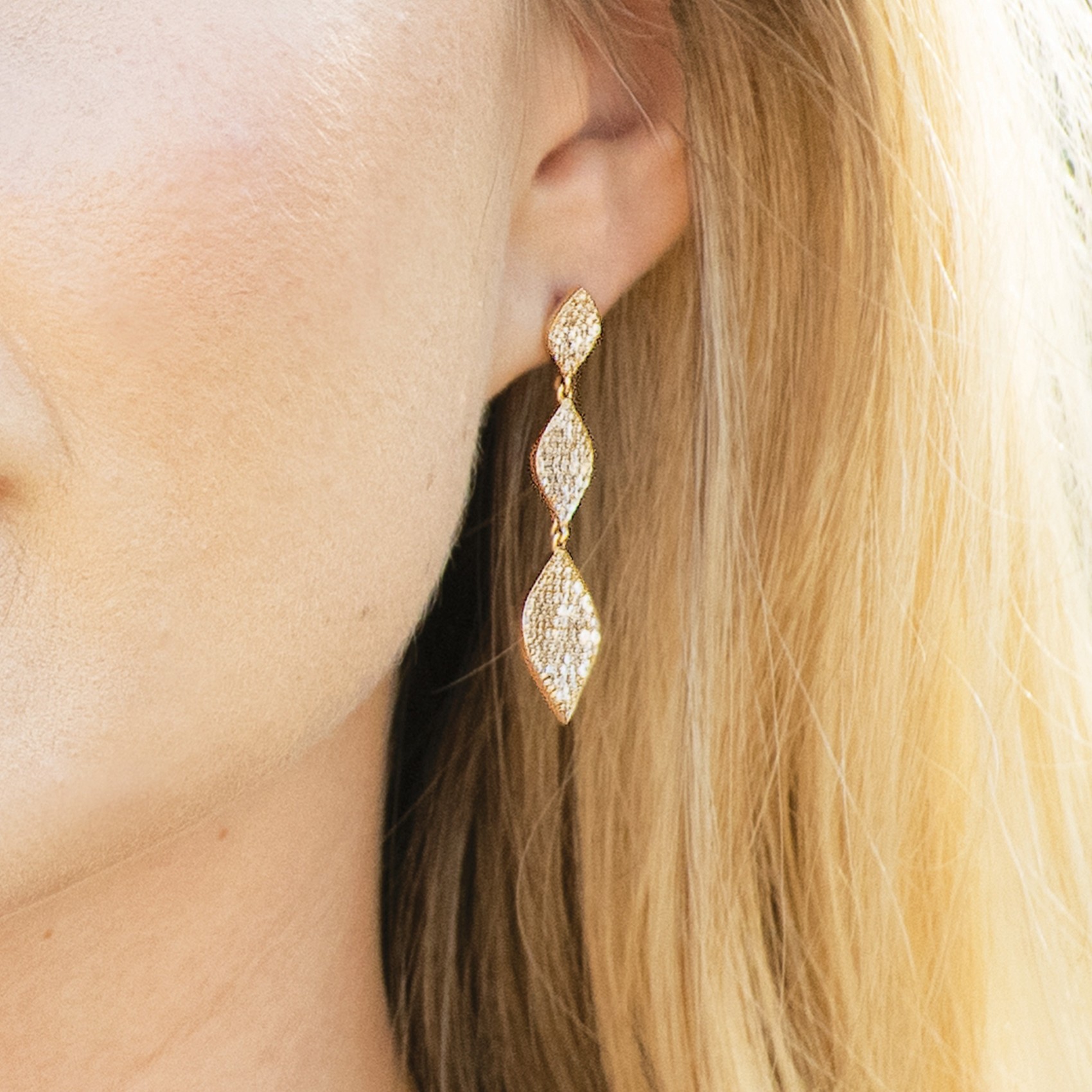 Les boucles d'oreilles Rochelle de Ivory & Co, composées d'un trio de silhouettes en forme de diamant en cascade, sont parfaites pour les mariées modernes et sophistiquées. Elles sont ornées de dizaines de minuscules cristaux facettés sertis de pavés, ce qui leur confère un maximum d'éclat à chaque tour.