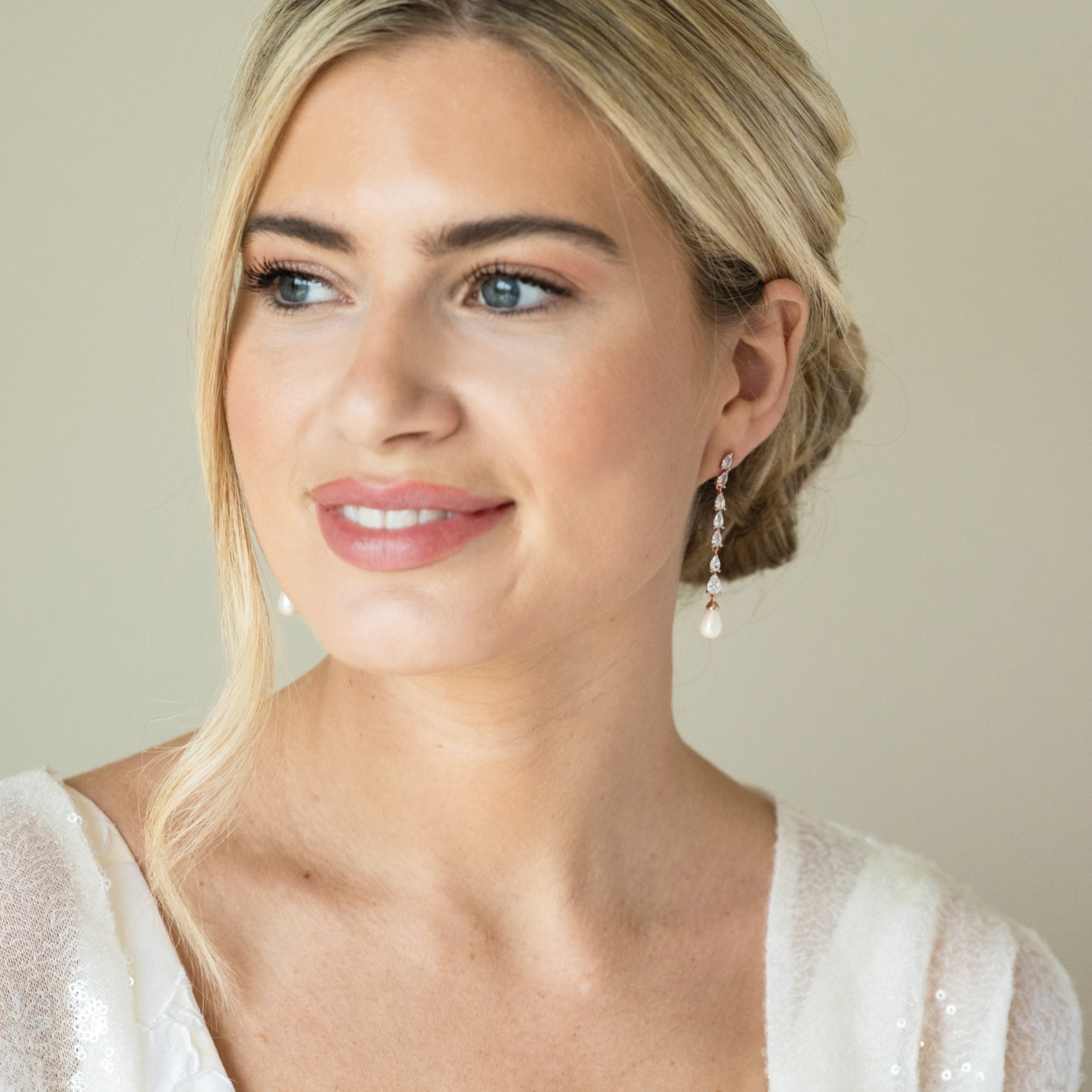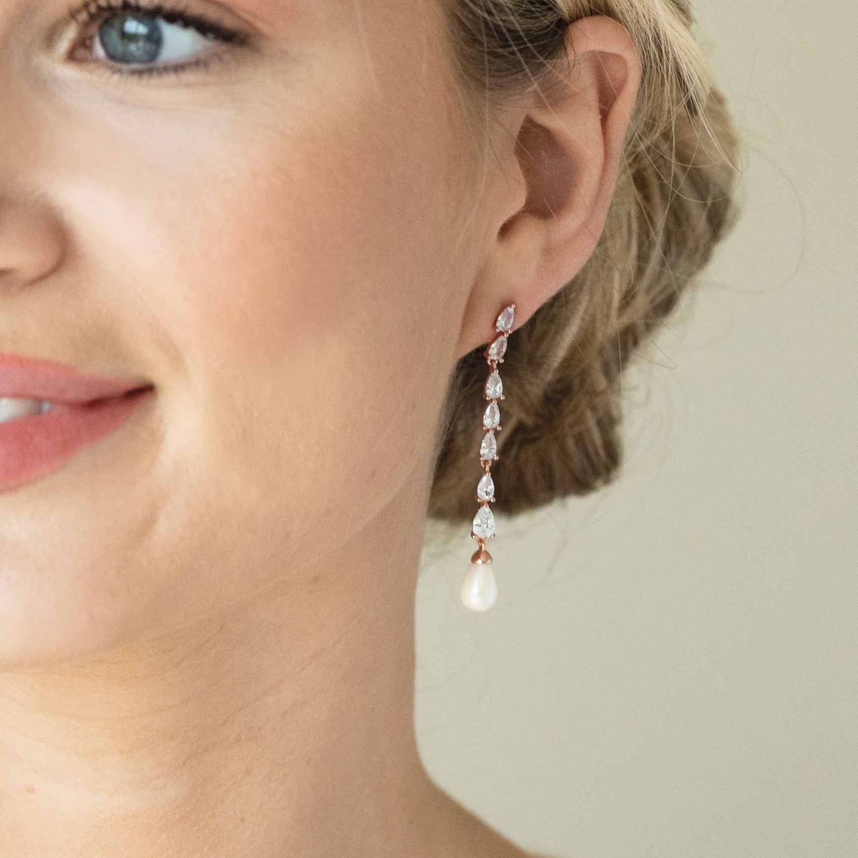 Les boucles d'oreilles de mariage sont de retour sur la scène de la mode nuptiale comme une grande tendance ! Le nouveau modèle Melbourne combine le style d'un designer de pointe et des cristaux facettés étincelants dans une goutte sophistiquée pour un impact maximal. Les boucles d'oreilles Melbourne sont composées d'une seule ligne de zircon cubique en forme de goutte d'eau en or rose et d'une goutte d'eau en perle ivoire. Ce design intemporel avec une touche contemporaine ajoutera un élément frappant à n'importe quel look de mariée.