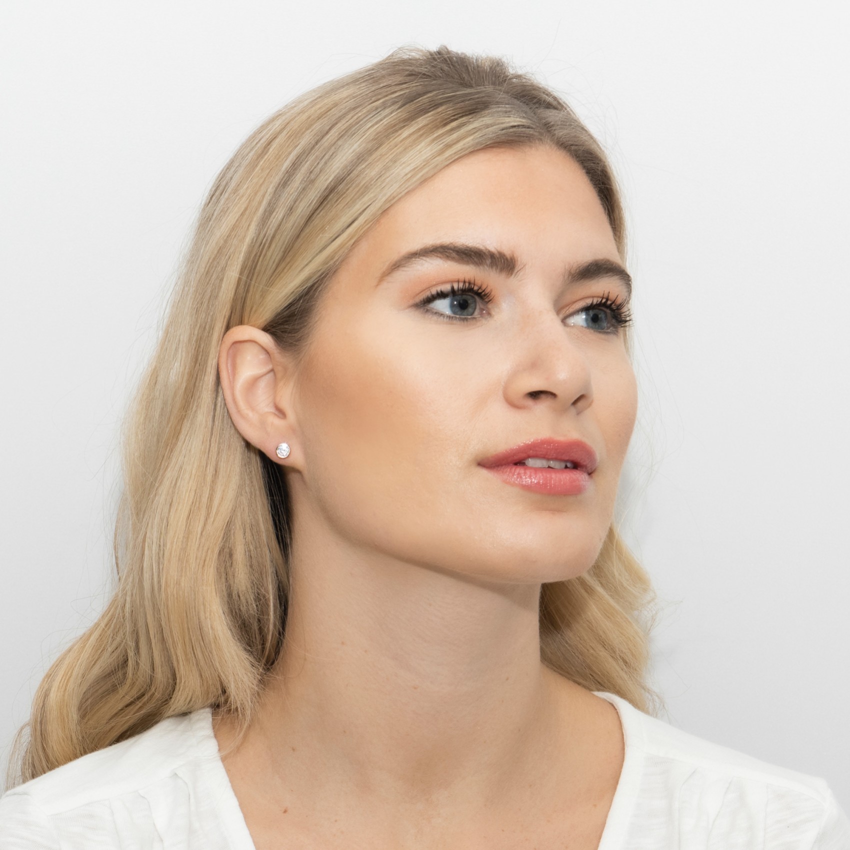 Boucles d'oreilles en cristal d'or rose à la coupe nette pour un attrait intemporel. Elles sont composées de cristaux de zirconium cubique solitaires de taille ronde et brillante et sont dotées d'une tige de boucle d'oreille traditionnelle. Cette jolie paire constitue un magnifique cadeau de demoiselle d'honneur qui pourra être porté à maintes reprises après le grand jour.