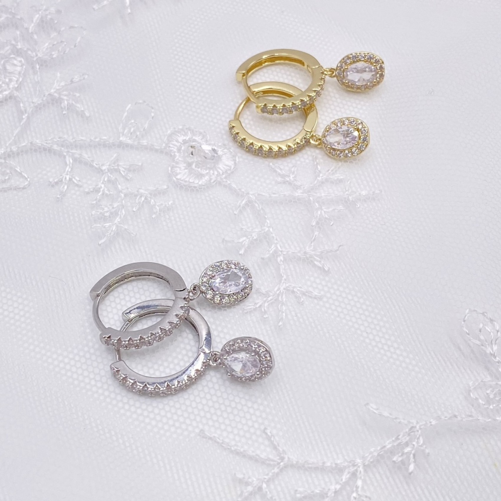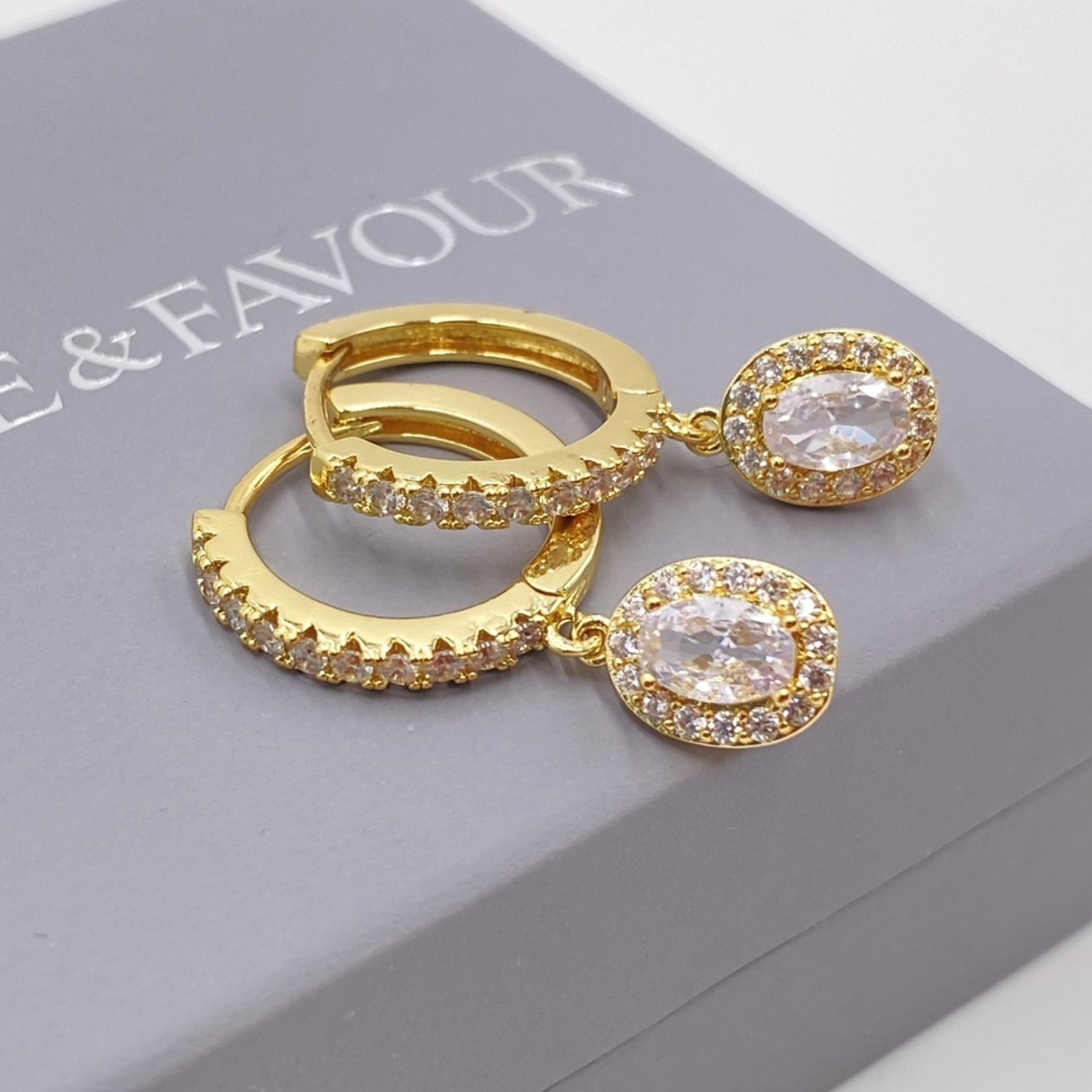 Ces boucles d'oreilles élégantes sont ornées de cristaux et suspendues à une pierre ovale de zirconium cubique scintillante, bordée de cristaux sertis en pavé. Ces boucles d'oreilles en or sont un choix magnifique pour la mariée moderne qui recherche quelque chose de délicat avec beaucoup d'éclat !