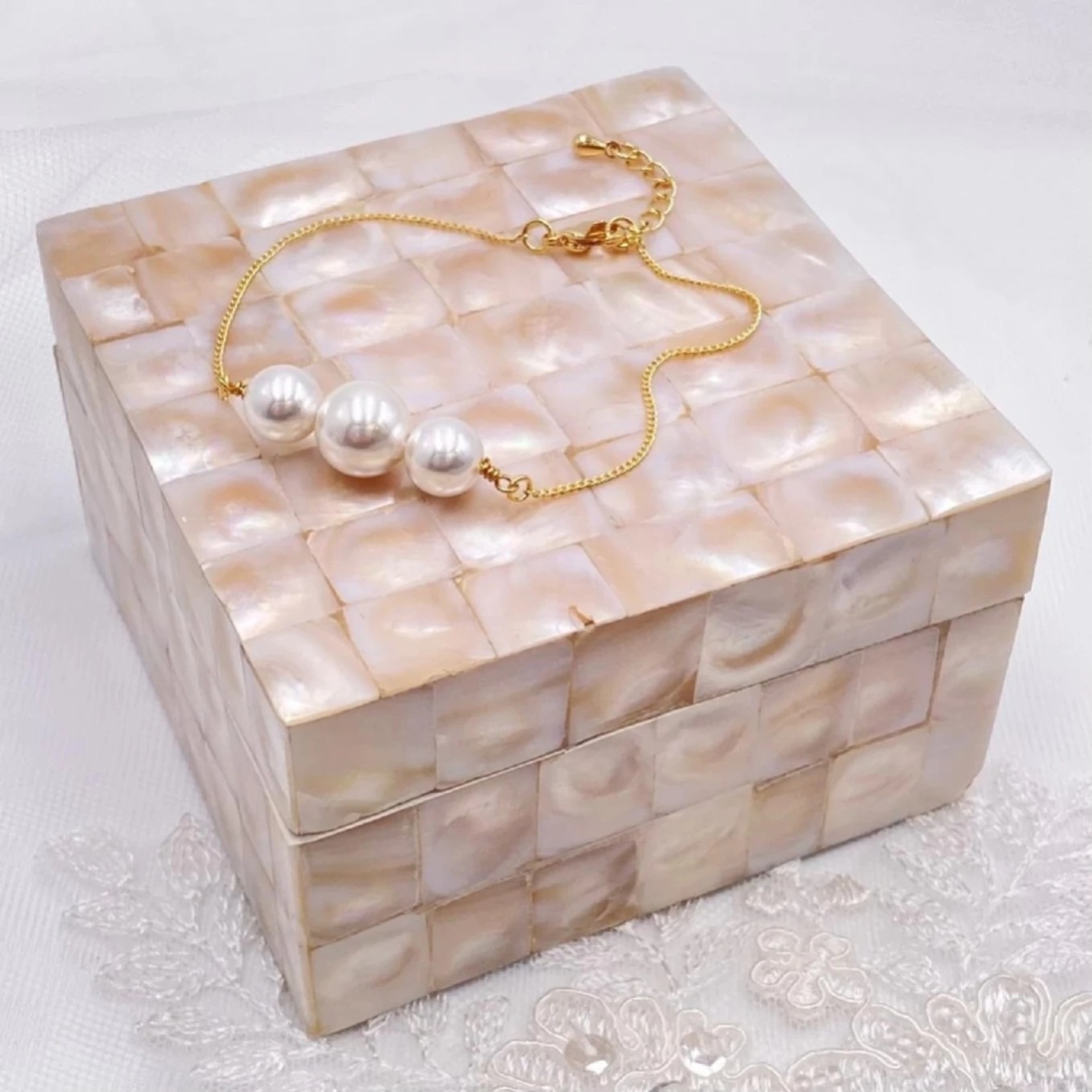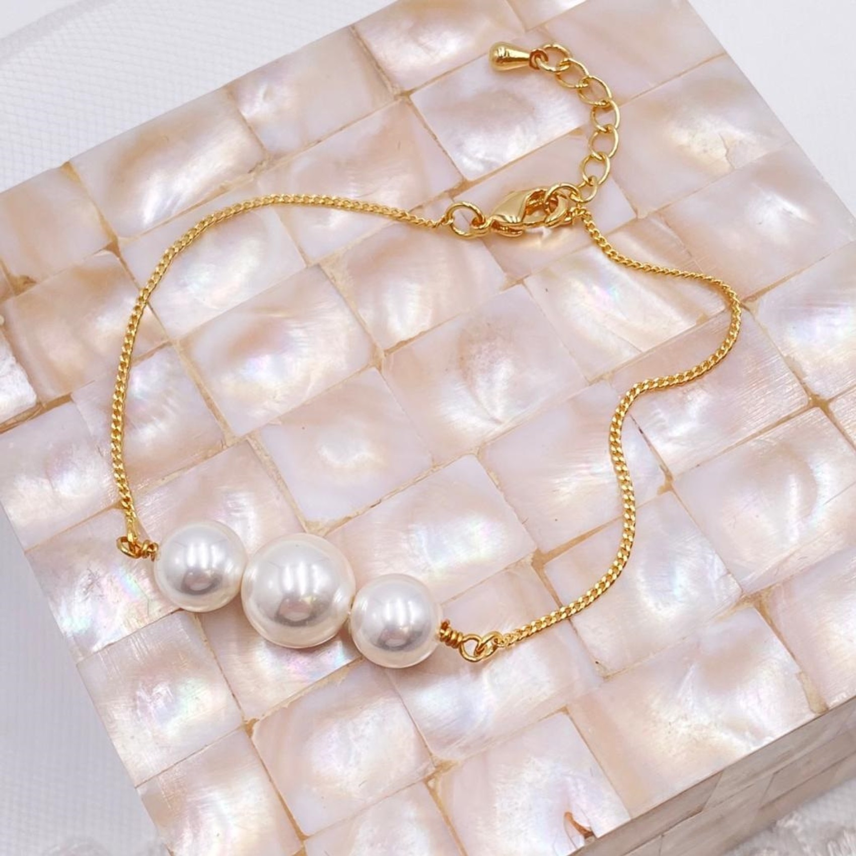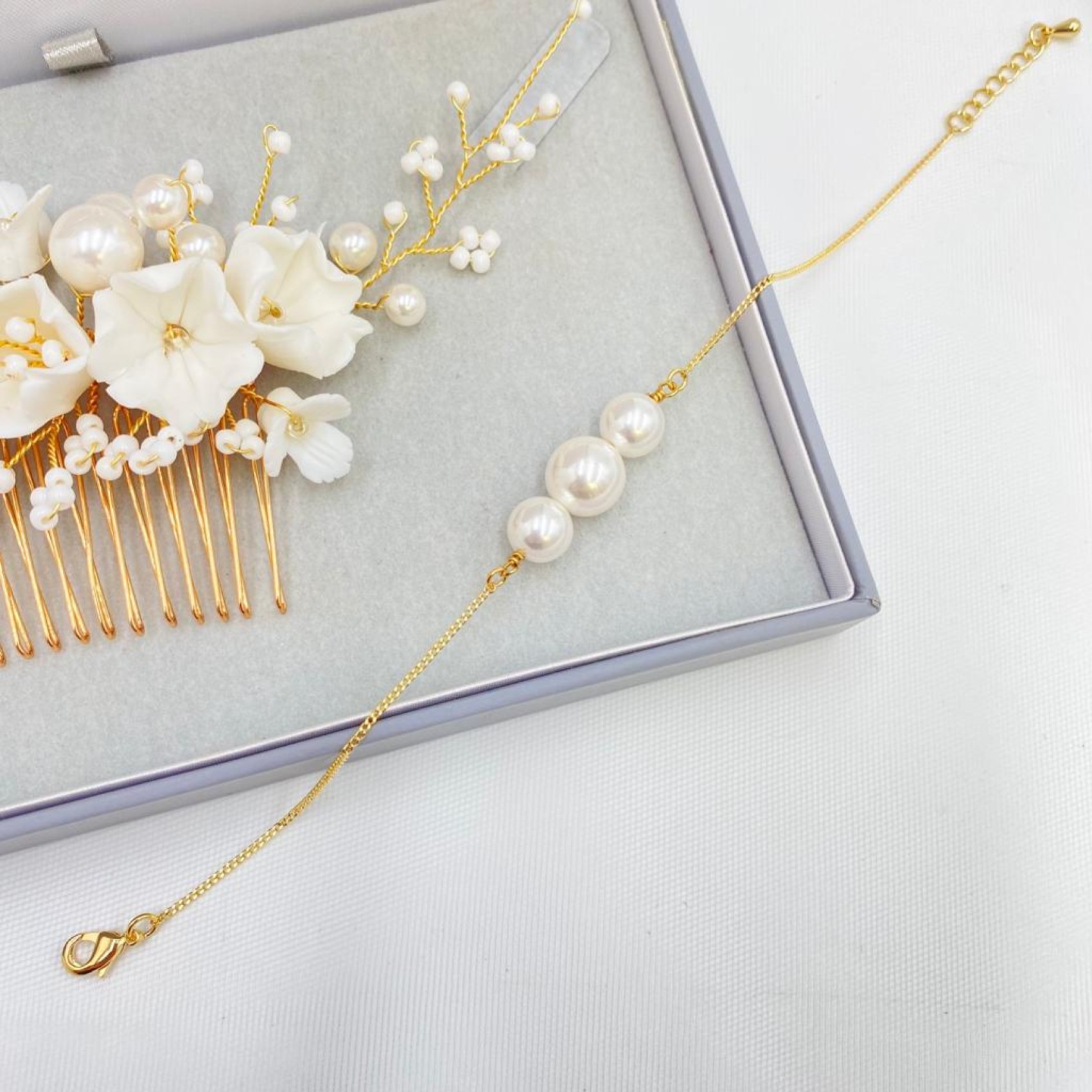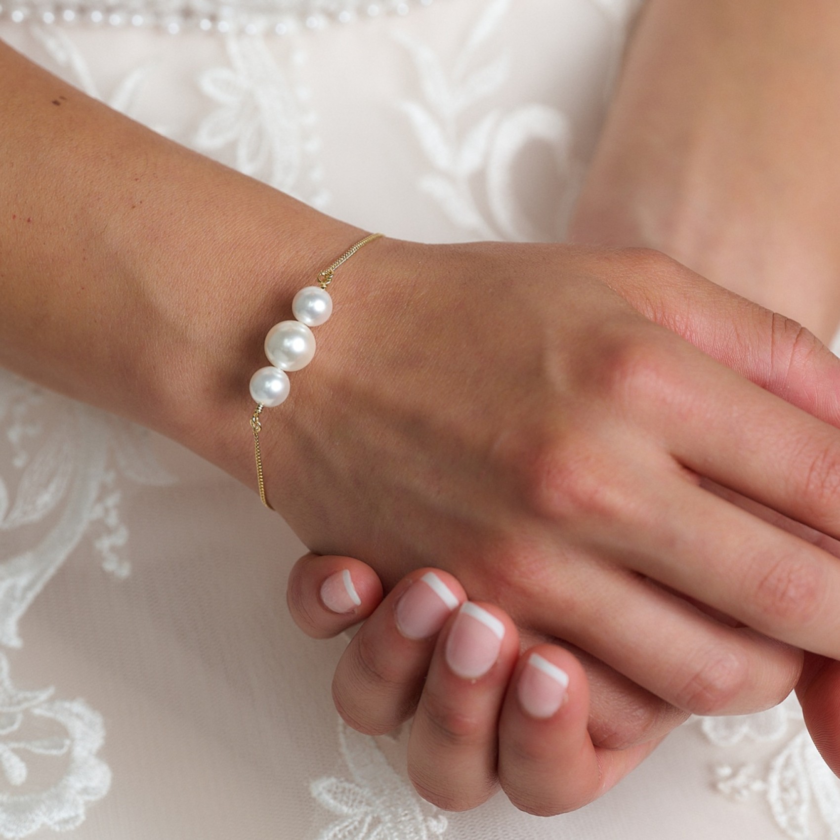 Un trio de perles scintillantes sur une délicate chaîne en or constitue un bijou de mariage à la fois simple et élégant. Notre bracelet Sadie est présenté dans une petite boîte à bijoux, ce qui en fait le cadeau idéal pour les mariées et les demoiselles d'honneur.