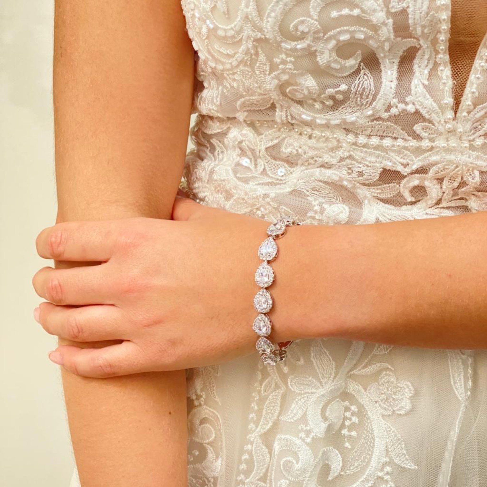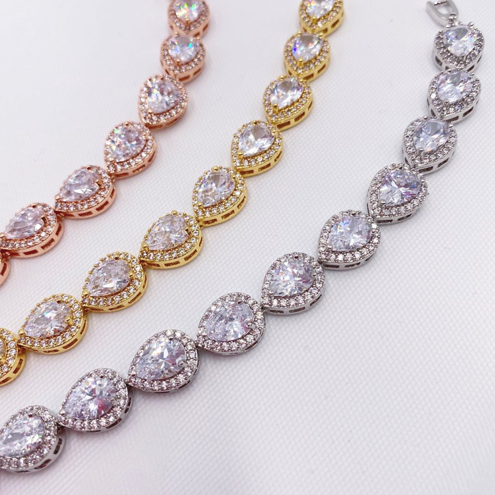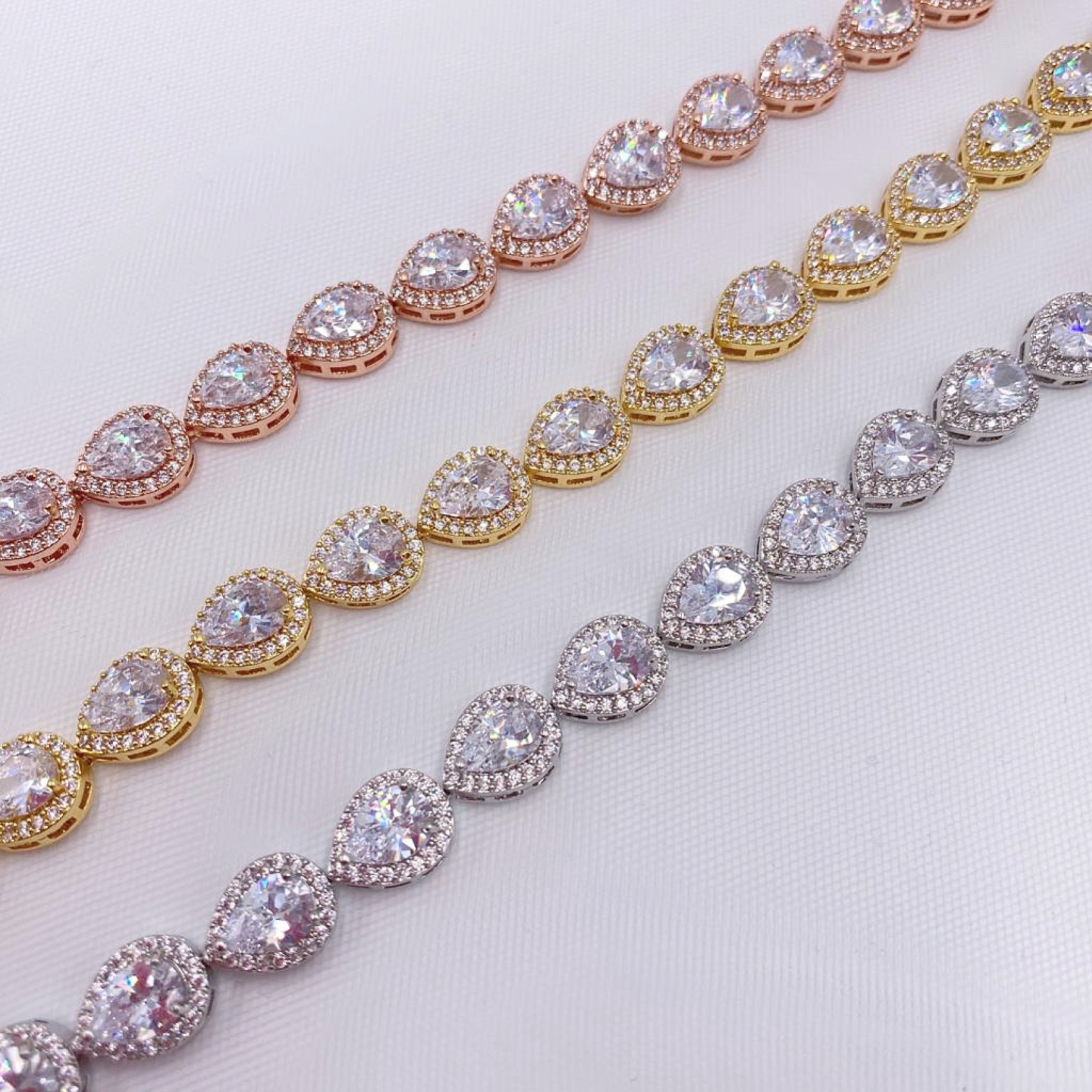Ce bracelet de mariage orné de cristaux ajoute une touche d'éclat diamantaire au poignet. Il est orné de pierres de zircon cubique en forme de gouttes facettées, chacune ornée de cristaux pavés scintillants. Il se ferme à l'aide d'un fermoir à boucle déployante. Les pierres de ce bracelet s'accordent avec de nombreuses alliances et bijoux, faisant de ce magnifique bracelet un choix classique pour les mariées.
