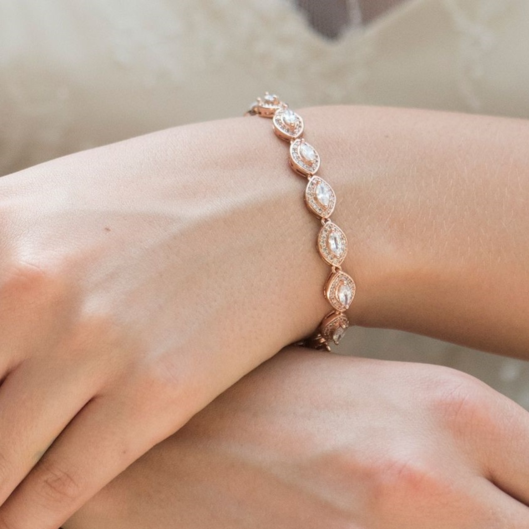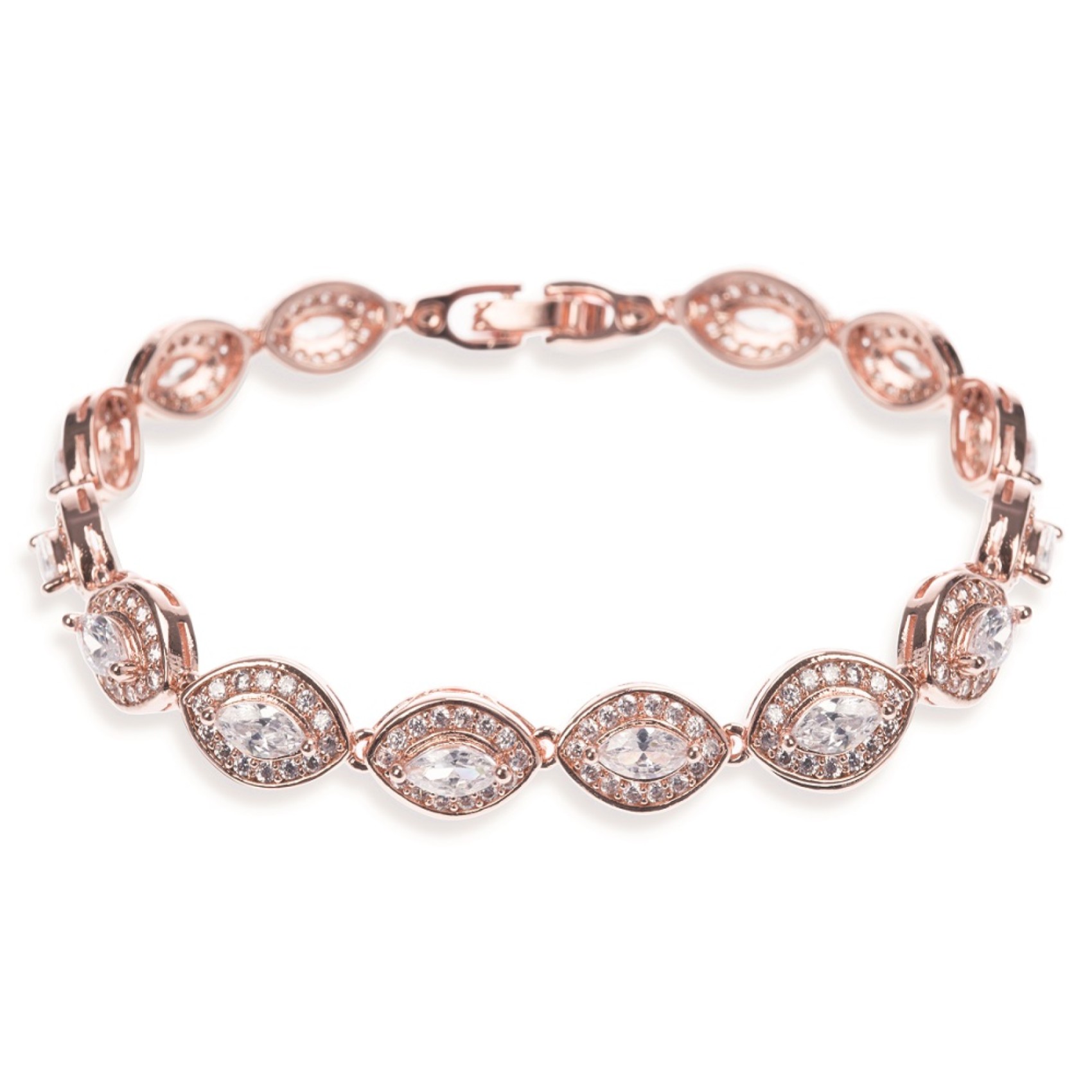 Ce délicat bracelet en cristal d'or rose présente une ligne brillante de pierres marquises en CZ, bordées de minuscules cristaux sertis en pavé pour un effet scintillant. Ce bracelet élégant est un ajout magnifique à un look de mariée classique et est totalement indémodable. Il est également idéal comme bijou de demoiselle d'honneur.