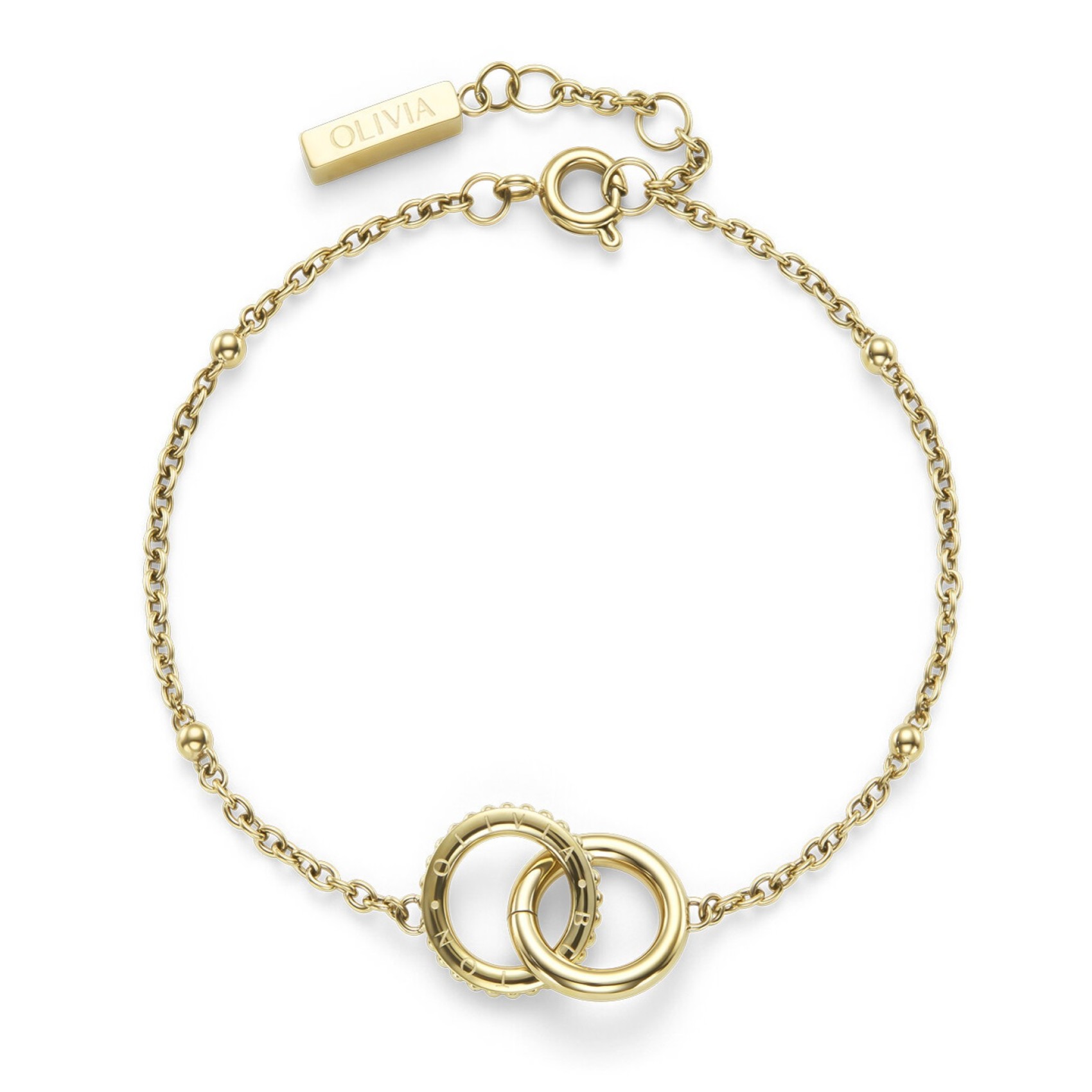 Symbole de l'éternité et de l'union, ce bracelet plaqué or présente des anneaux entrelacés, agrémentés de minuscules perles de caviar, pour un effet vraiment intemporel. Fini par une chaîne de perles très tendance, cette pièce significative constitue le cadeau idéal ou un cadeau d'amour personnel.