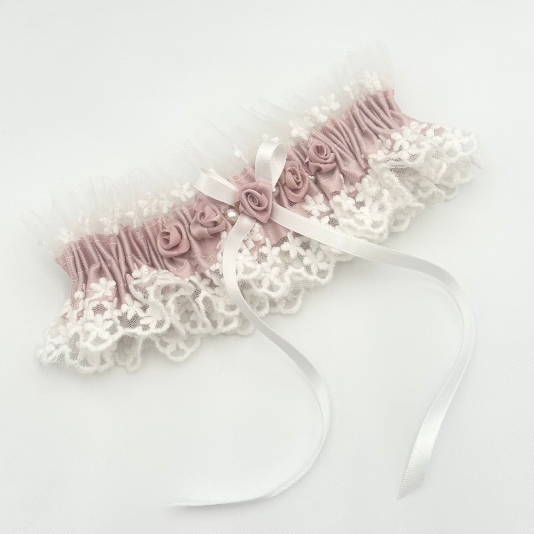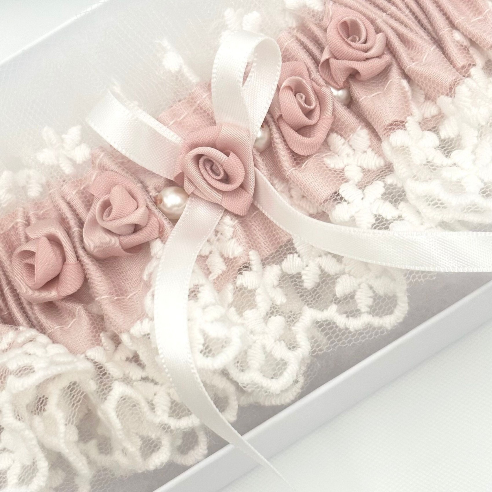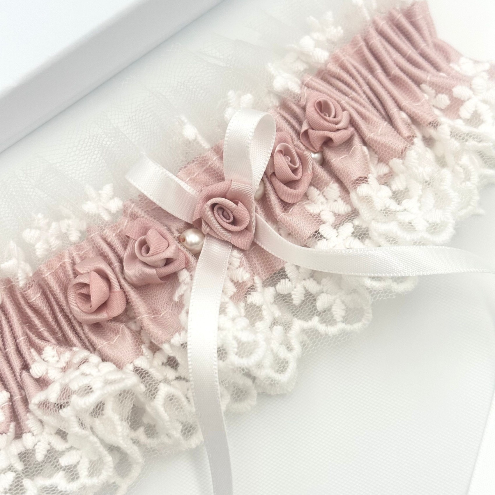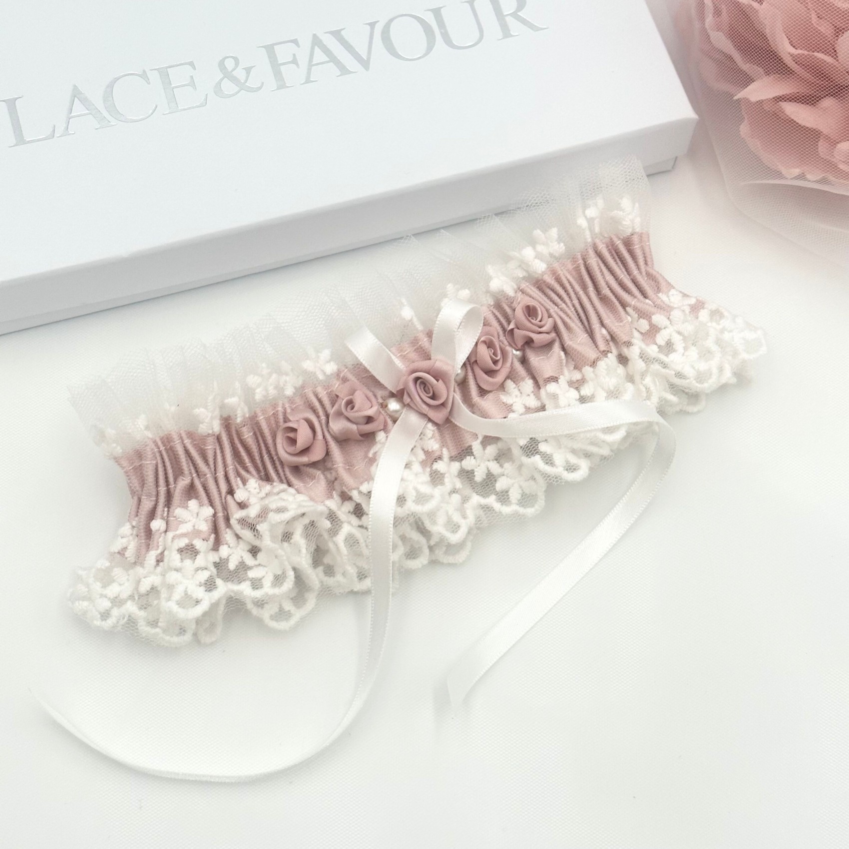 Rhapsody Blush Silk and Ivory Tulle Vintage Lace Garter with Rose Detail (jarretière en soie et tulle ivoire avec détails de roses) | LFG009BSH