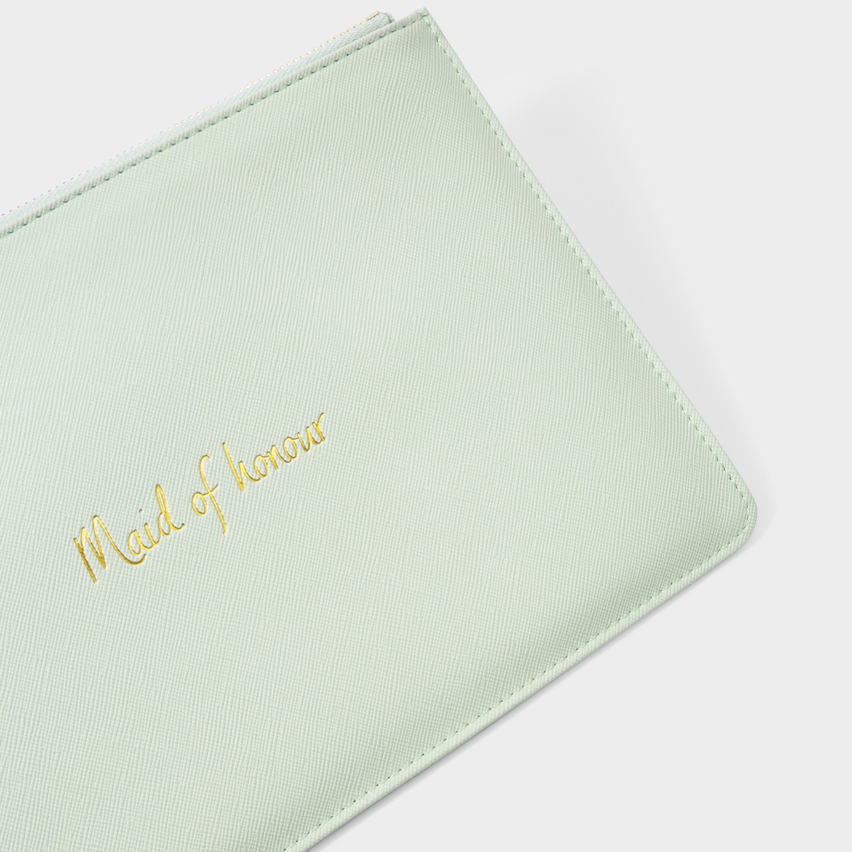 Cette magnifique pochette vert sauge "demoiselle d'honneur" est ornée de lettres métalliques dorées et d'une fermeture à glissière dorée. Un joli souvenir et une petite pochette pratique qu'elles pourront garder à portée de main le jour J.