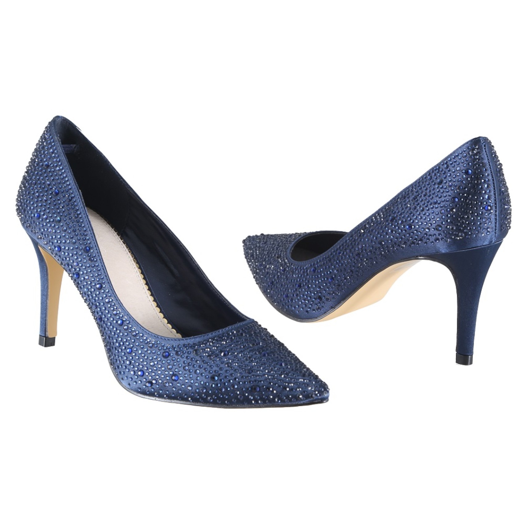 Escarpins en satin marine incrustés de diamants étincelants, dotés d'un bout délicatement pointu, d'un talon fin et d'une semelle intérieure en cuir de luxe. Une magnifique chaussure de mariée, ou pour la mère de la mariée, les demoiselles d'honneur ou même les invitées ! Parfaites pour toute occasion spéciale. Entièrement doublées de cuir souple et dotées d'un rembourrage supplémentaire dans la chaussette, elles vous permettent de vous sentir aussi belle que vous êtes belle. Disponibles en argent, nude, marine ou noir.