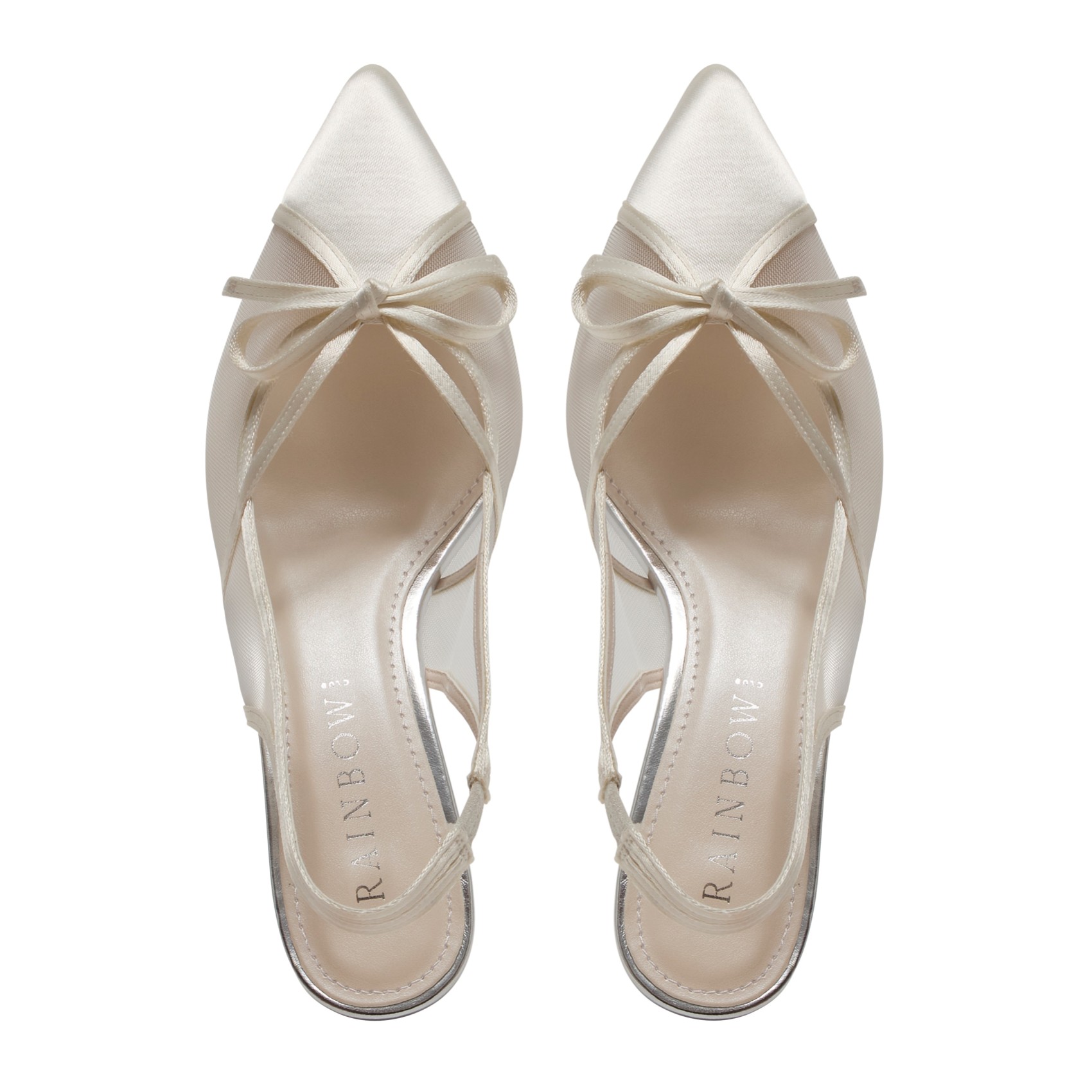Chaussures de mariée au charme vintage, les nouvelles sandales Olivia apportent une touche de fantaisie à votre mariage. Alliant une délicate maille ivoire à notre satin ivoire emblématique, elles présentent un bout pointu, un joli nœud en ruban, des lanières élastiques à l'arrière, des finitions argentées et un talon bobine de 5 cm. Conçues pour être vues, elles seront parfaites sous une robe de mariée longueur ballerine.