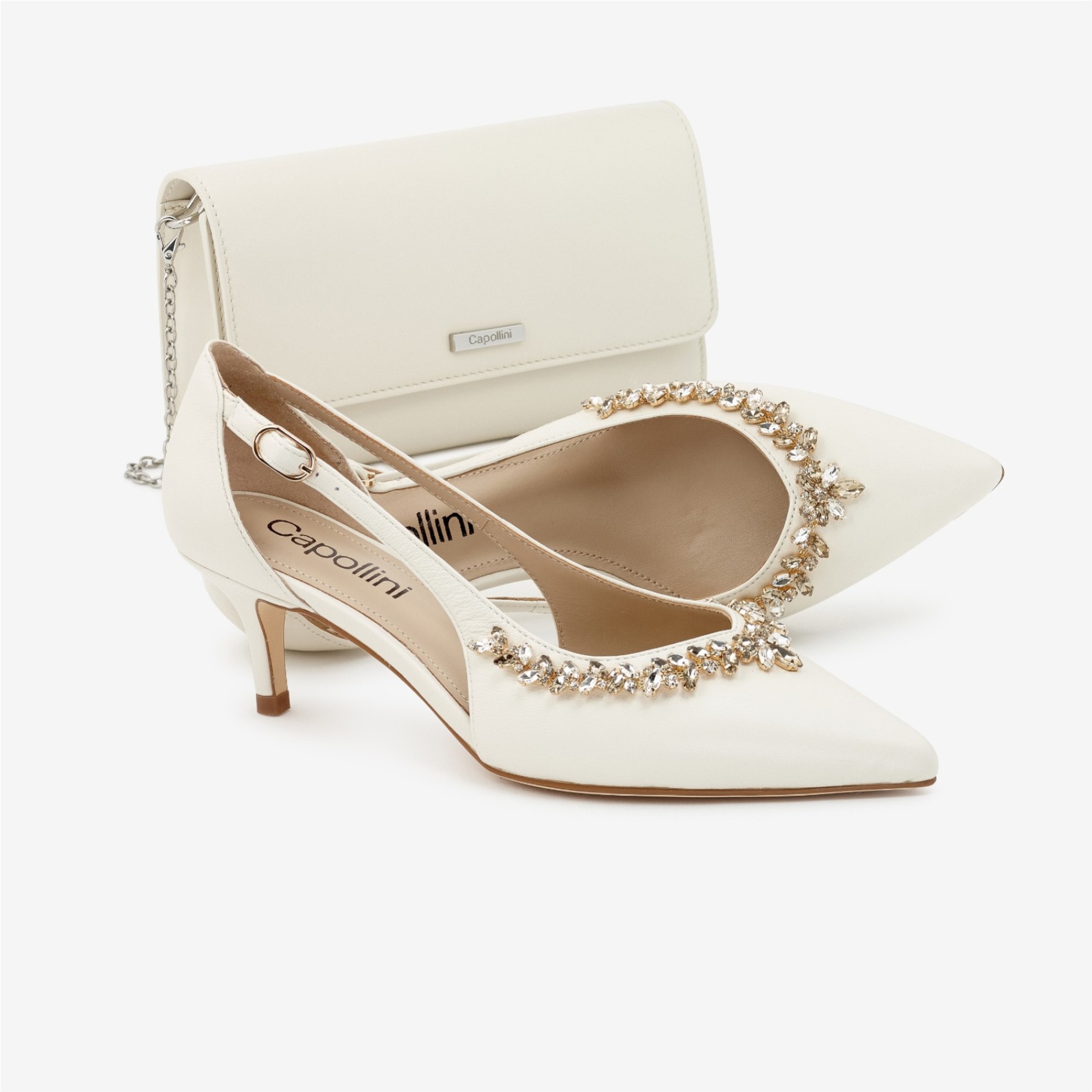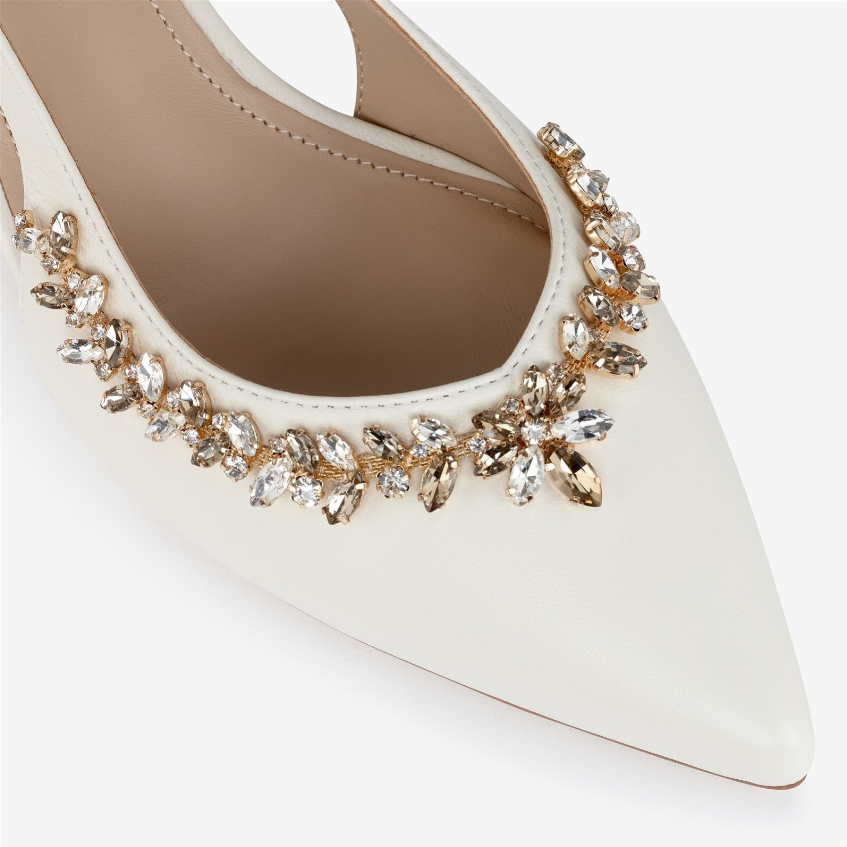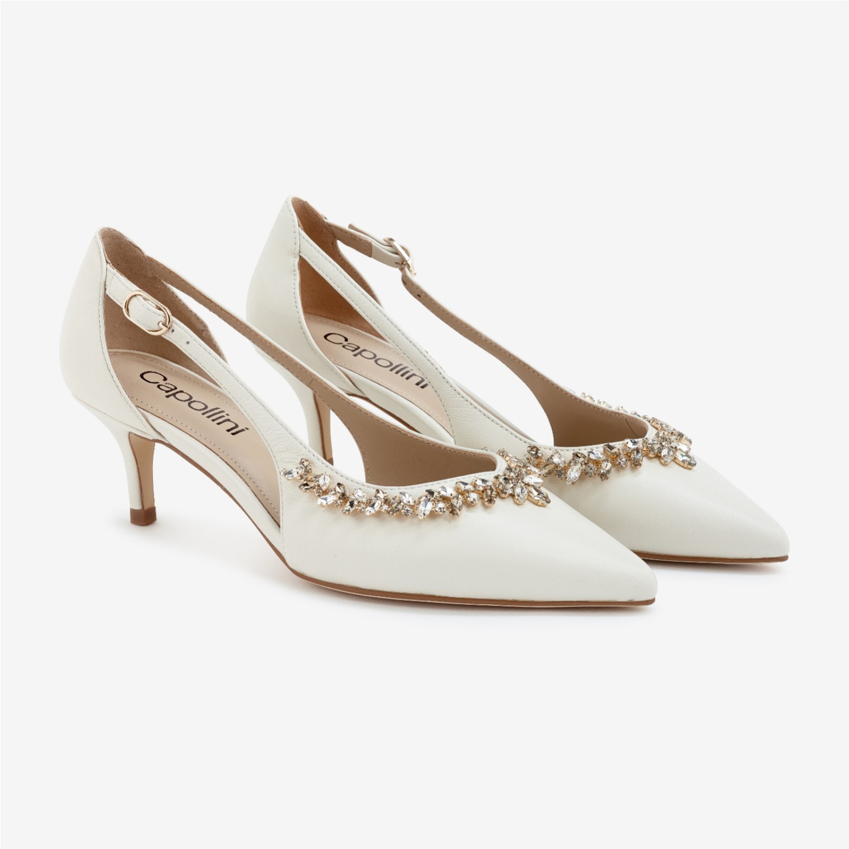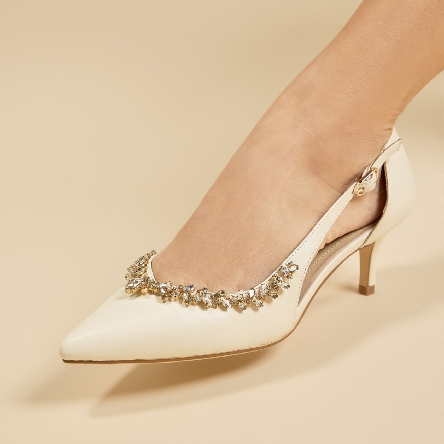 Élégantes et raffinées, ces escarpins à talons moyens et bouts pointus sont confectionnés dans un cuir porcelaine crémeux pour un charme intemporel. Le bout pointu et les côtés échancrés créent une silhouette flatteuse, tandis qu'une magnifique décoration en cristal doré ajoute une touche d'éclat. Montés sur un talon aiguille confortable de hauteur moyenne, ils offrent un équilibre parfait entre style et confort. Idéaux pour les occasions spéciales, les mariages ou les tenues quotidiennes soignées, ces escarpins apportent une touche de glamour discret à toutes vos tenues.