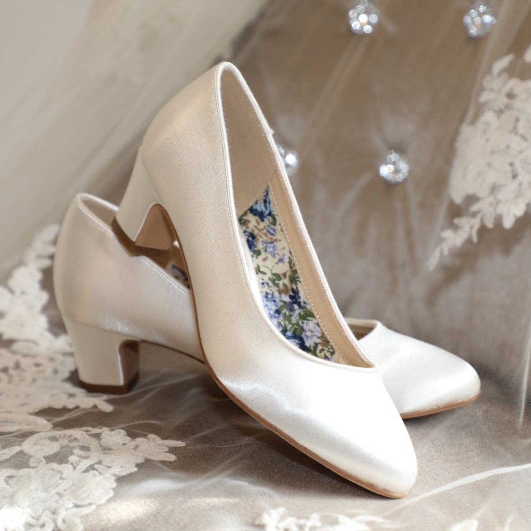 Cet escarpin de mariage classique à la coupe large est réalisé en satin ivoire teintable et présente un élégant bout en amande et un talon bloc stylisé.