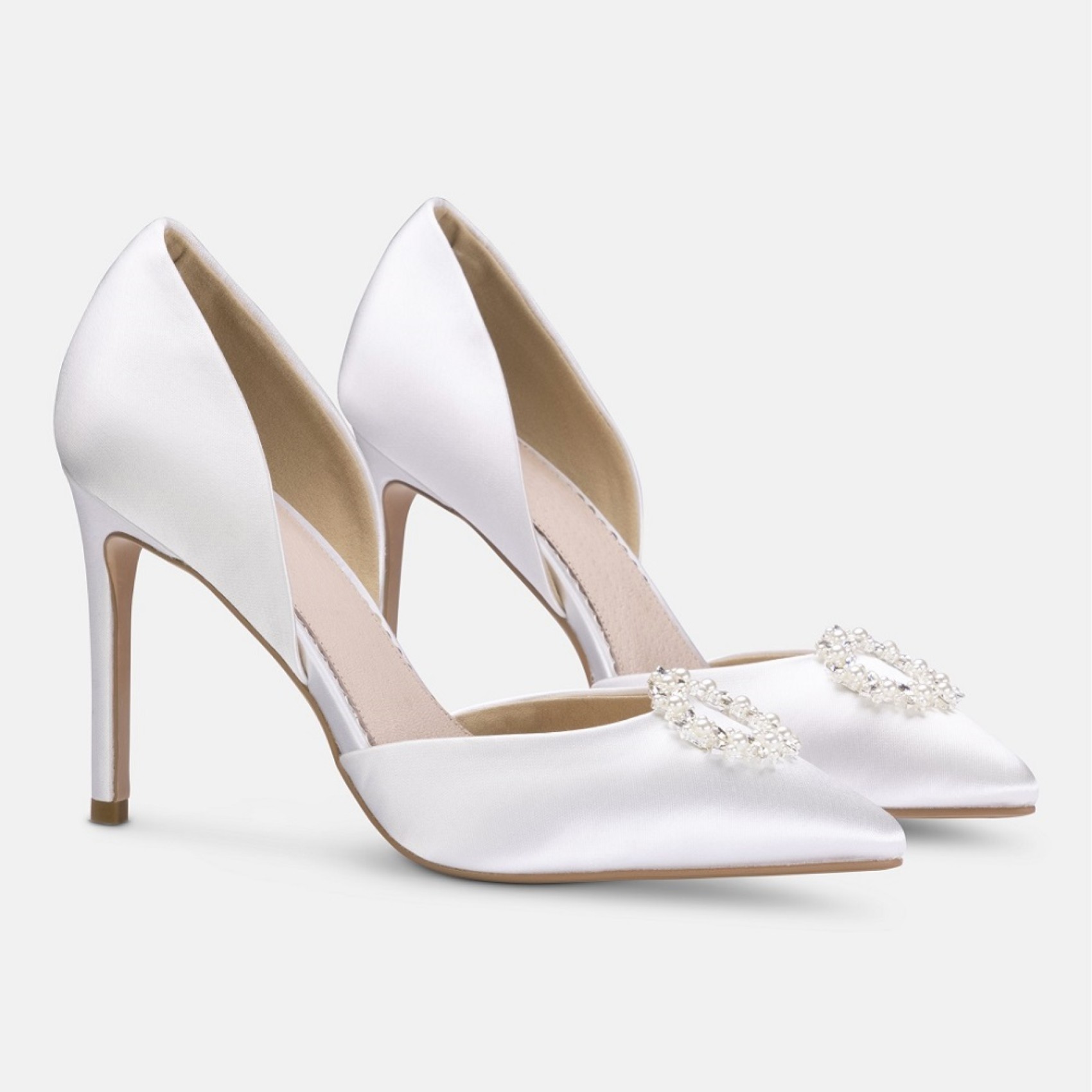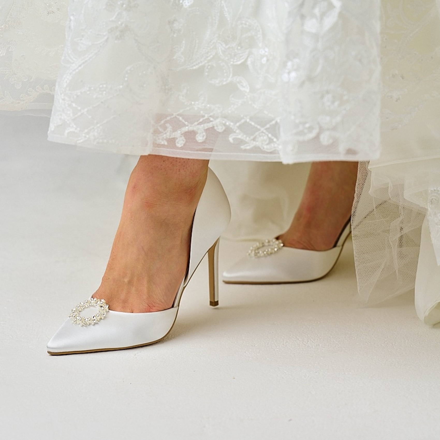Cet escarpin sexy et sophistiqué présente un élégant bout pointu orné d'une magnifique broche circulaire en perles et cristaux. Monté sur un talon aiguille, ce modèle est parfait pour les mariées modernes à la recherche d'une chaussure de mariage féminine.