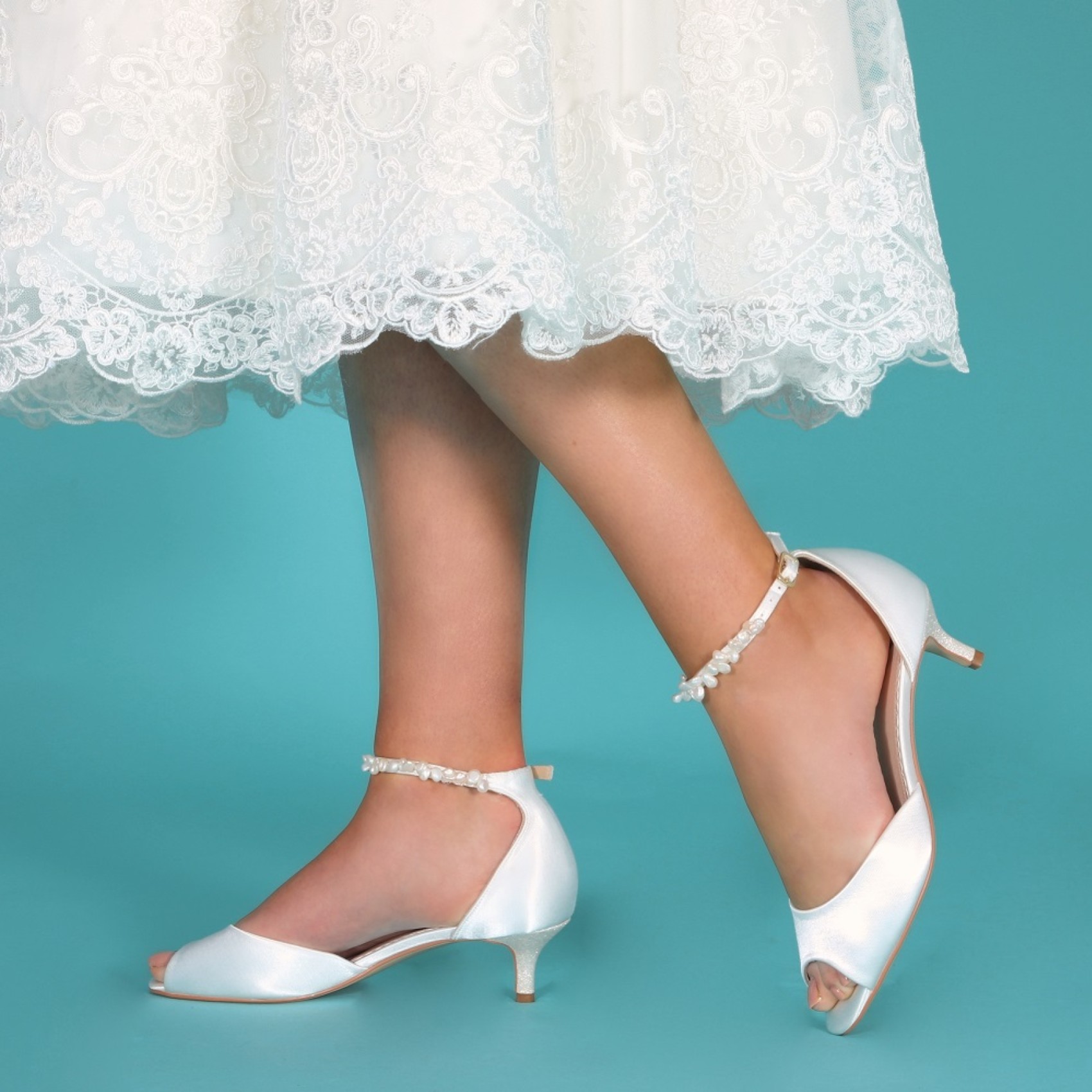Des perles de keshi lustrées ornent la lanière de nos sandales Amber, d'une élégance sans effort. Les perles de keshi brillent d'une iridescence incroyable parce qu'elles sont formées de nacre pure. Autrefois considérées comme un déchet, les perles de keshi sont un sous-produit de l'industrie perlière commerciale et sont aujourd'hui très prisées en tant que pierres précieuses en raison de leurs formes uniques et de leur magnifique éclat. Ces jolies chaussures peep toes sont dotées d'une bride de sécurité qui leur confère une allure subtile. Fabriquées en satin ivoire teintable, elles sont dotées d'un joli petit talon et d'une semelle intérieure en cuir matelassé pour plus de confort. Un style magnifique pour un mariage romantique à destination.