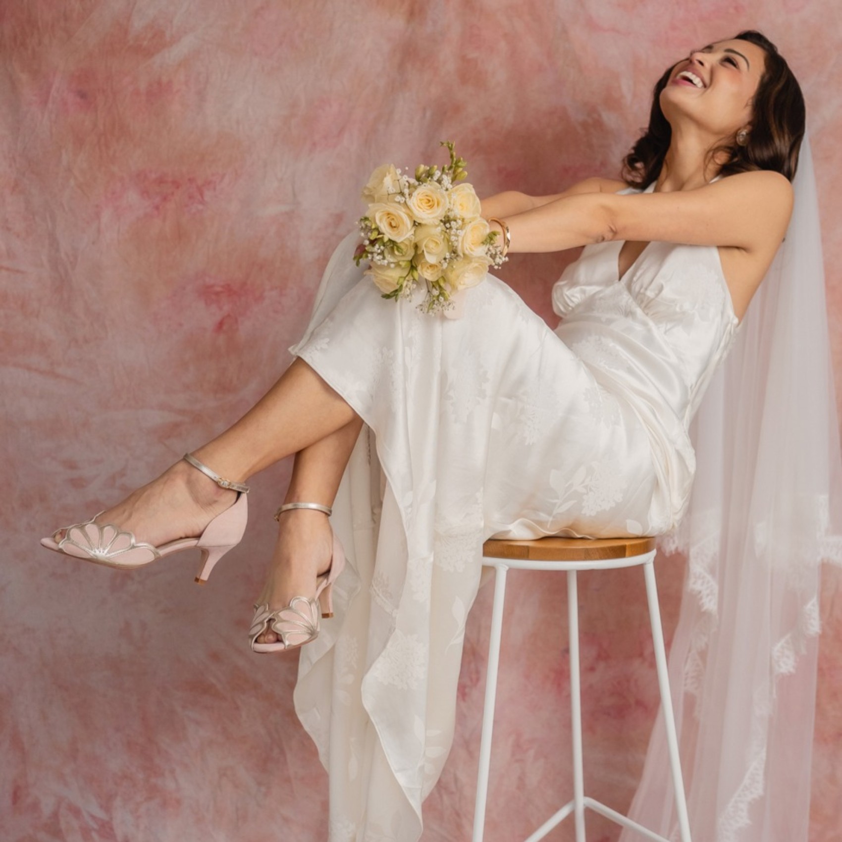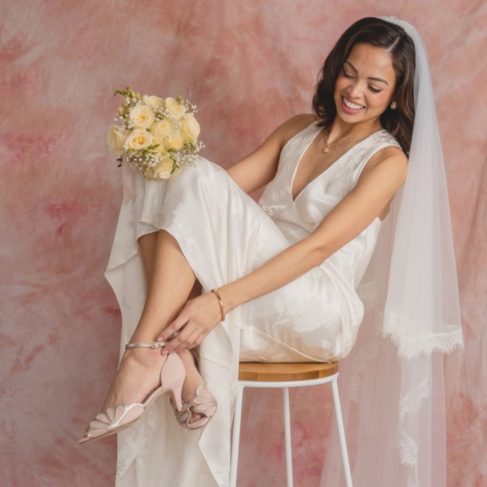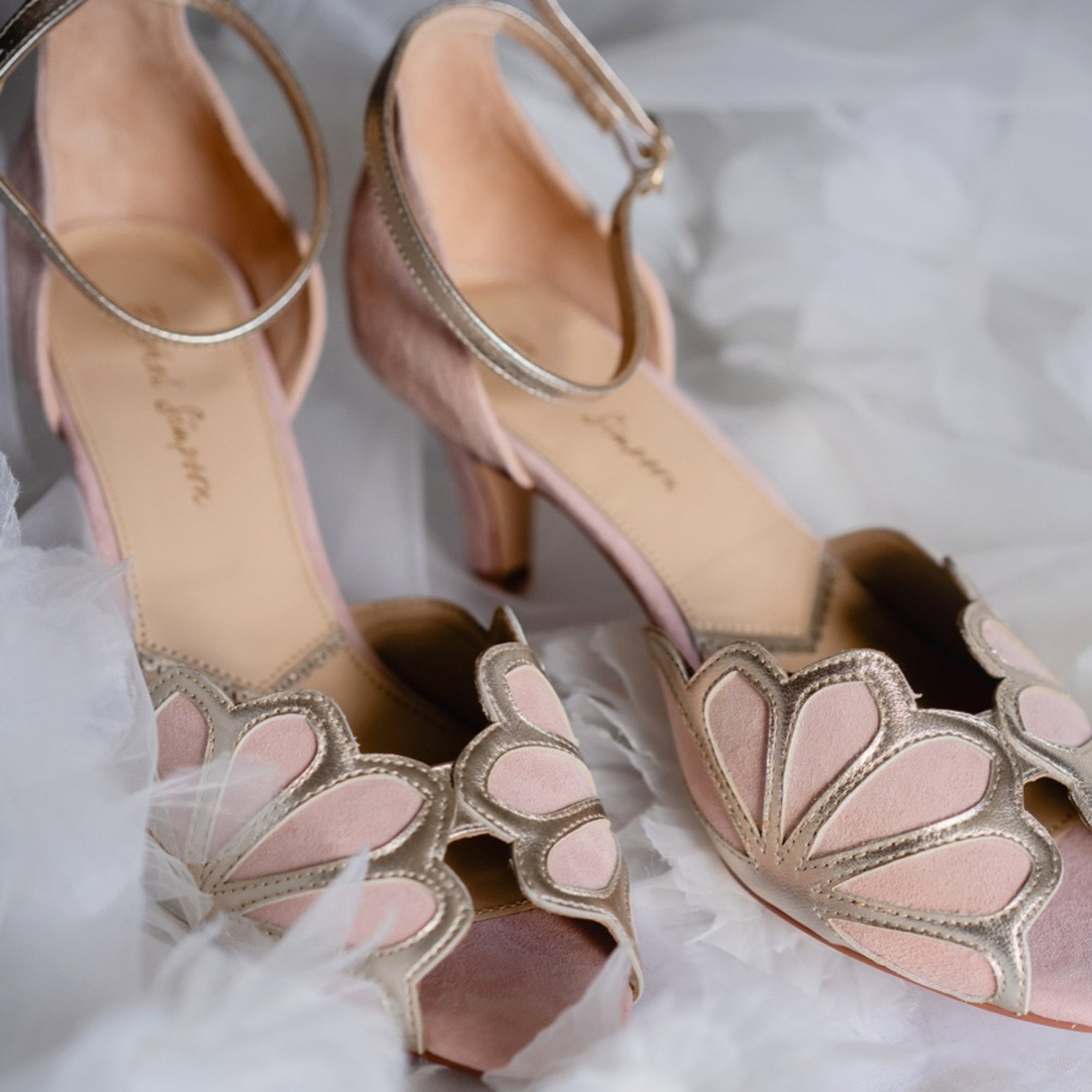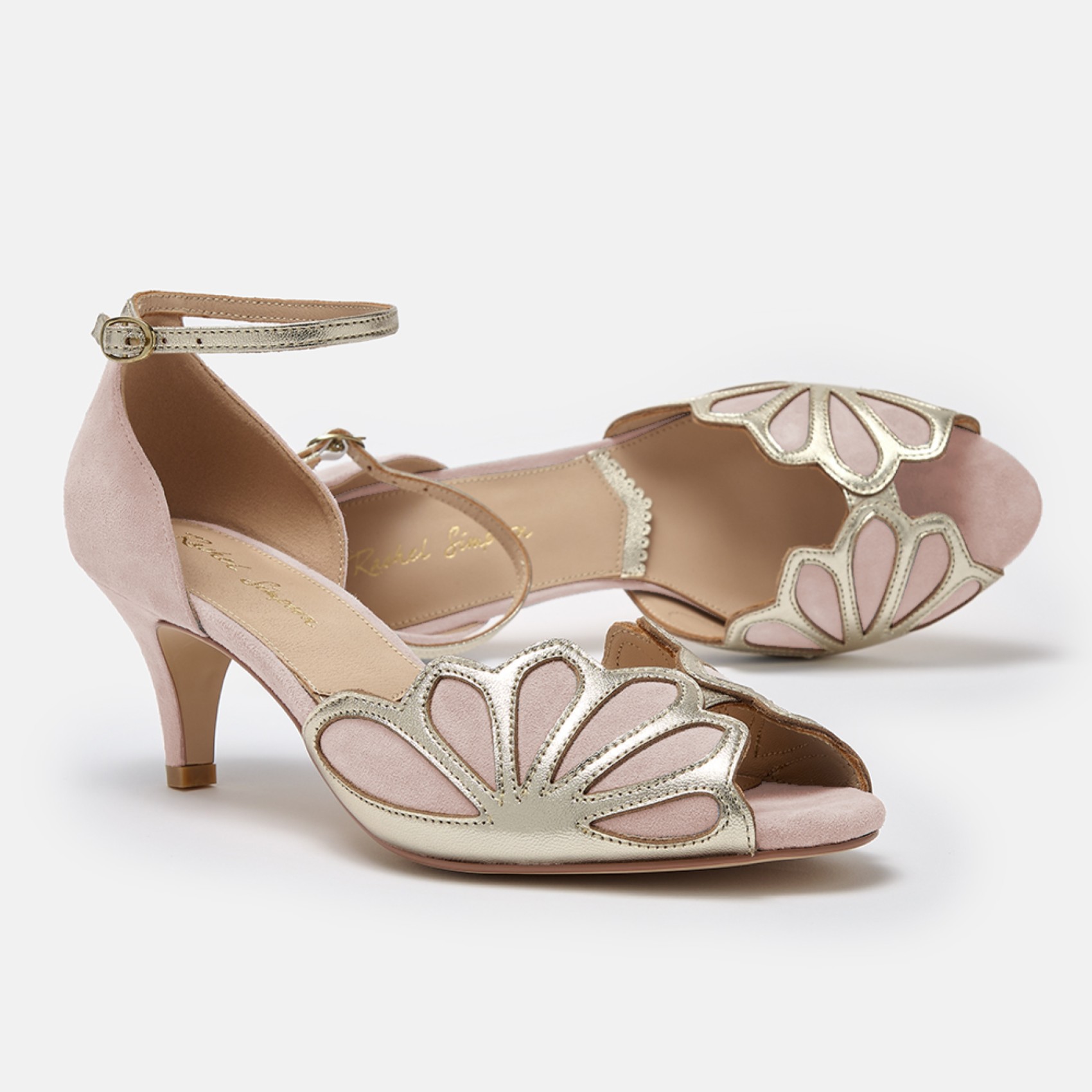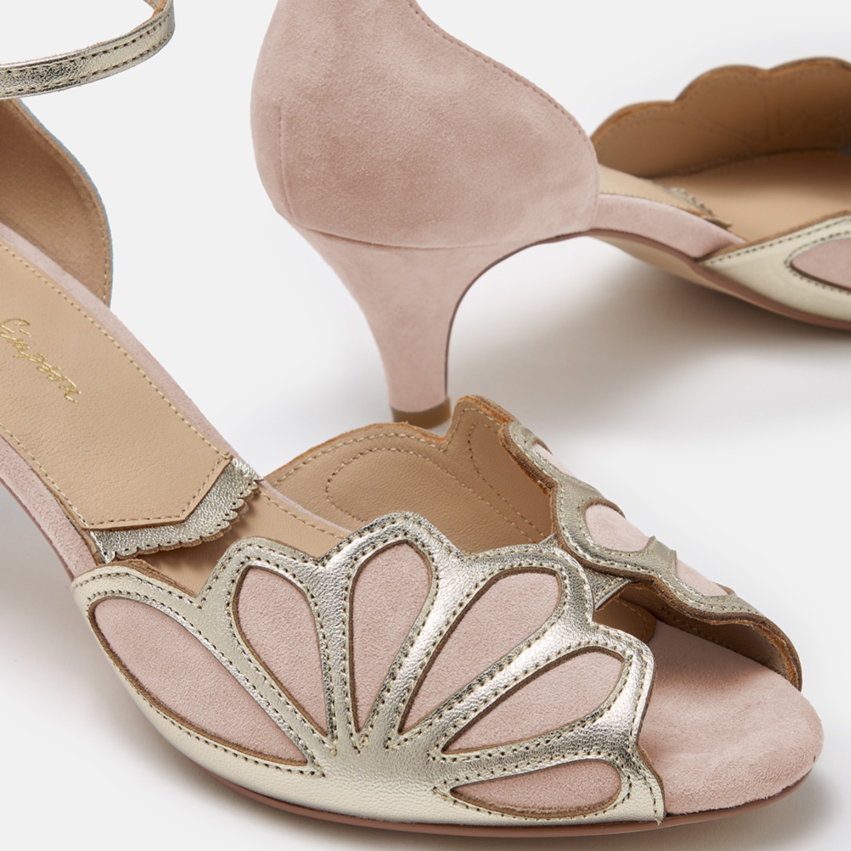 Isadora se compose de deux motifs classiques d'éventail art déco, qui enveloppent élégamment l'avant du pied et sont reliés au centre par une lanière métallique dorée. Le joli daim rose poudré est la couleur idéale pour les robes aux tons rose chair, et les détails en or métallique créent un magnifique contraste. Porter les Isadora, c'est presque comme être pieds nus, tellement elles sont incroyablement confortables ! Elles sont dotées d'un joli petit talon de 6 cm et sont très sûres grâce à la bride de cheville.