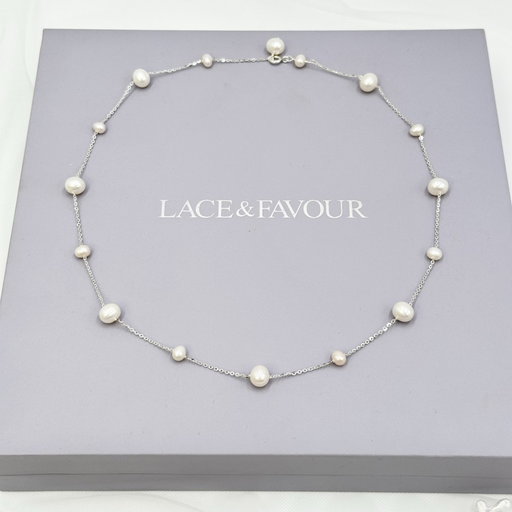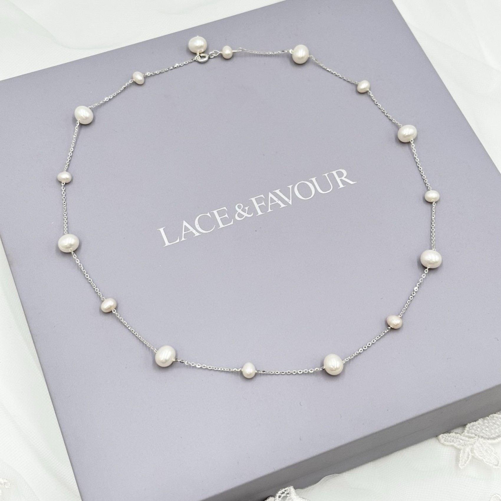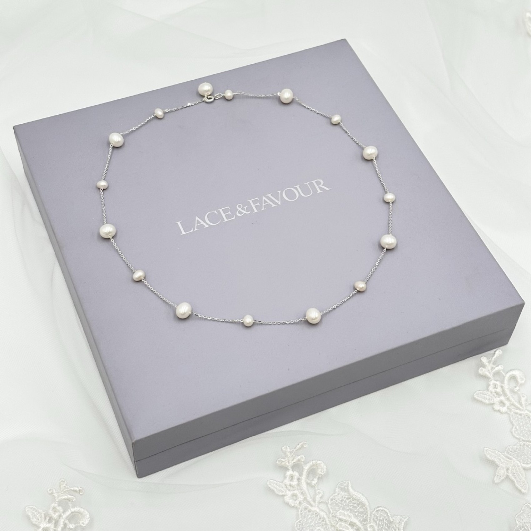 De délicates perles d'eau douce reliées par des chaînes en argent constituent le collier de mariage le plus délicat qui soit. Un beau cadeau pour une mariée ou une demoiselle d'honneur à porter le jour du mariage, mais aussi un magnifique bijou à porter tous les jours !