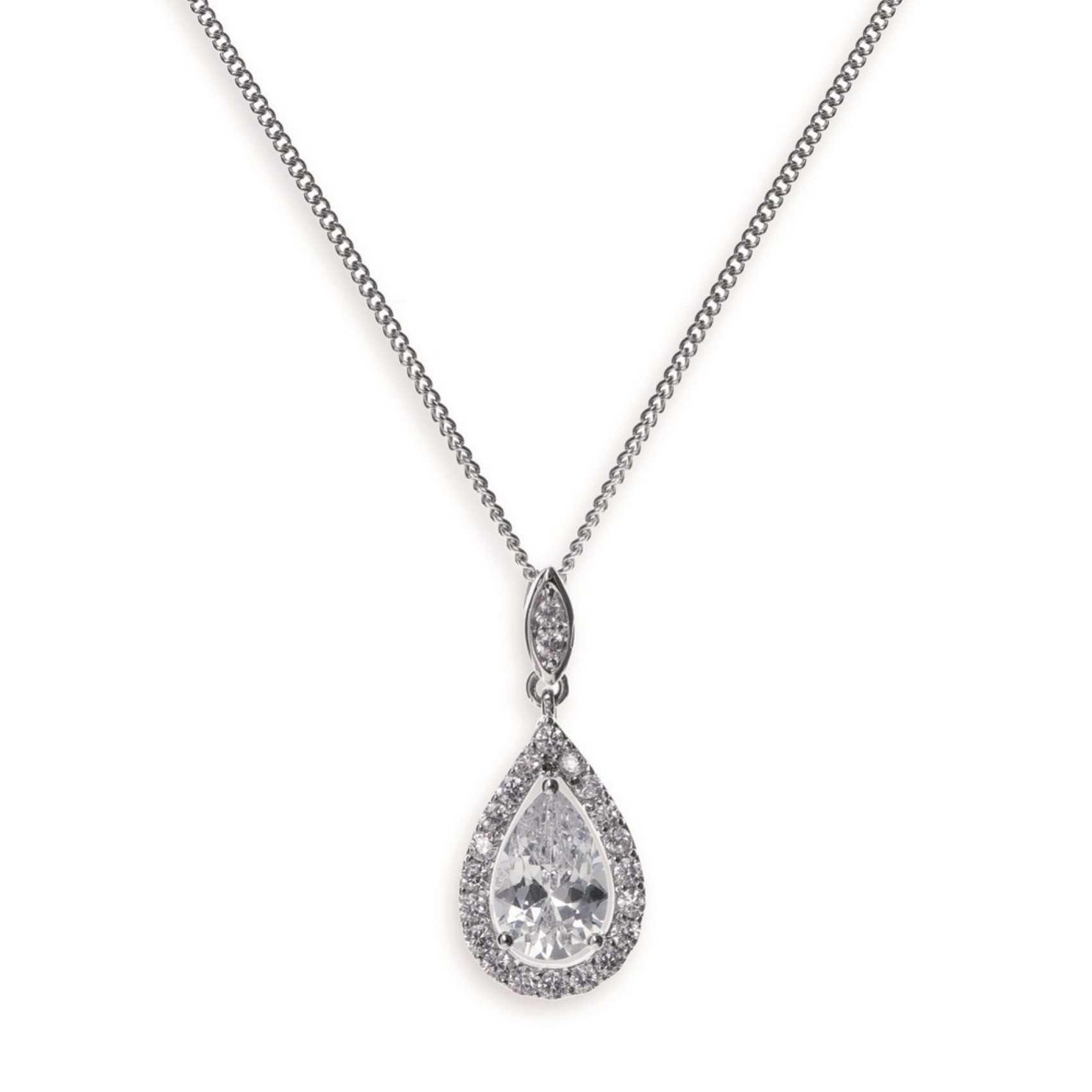 Cet élégant collier à pendentif en cristal en forme de goutte d'eau présente une pierre en forme de goutte d'eau scintillante entourée de minuscules cristaux pavés scintillants pour une brillance élégante. Cette pièce passe-partout est un ajout intemporel à la tenue de la mariée et est également très appréciée des demoiselles d'honneur. Complétez votre look avec les boucles d'oreilles en cristal assorties.