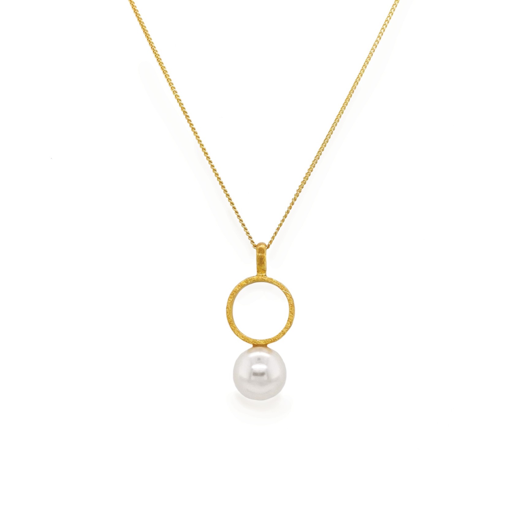 Pendentif en forme de cercle, de style contemporain et chic, signé Sarah Alexander. D'une simplicité étonnante, ce collier intemporel est serti de vermeil plaqué or 14ct sur de l'argent sterling 925 avec une finition à effet brossé. Avec ses perles lustrées en ivoire naturel, ce pendentif en or est un choix élégant pour les mariées et les demoiselles d'honneur.