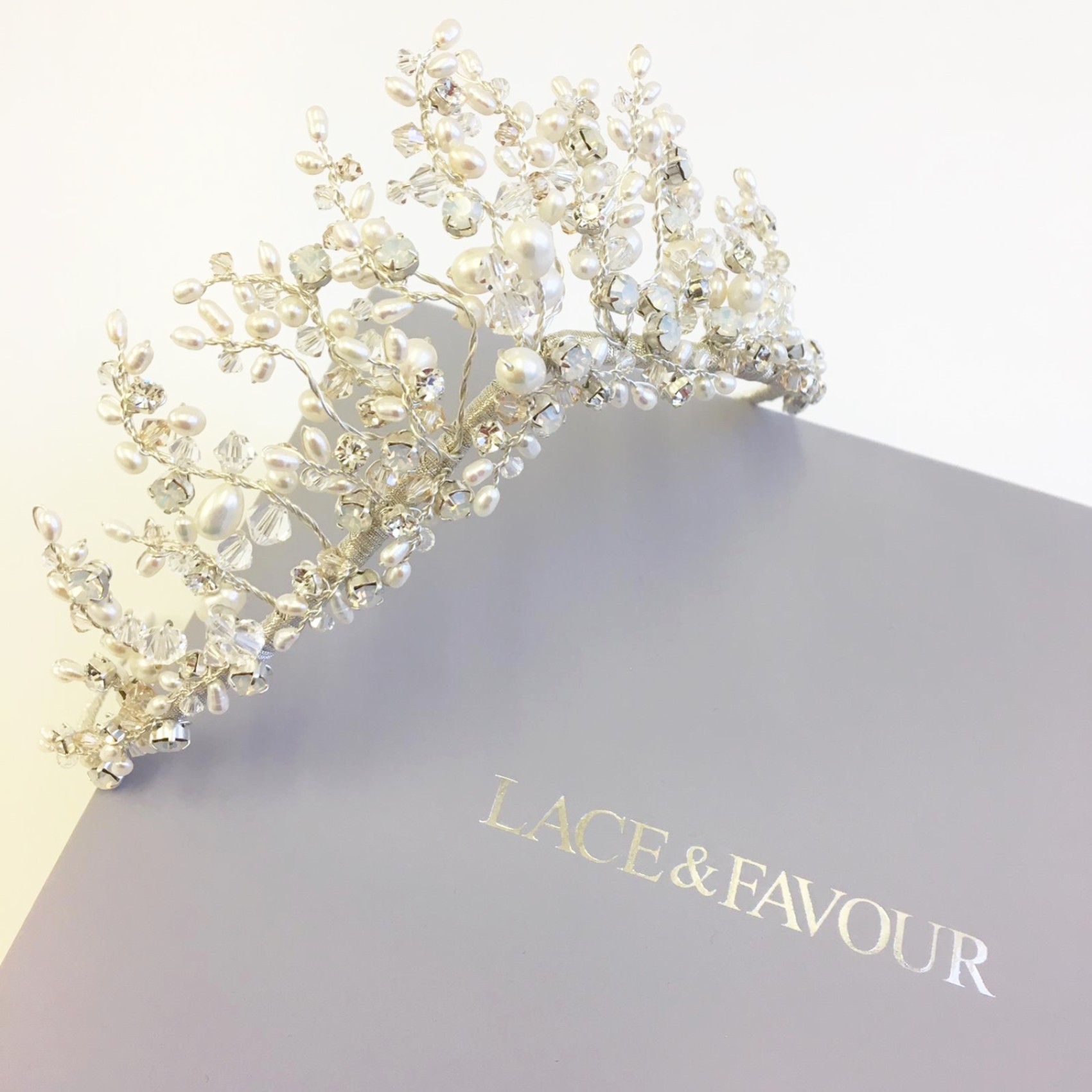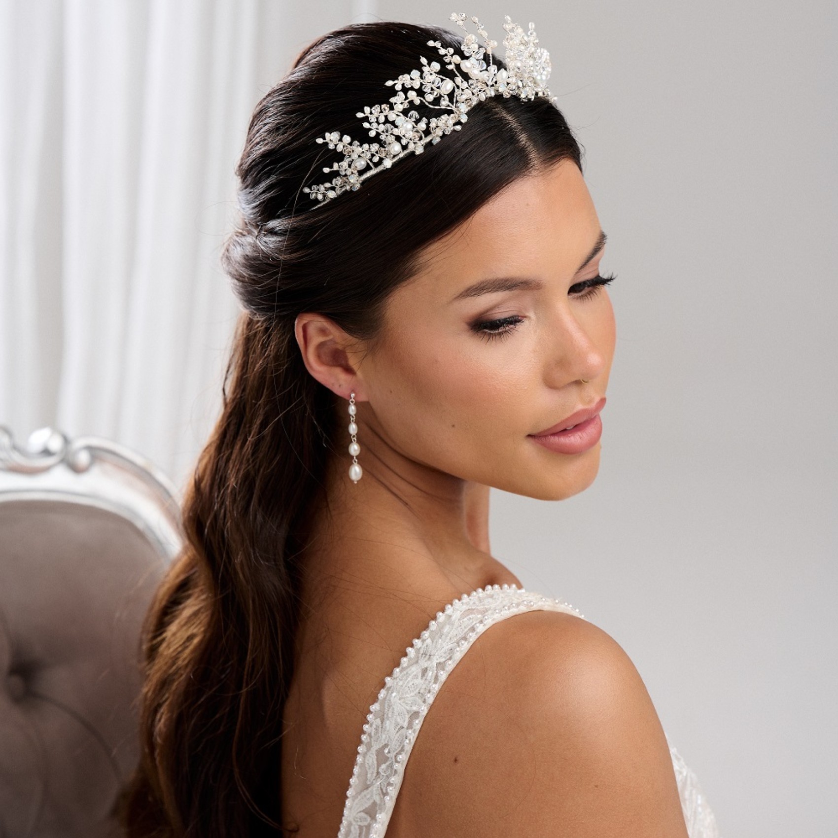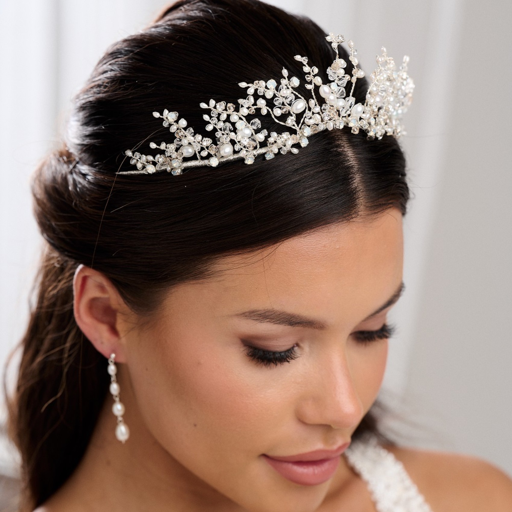 De délicates vignes de perles d'eau douce ivoire et des cristaux opales scintillants composent notre diadème Anastacia. Le diadème est orné d'un ruban argenté qui permet de le porter confortablement tout au long de la journée. Faites de cette coiffe de mariage chatoyante le couronnement de votre ensemble. Nous adorons l'éclat des cristaux opalins associés aux perles d'eau douce lumineuses. Également disponible en or sur demande.