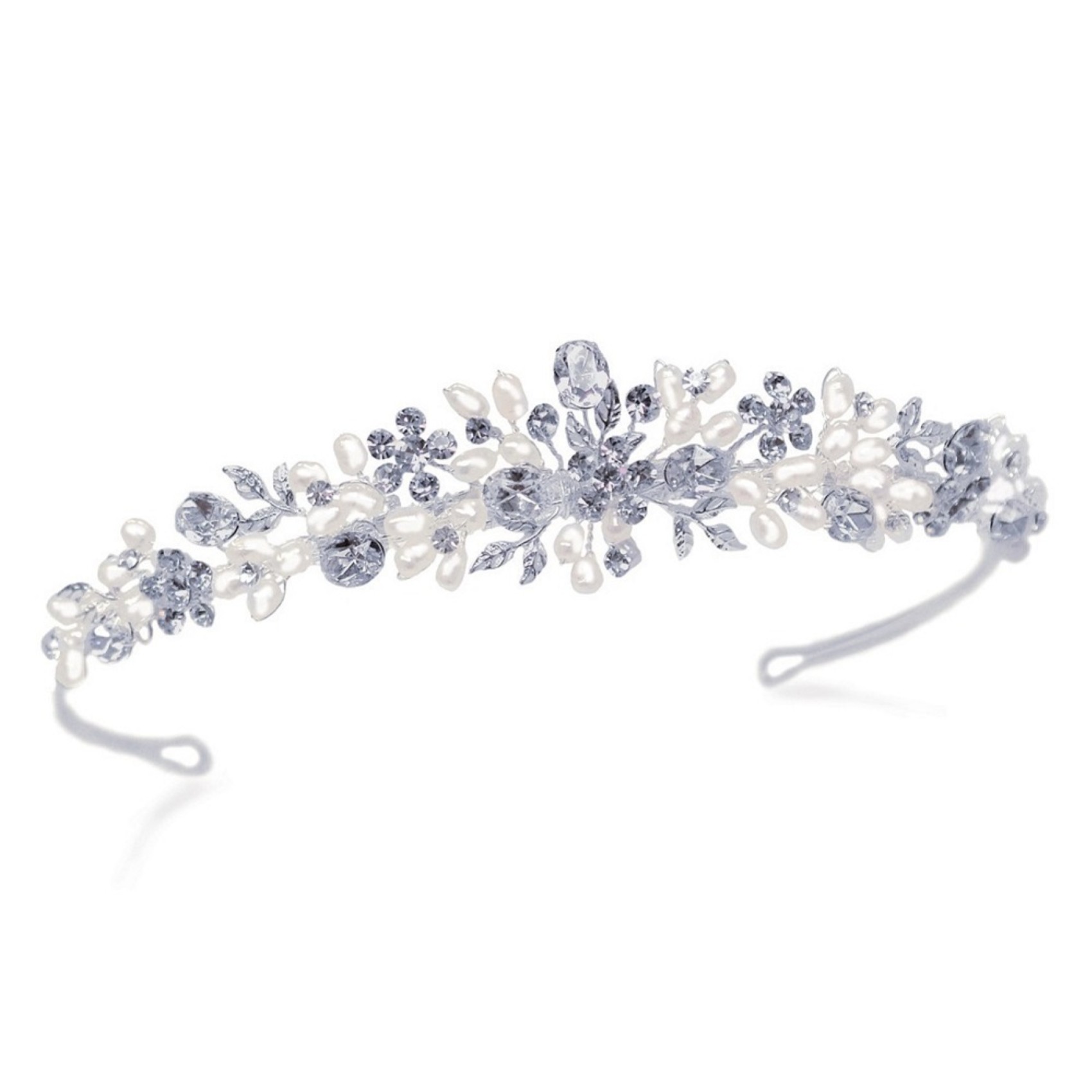 Melody est un magnifique diadème de mariage d'inspiration florale, créé à partir de cristaux solitaires scintillants et de perles d'eau douce, nichés parmi de délicates feuilles d'argent et rehaussés de grandes pierres ovales taillées. Un diadème très délicat et très joli qui s'harmonise parfaitement avec les robes ornées de broderies florales.